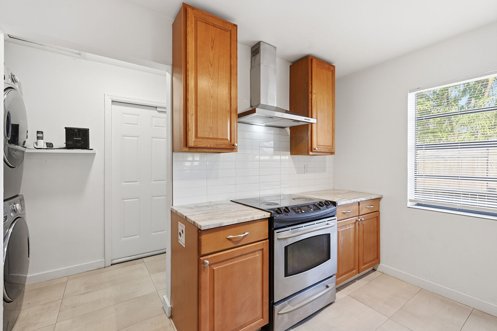 Baseboards Wall, Drywall, Laundry, Medium Brown Cabinets, Natural Light, Raised Cabinets, Stone Countertops, Tile Floor, Vent, Washer Dryer, Laundry, Tile Floor