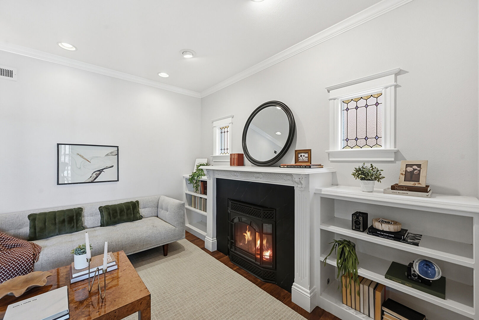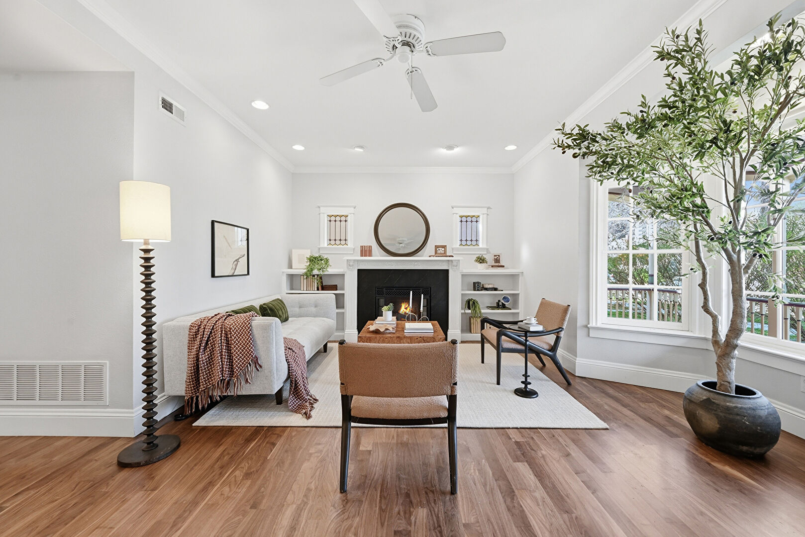 Baseboards Wall, Ceiling Fan, Crown Molding, Drywall, Fireplace, Natural Light, Recessed Lighting, Vent, Wood Finish Floor, Crown Molding, Drywall, Wood Finish Floor