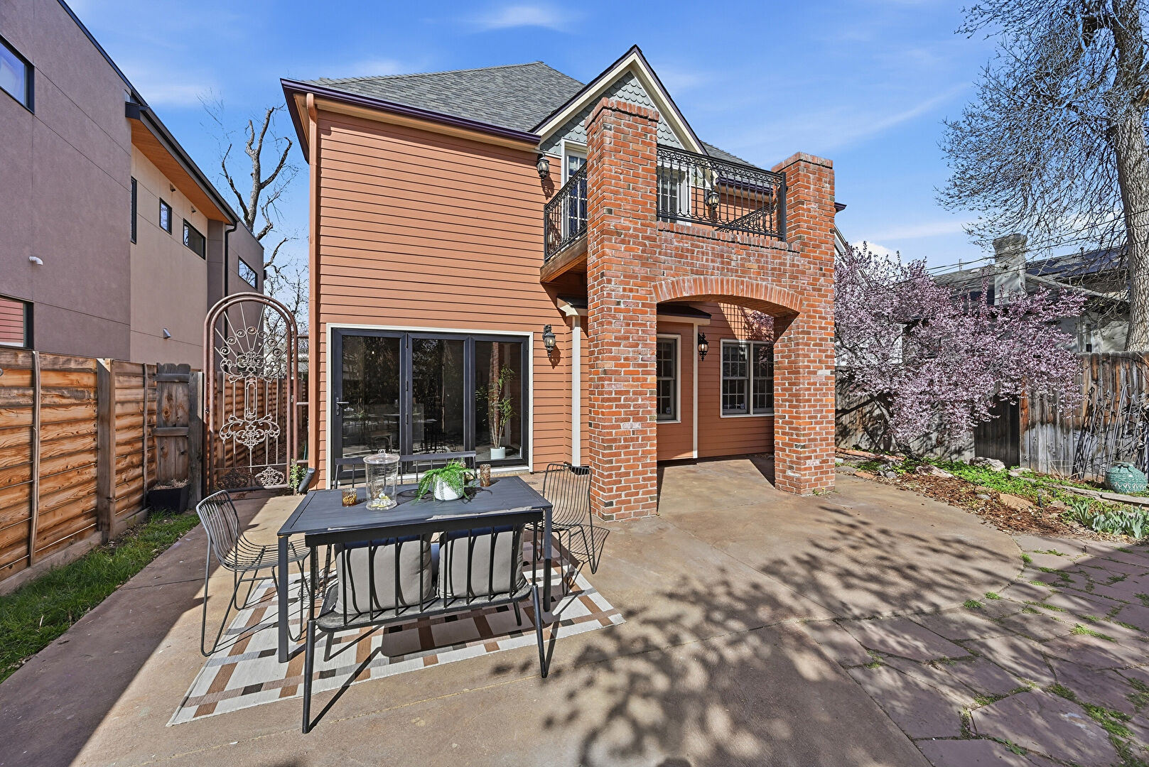 Balcony, Downspout, Fence, Gutters, Horizontal Siding, Outdoor Dining Area, Shingle Roof, Patio
