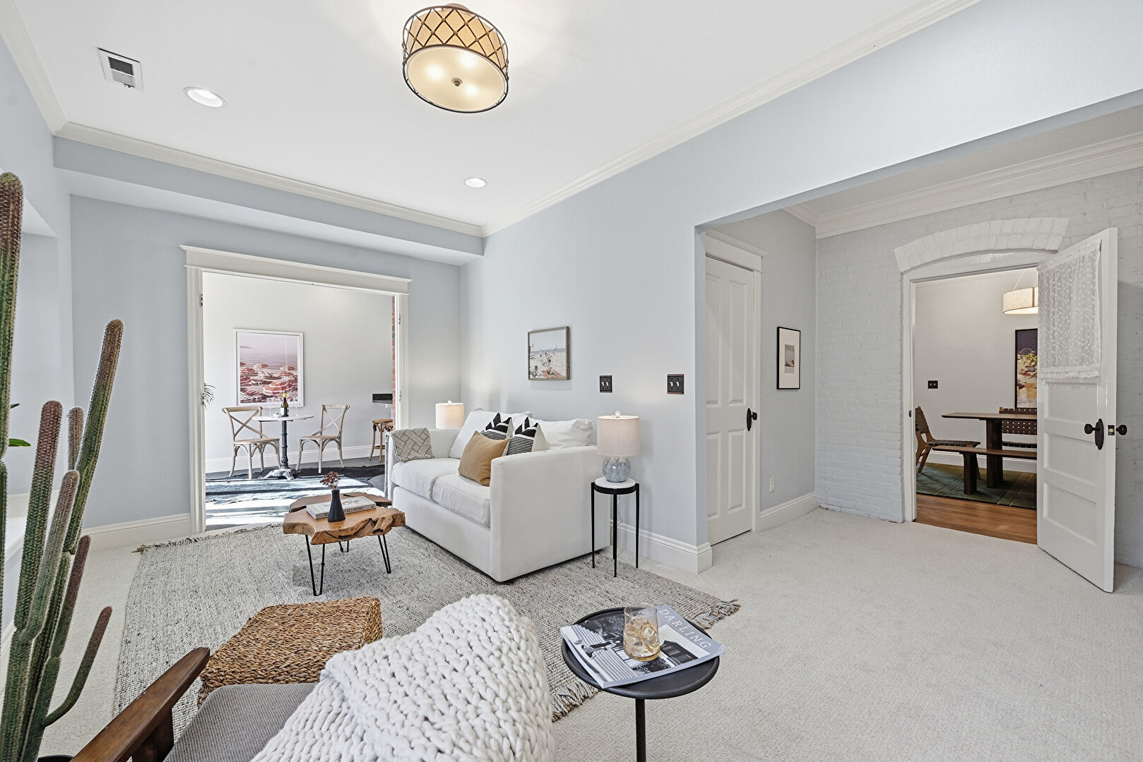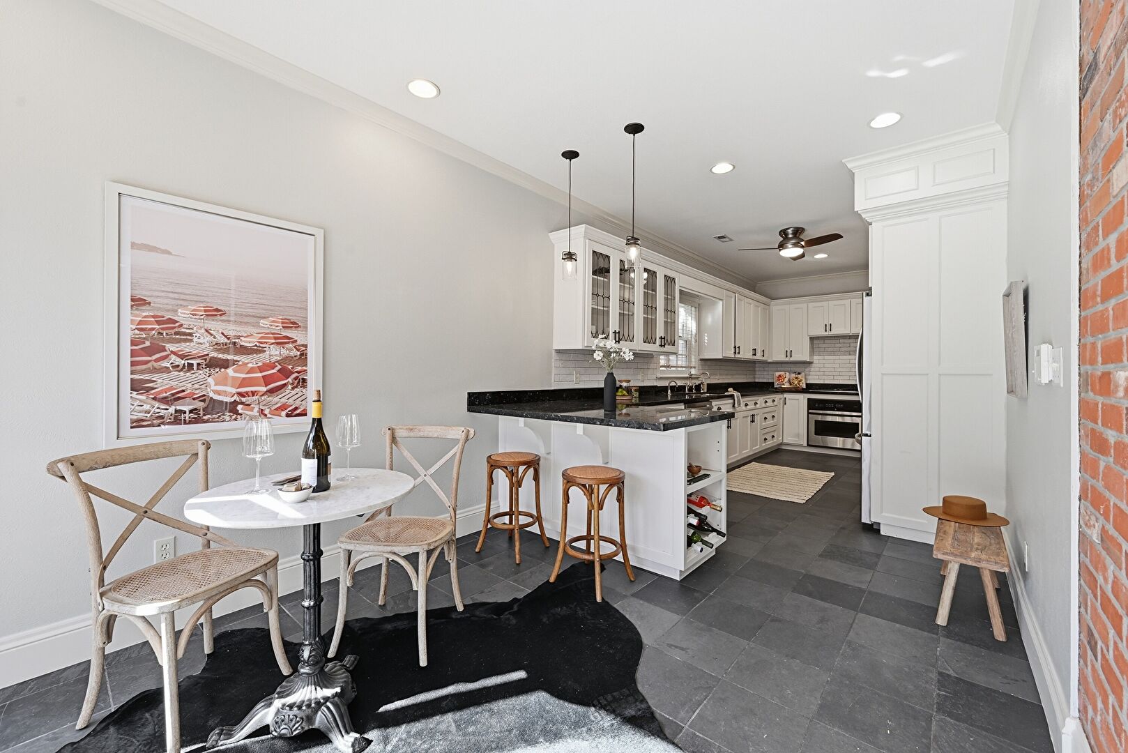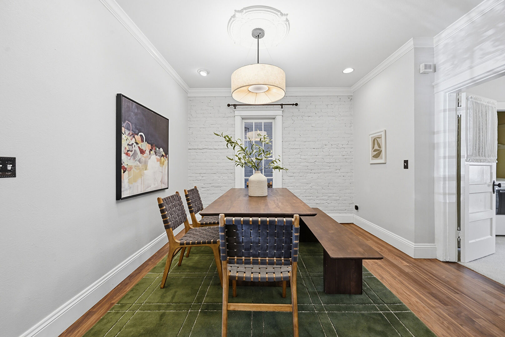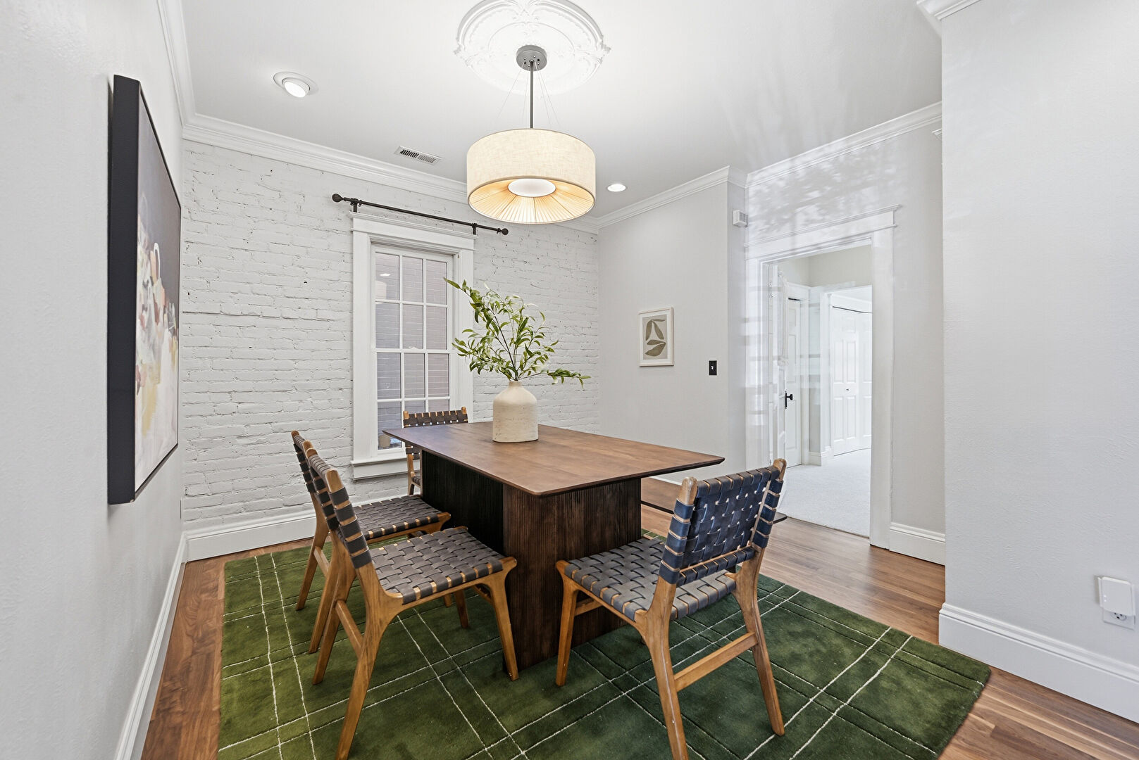 Accent Wall, Baseboards Wall, Brick Wall, Crown Molding, Drywall, Recessed Lighting, Vent, Wood Finish Floor, Ceiling Fan, Drywall, Wood Finish Floor