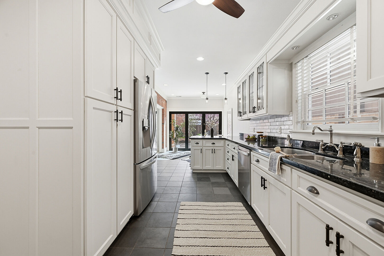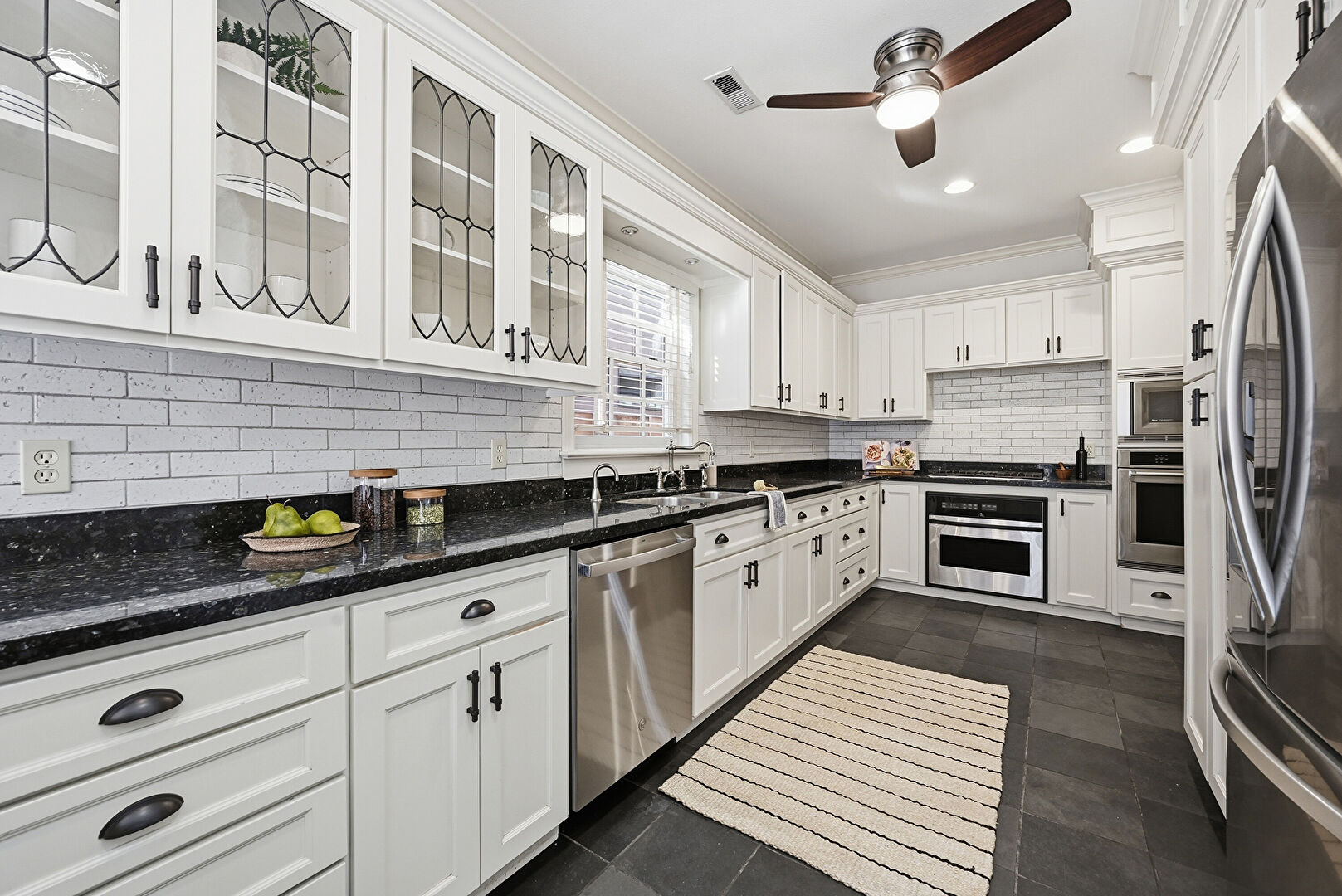 Baseboards Wall, Ceiling Fan, Crown Molding, Crown Molding Cabinets, Drywall, Glass Insert Cabinets, Kitchen Bar, Kitchen Peninsula, Natural Light, Open Shelves, Pendant Lighting, Recessed Lighting, Shaker Cabinets, Stone Countertops, Tile Floor, Vent, Vinyl Floor, Baseboards Wall, Kitchen Peninsula, Natural Light, Shaker Cabinets