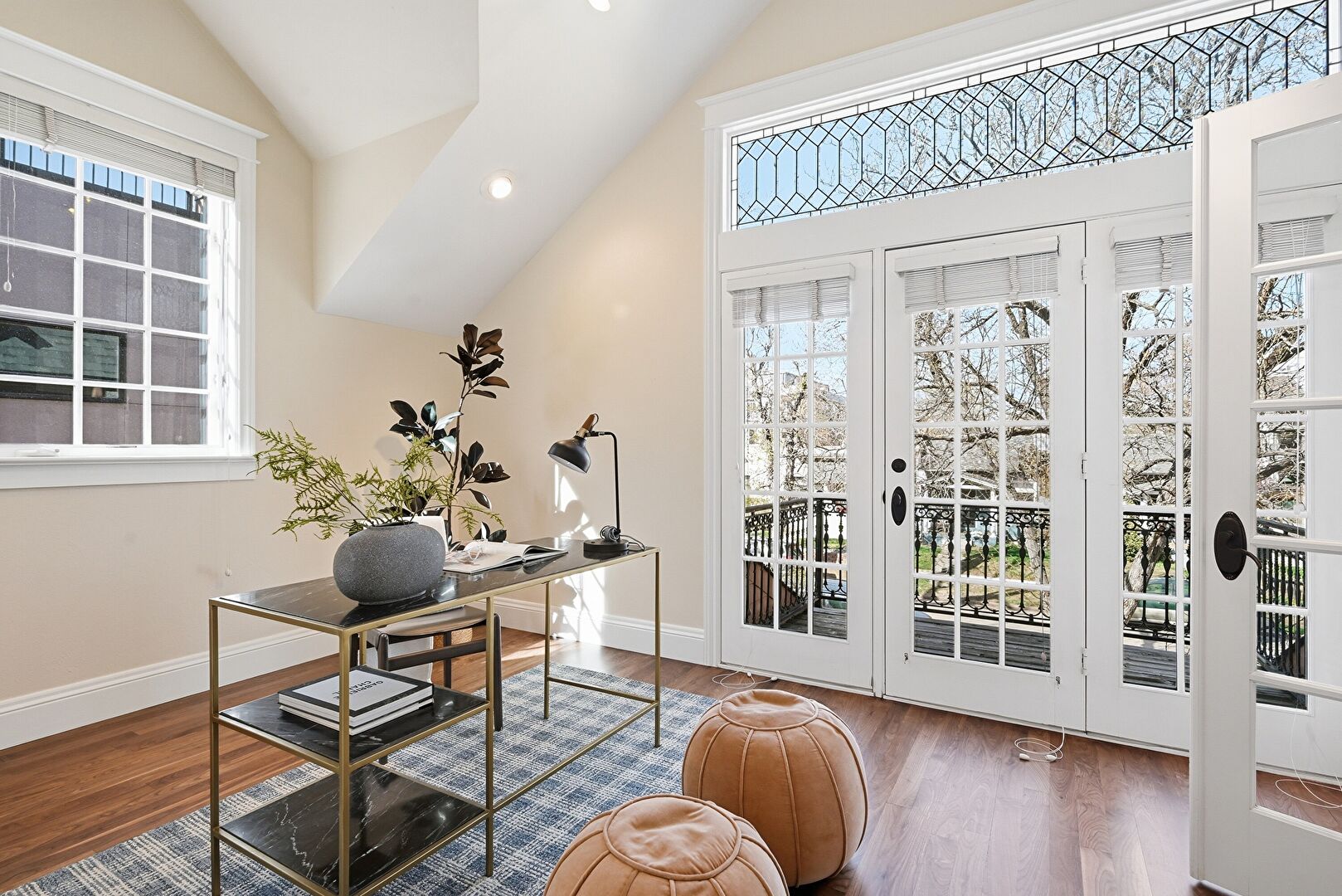 Baseboards Wall, Ceiling Fan, Drywall, French Doors, High Ceiling, Natural Light, Office Area, Recessed Lighting, Track Lighting, Vaulted Ceiling, Vent, Wood Finish Floor, Baseboards Wall, French Doors, Vaulted Ceiling