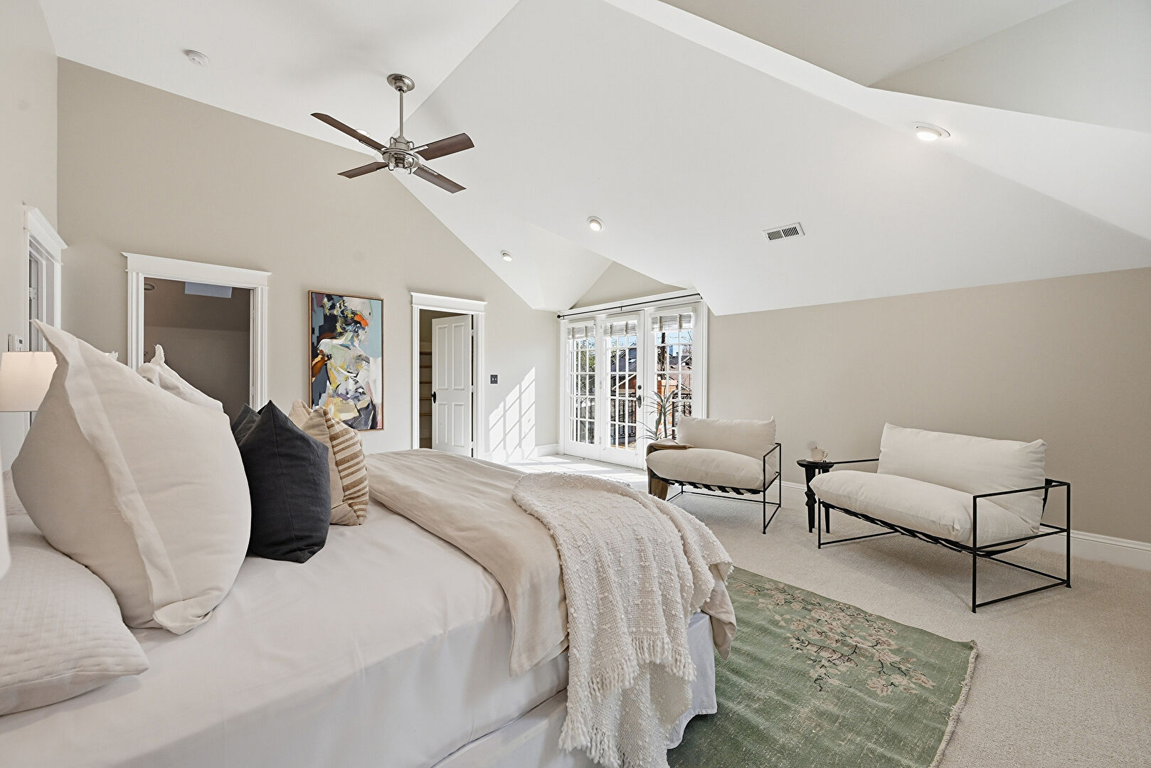 Access To Exterior, Baseboards Wall, Bonus Room, Carpet, Cathedral Ceiling, Ceiling Fan, Drywall, French Doors, High Ceiling, Natural Light, Recessed Lighting, Vaulted Ceiling, Vent, Drywall, Natural Light