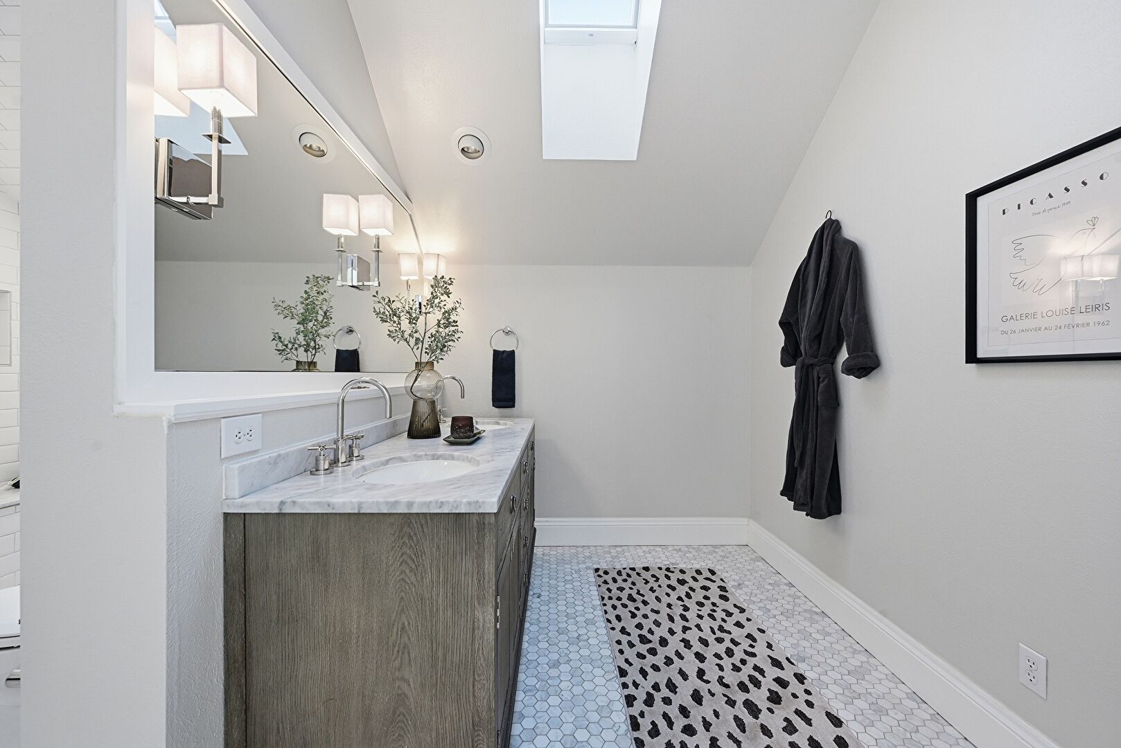 Baseboards Wall, Double Vanity, Drywall, Skylight, Textured Wall, Tile Floor, Vaulted Ceiling, Full Bathroom