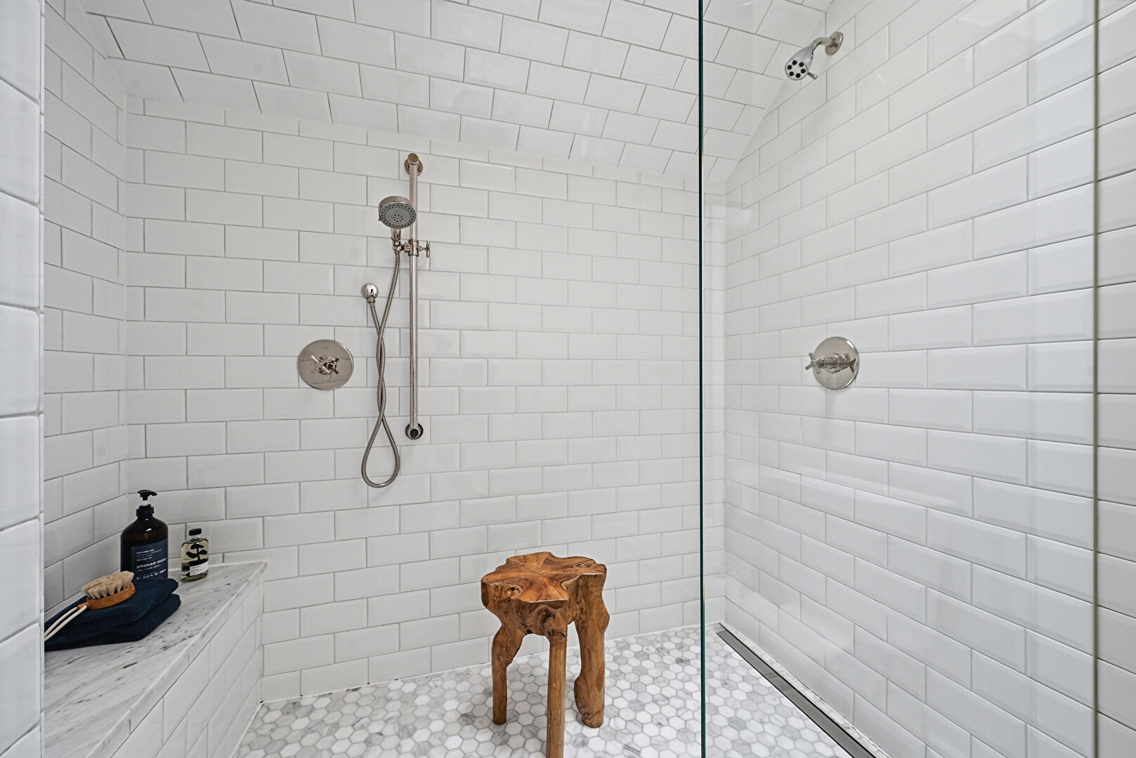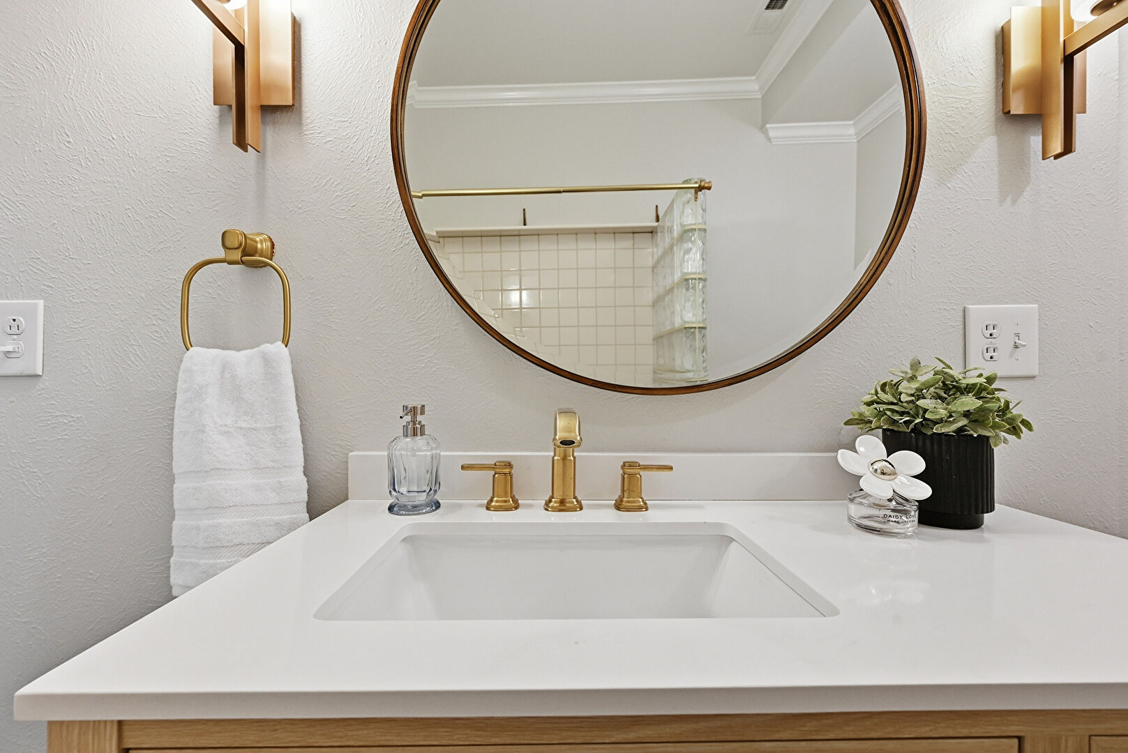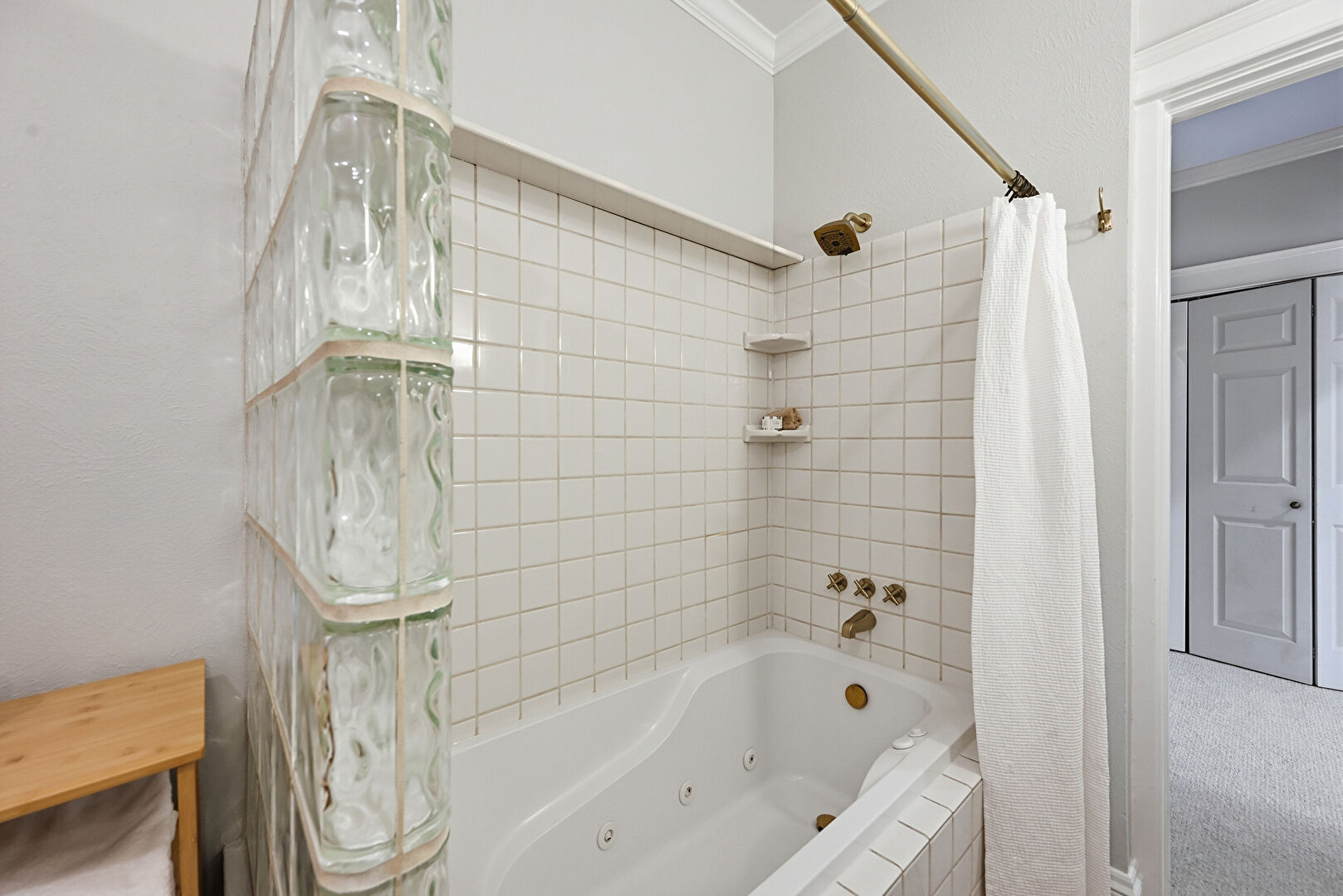 Baseboards Wall, Combined Bath Shower, Crown Molding, Drywall, Full Bathroom, Tile Floor, Vanity, Vent, Vanity, Vaulted Ceiling