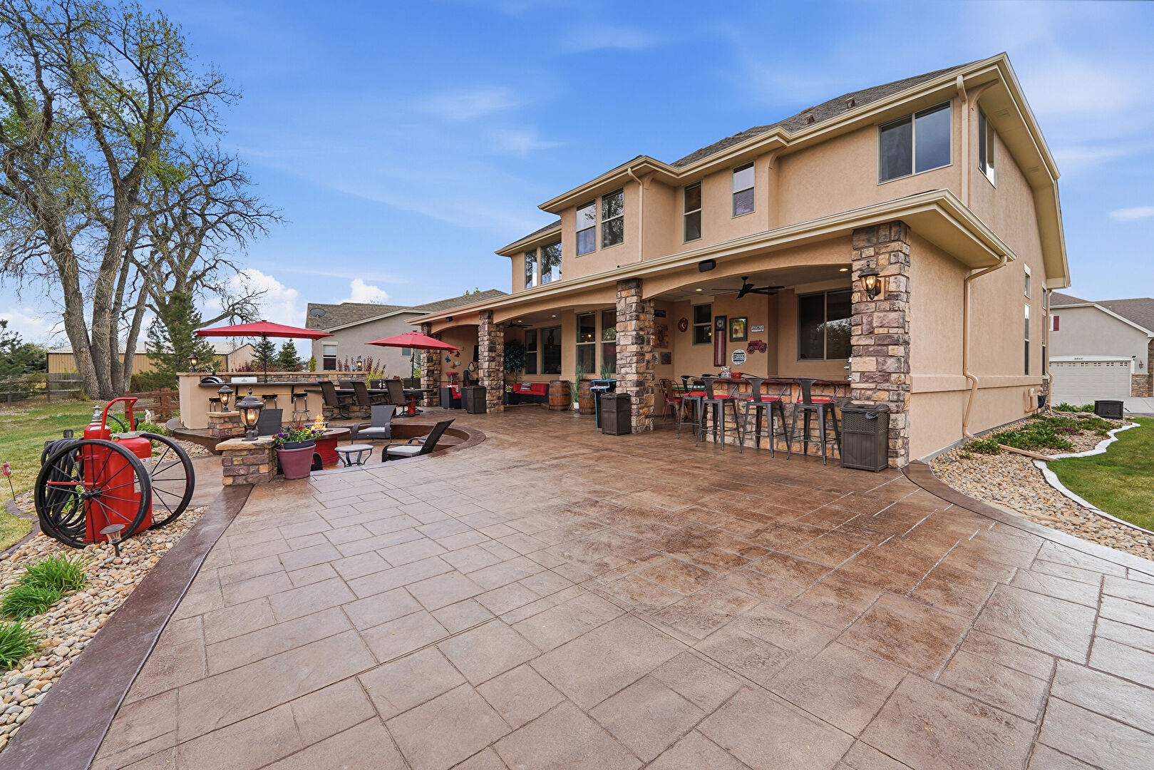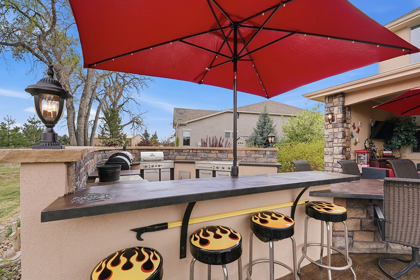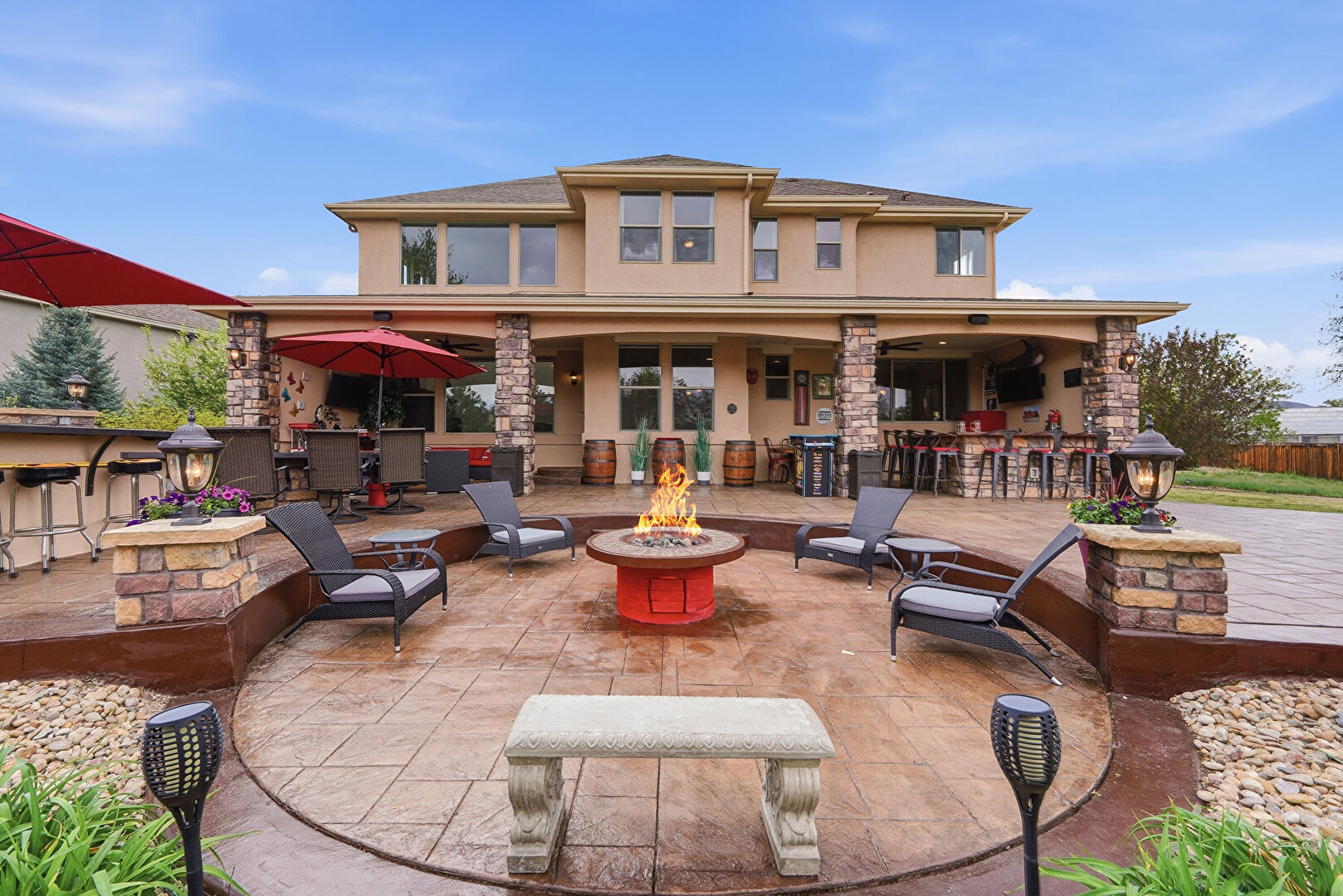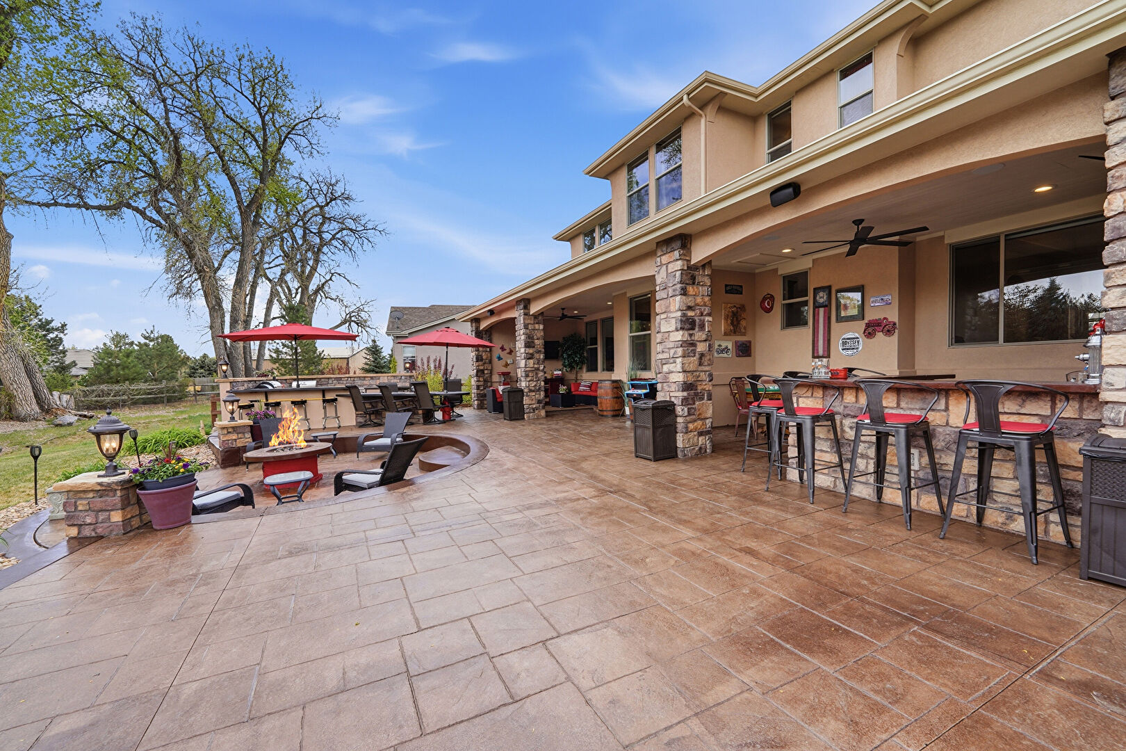 Ceiling Fan, Downspout, Fence, Fire Pit, Gazebo, Gutters, Lawn, Outdoor Bar, Outdoor Kitchen, Patio, Stone Siding, Stucco Siding, Downspout, Lawn, Stucco Siding