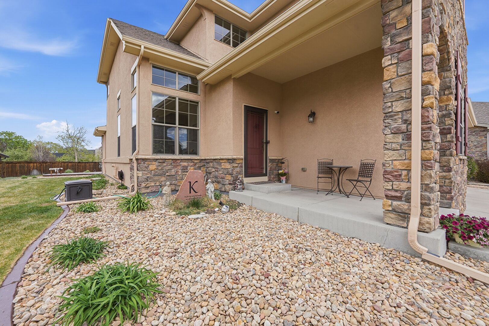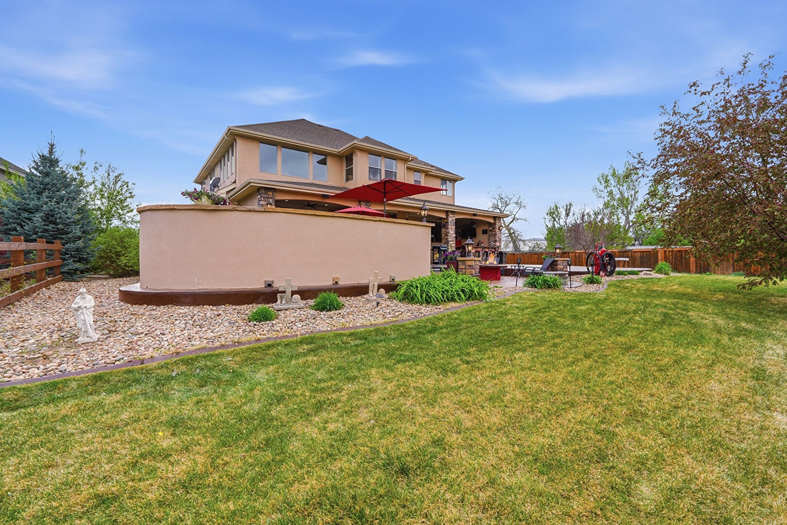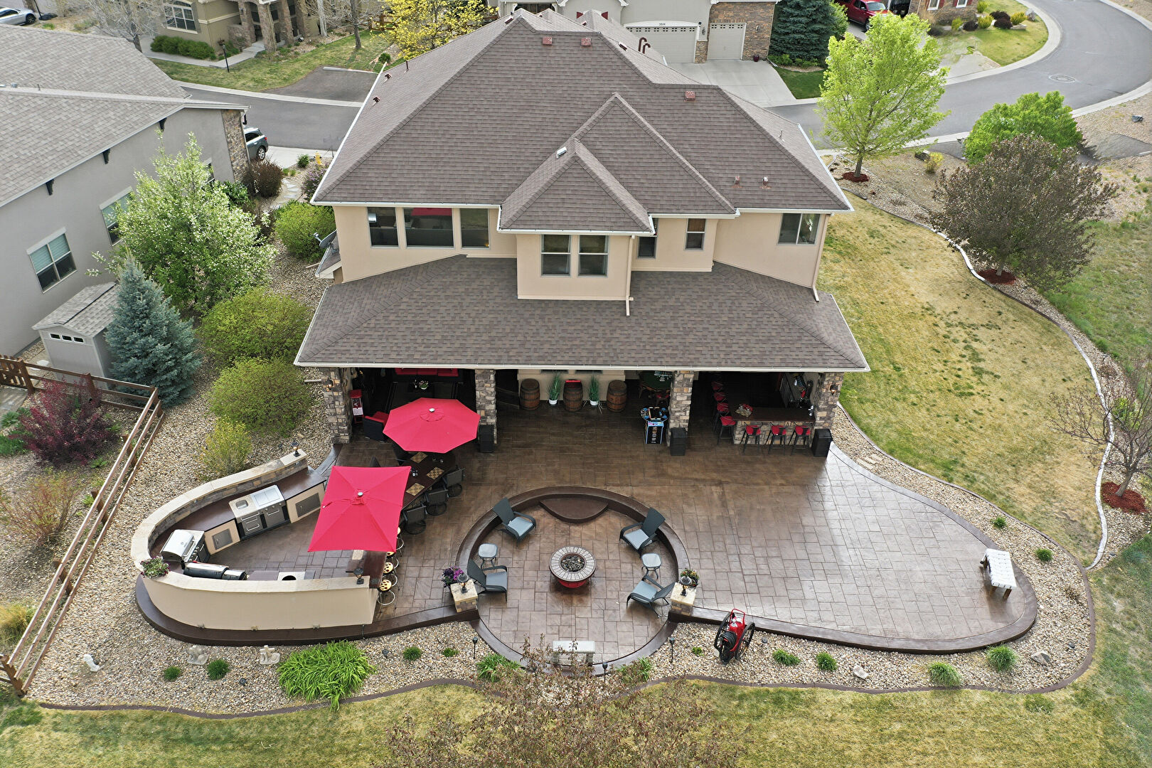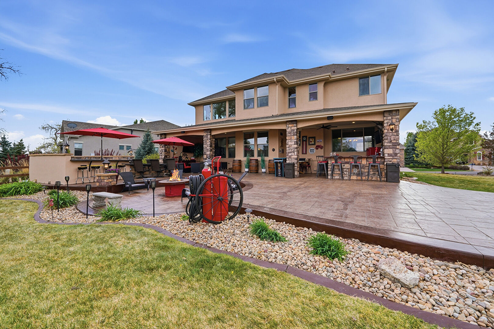 Ceiling Fan, Downspout, Fence, Fire Pit, Gazebo, Gutters, Lawn, Outdoor Bar, Outdoor Kitchen, Patio, Stone Siding, Stucco Siding, Downspout, Lawn, Stucco Siding