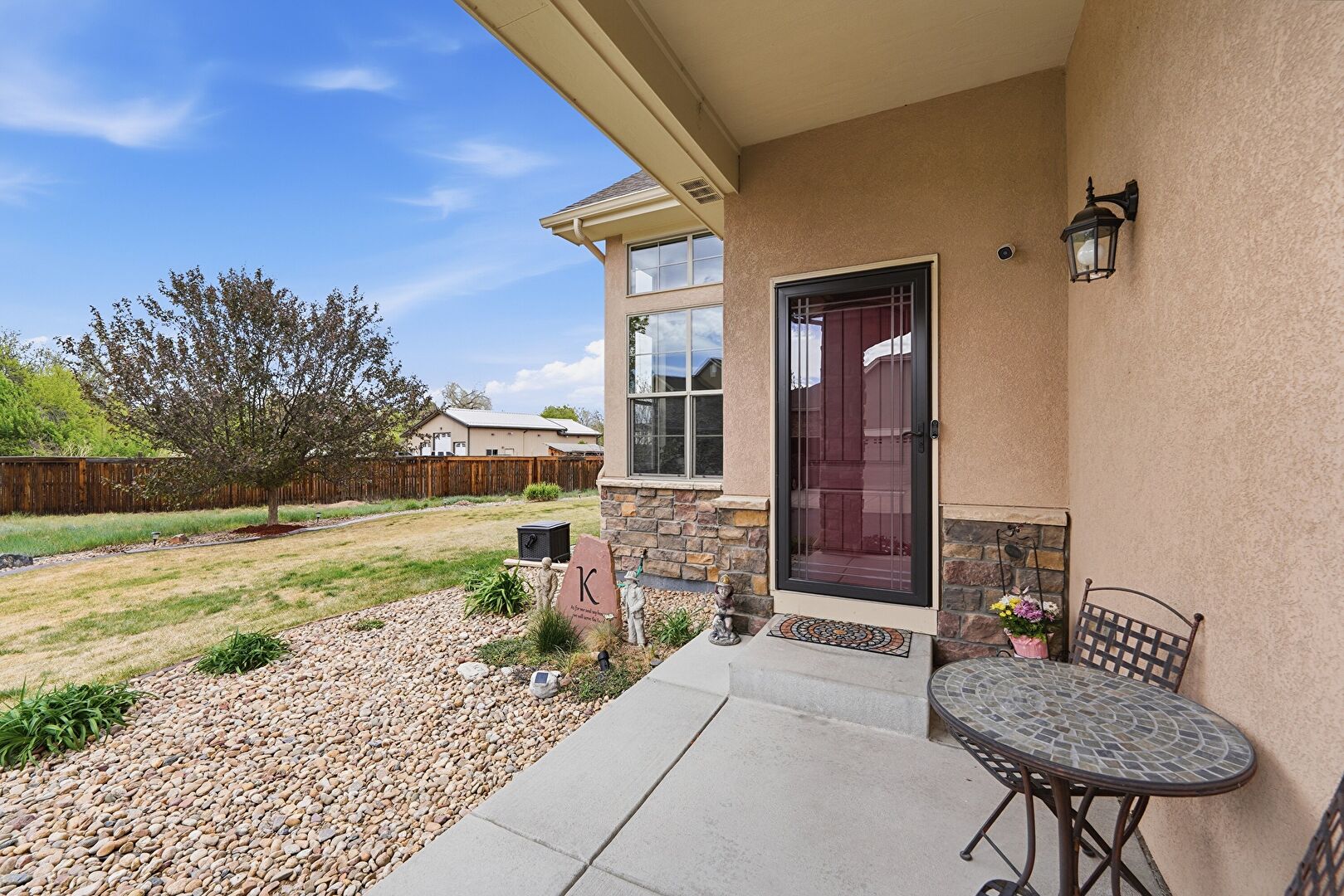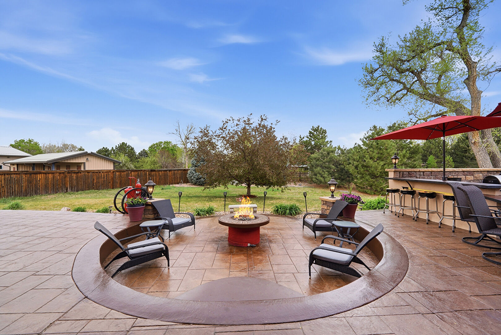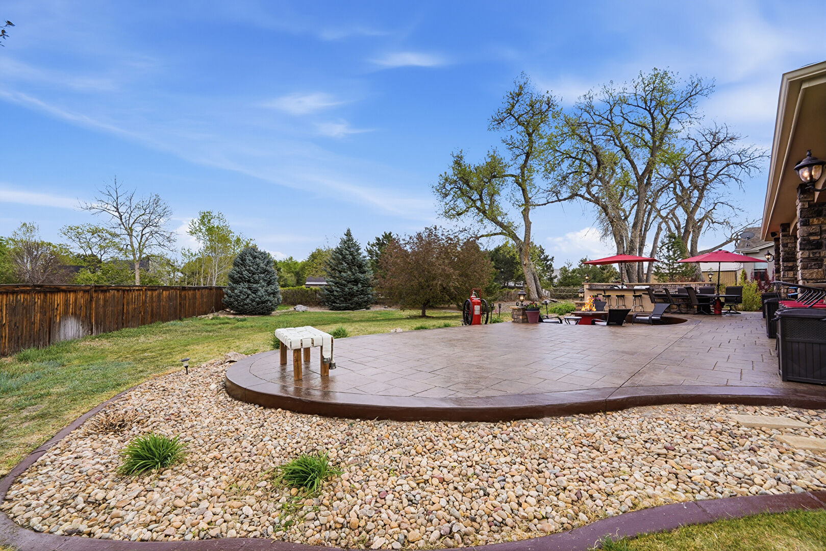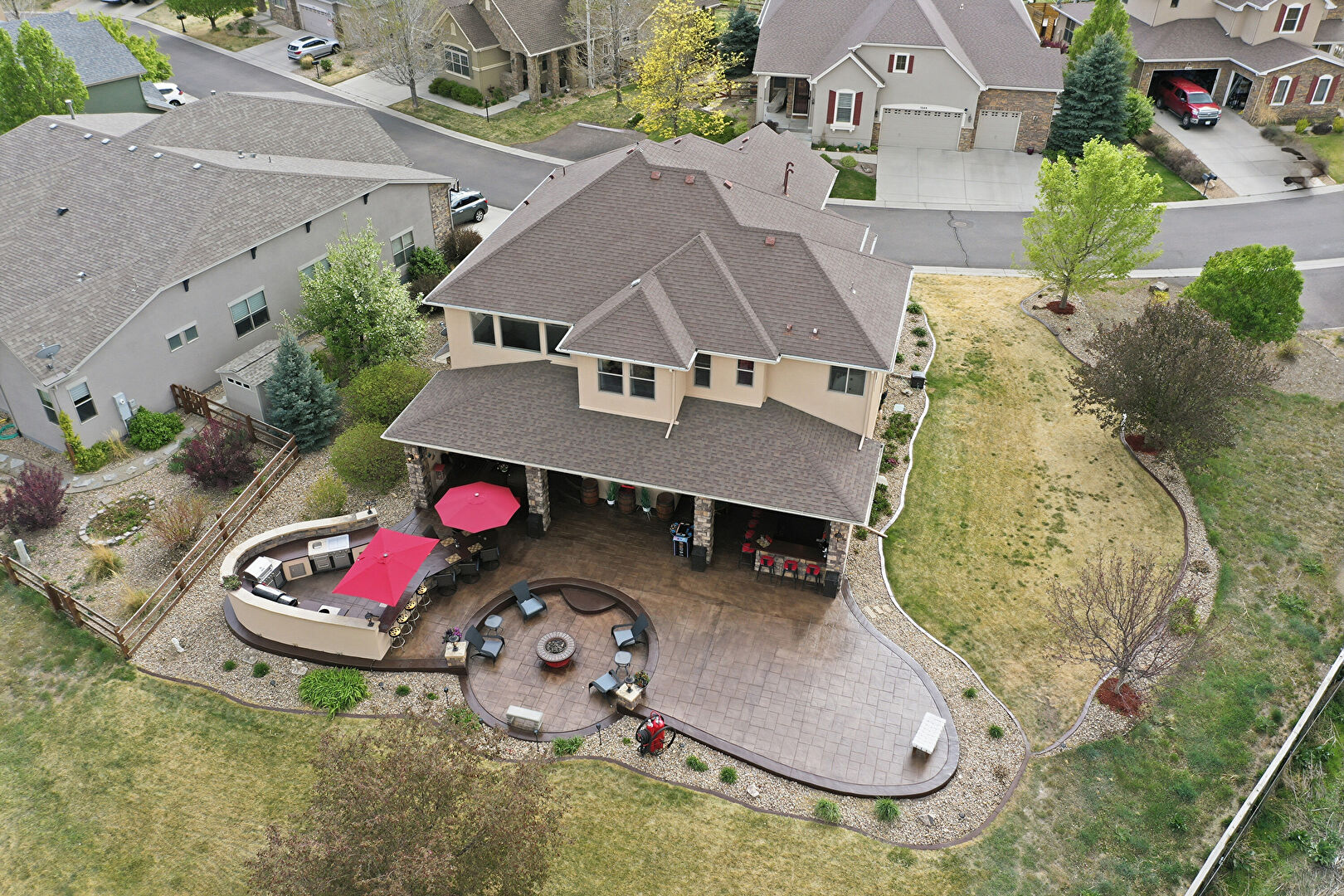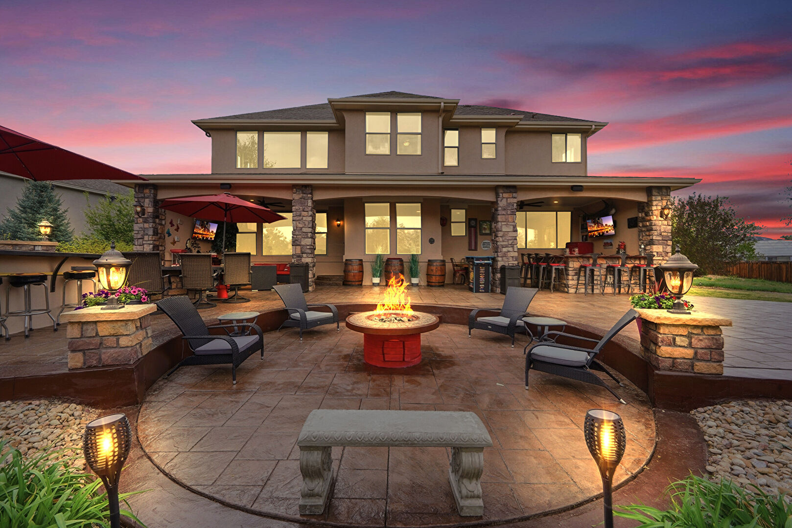 Ceiling Fan, Downspout, Fence, Fire Pit, Gazebo, Gutters, Lawn, Outdoor Bar, Outdoor Kitchen, Patio, Stone Siding, Stucco Siding, Downspout, Lawn, Stucco Siding