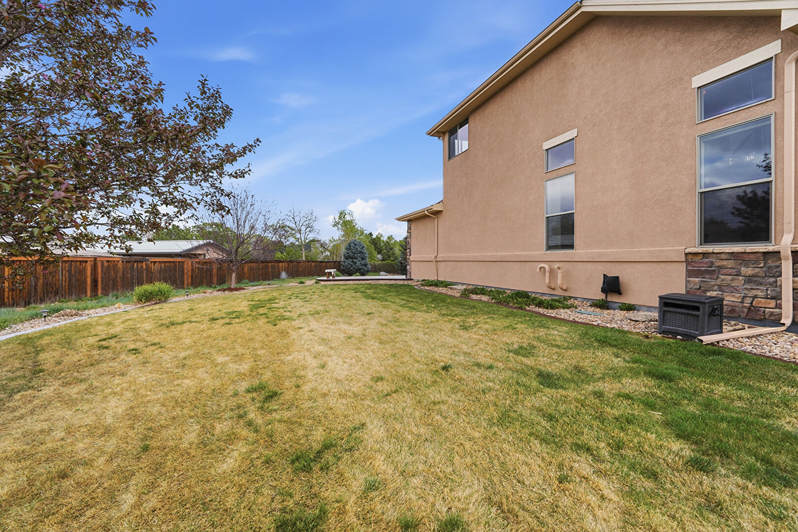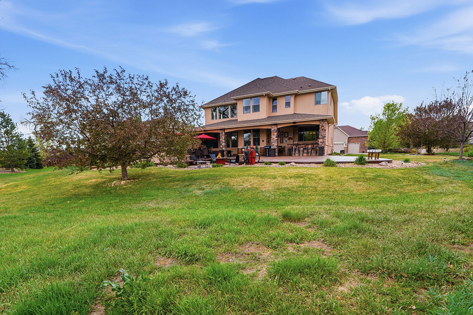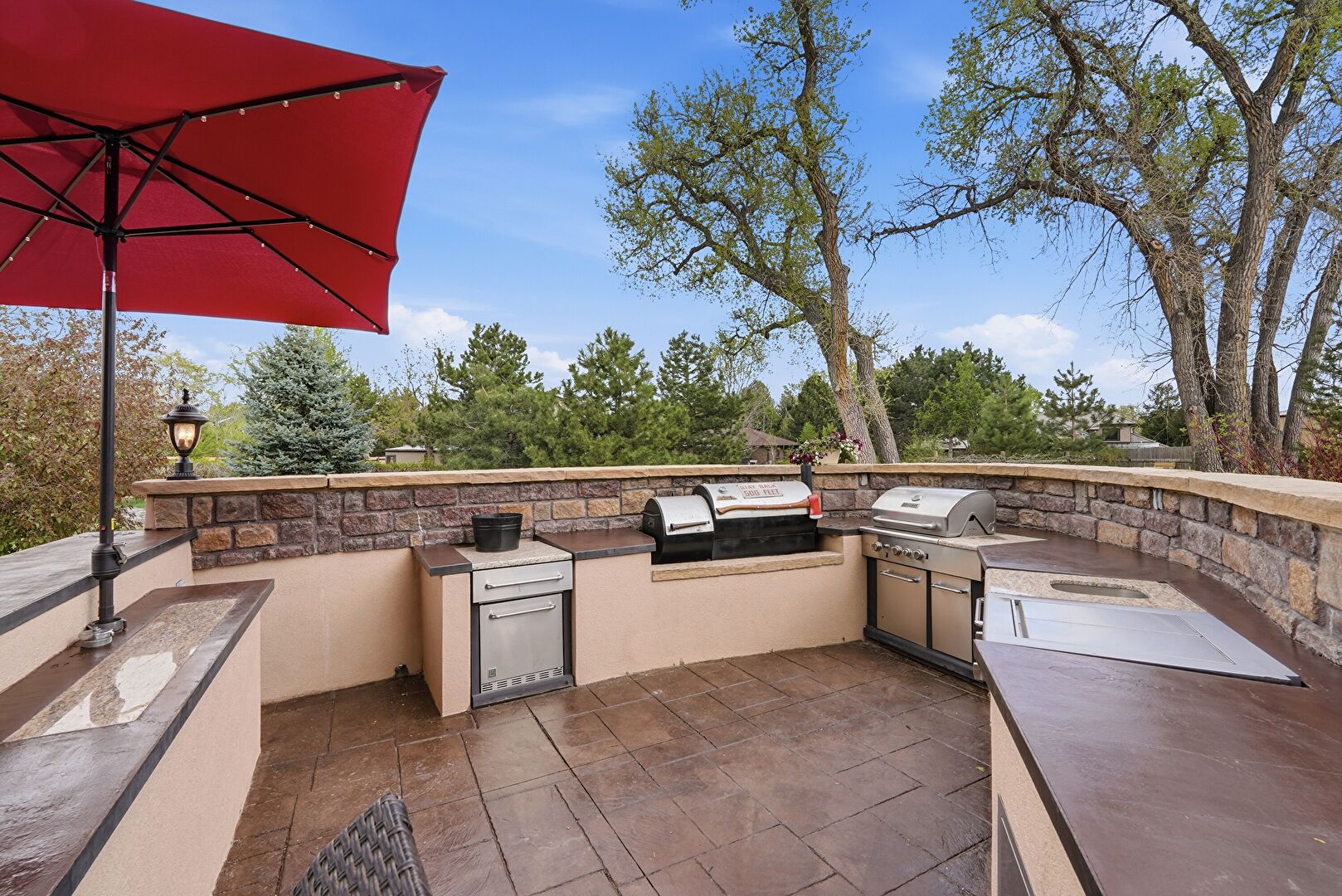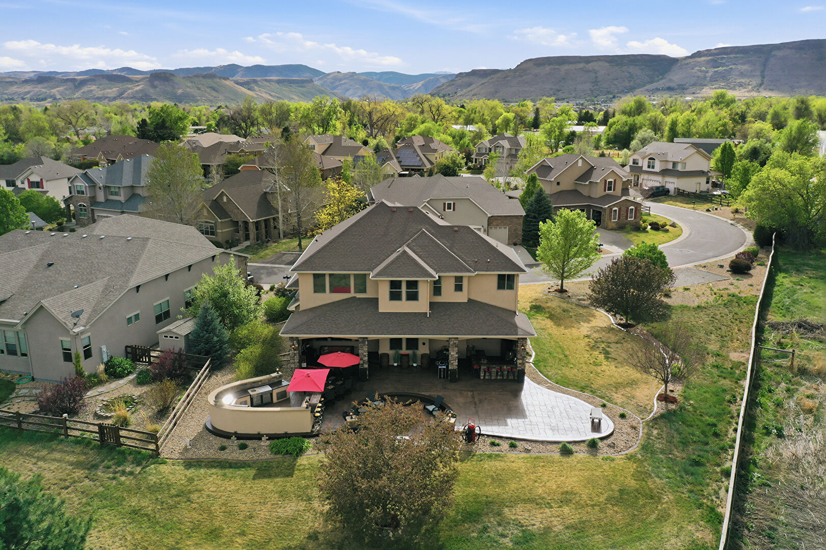 Ceiling Fan, Downspout, Fence, Fire Pit, Gazebo, Gutters, Lawn, Outdoor Bar, Outdoor Kitchen, Patio, Stone Siding, Stucco Siding, Downspout, Lawn, Stucco Siding