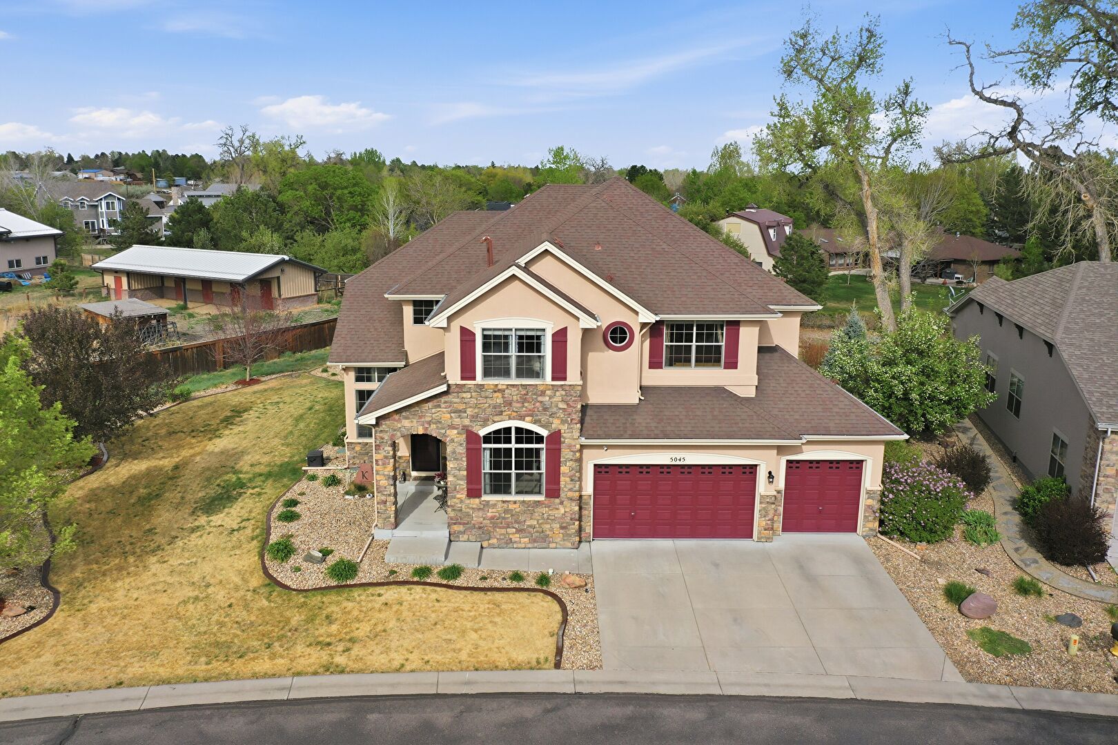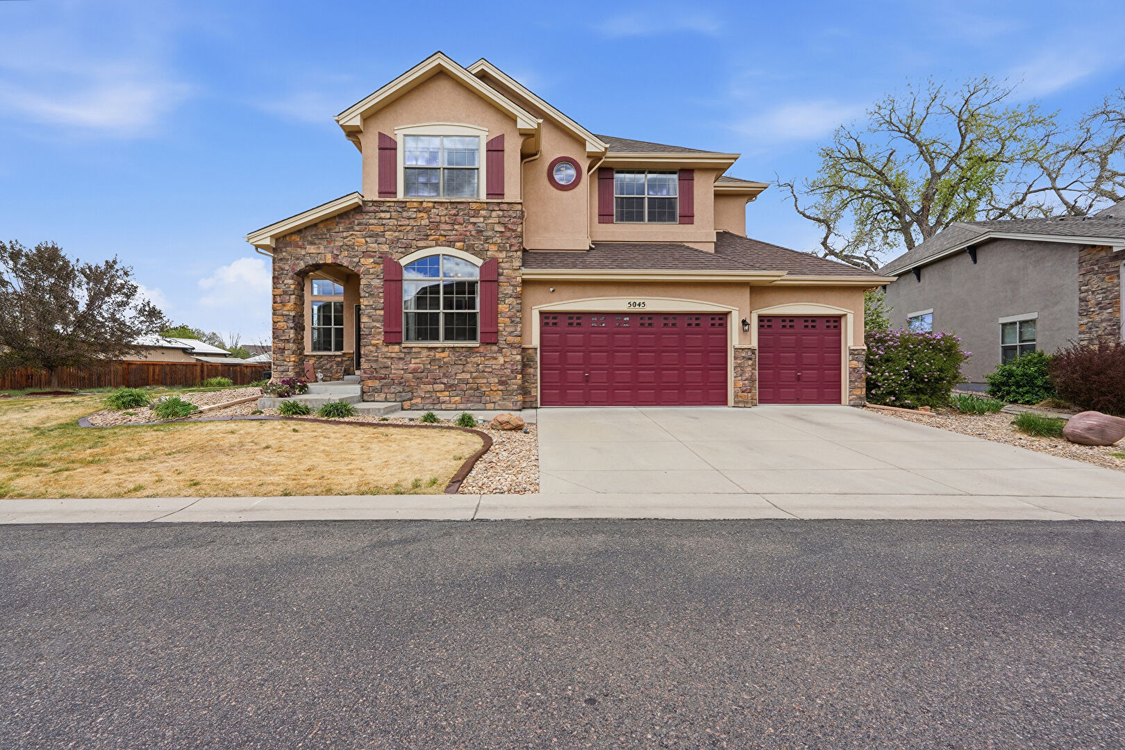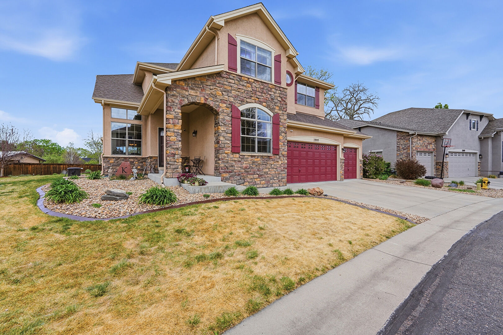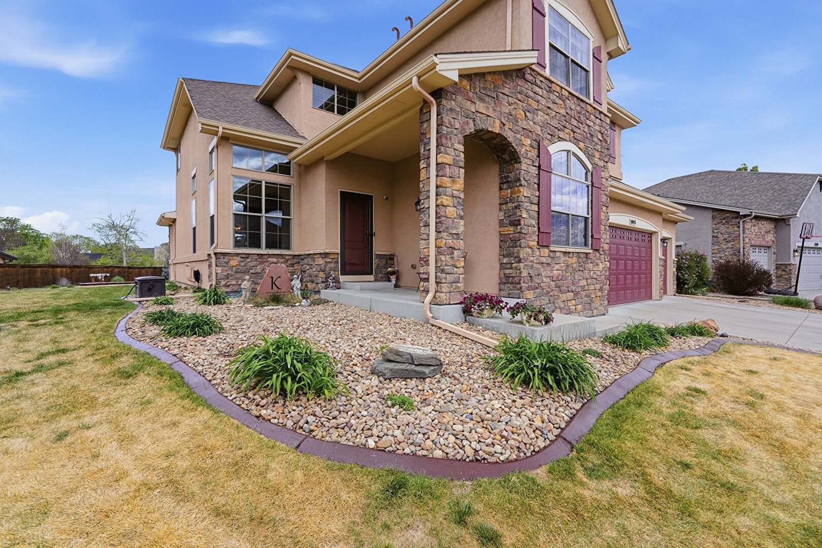 Built In Garage, Central Ac, Downspout, Driveway, Fence, Gutters, Lawn, Porch, Residential View, Shingle Roof, Stone Siding, Stucco Siding, Built In Garage, Downspout, Driveway, Lawn, Stucco Siding
