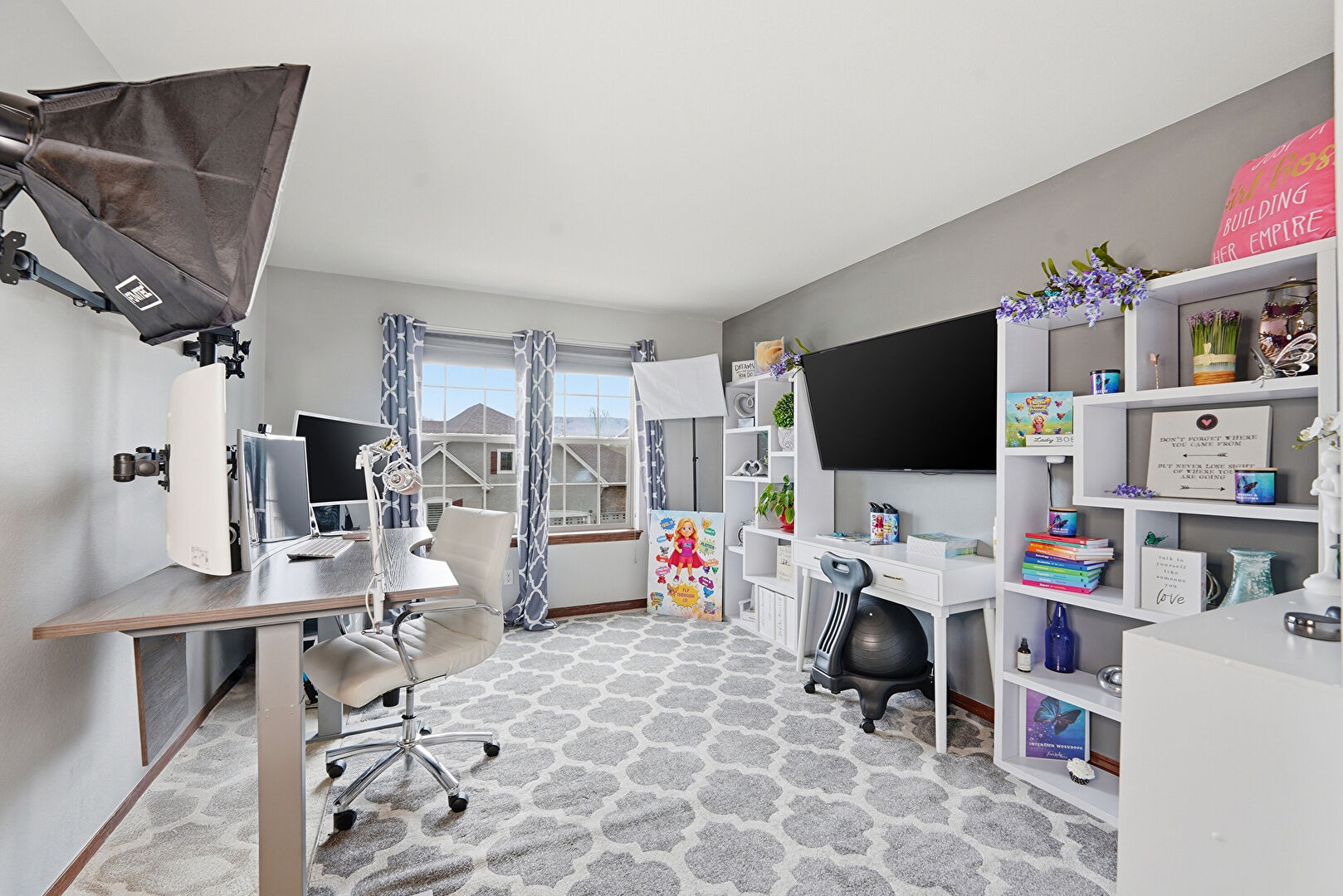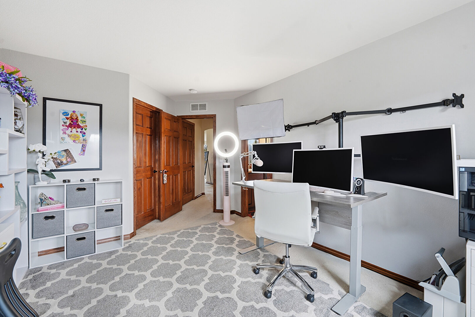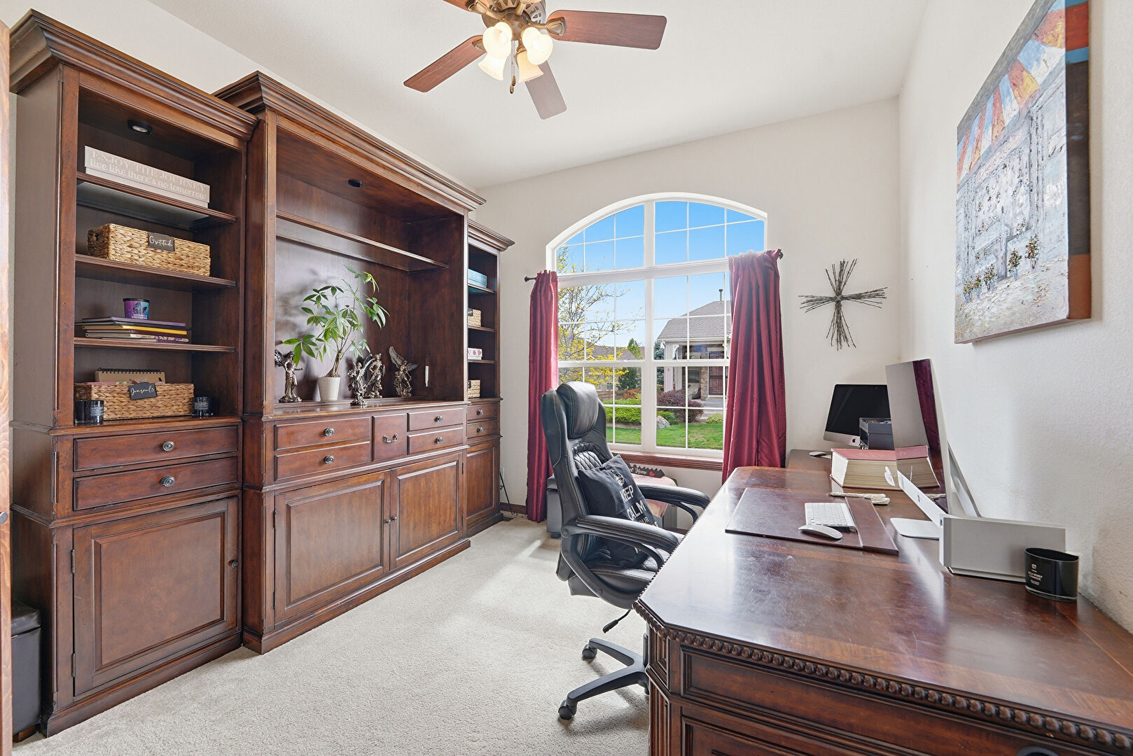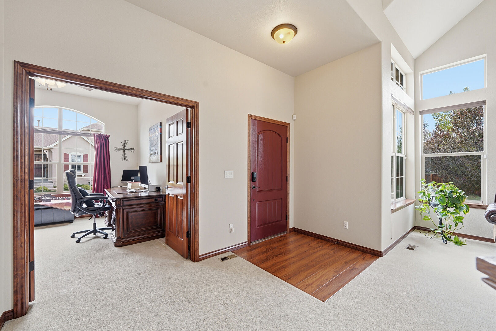Baseboards Wall, Carpet, Ceiling Fan, Drywall, High Ceiling, Natural Light, Office Area, Vaulted Ceiling, Vent, Baseboards Wall, Carpet, Drywall, Office Area, Wood Finish Floor