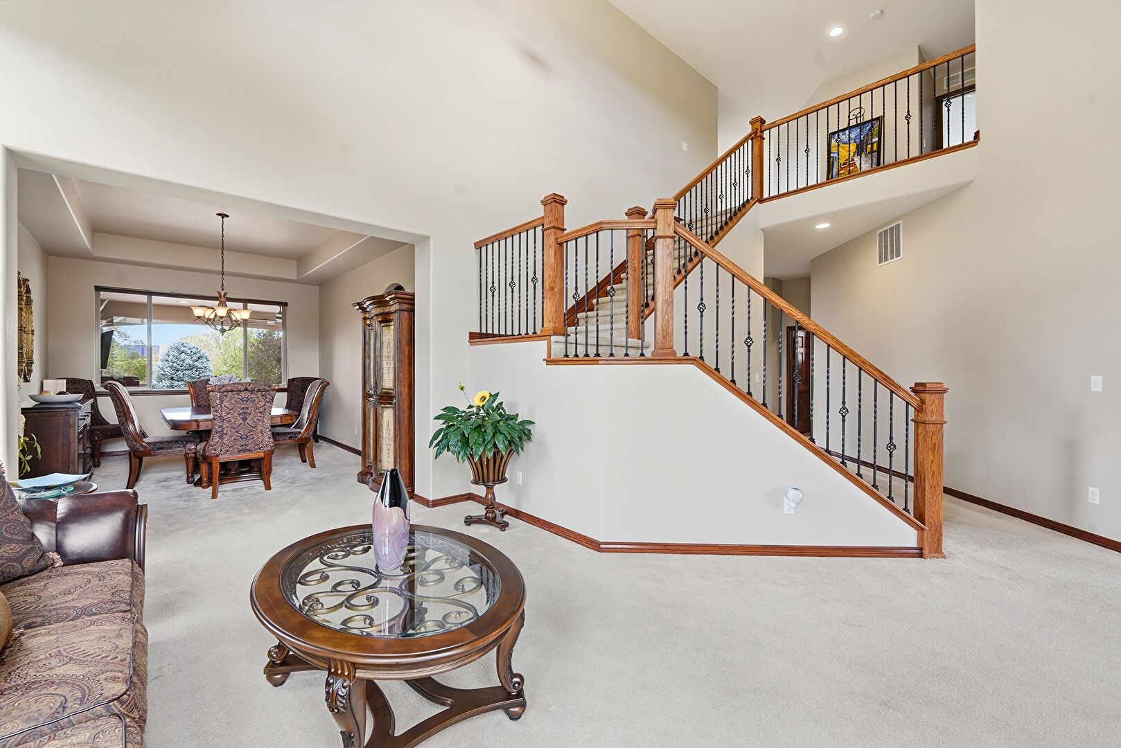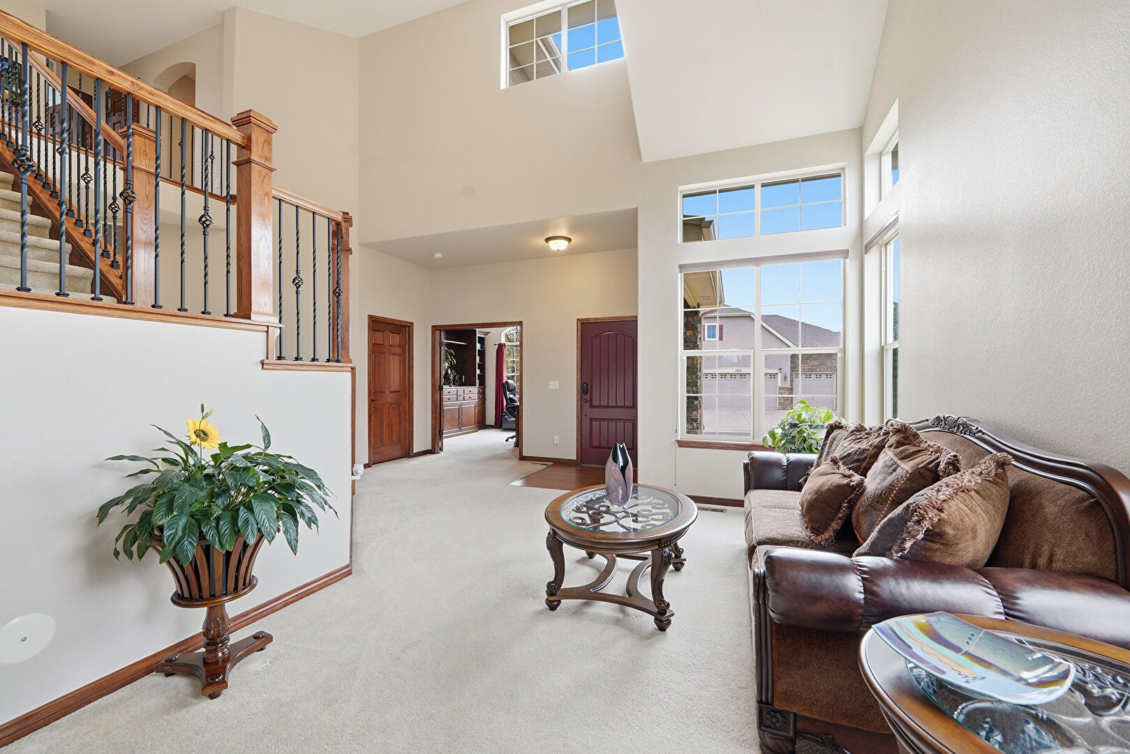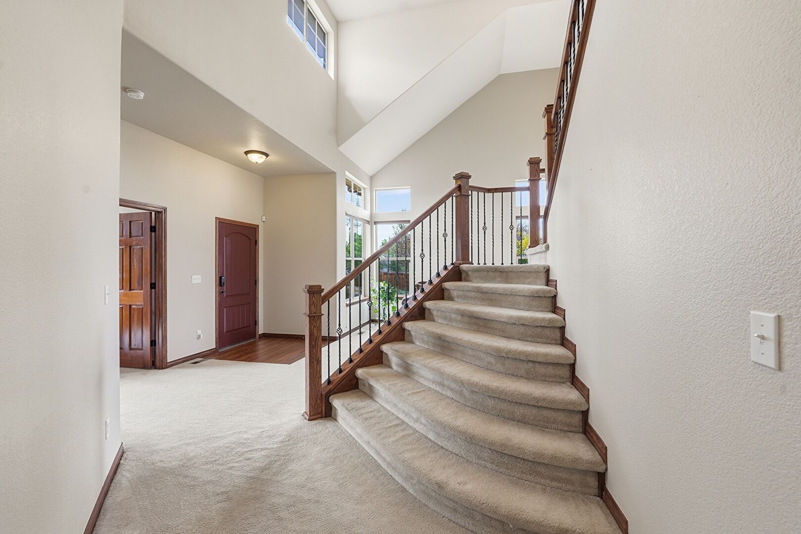 Baseboards Wall, Carpet, High Ceiling, Natural Light, Smoke Carbon Monoxide Detector, Textured Wall, Vent, Stairs
