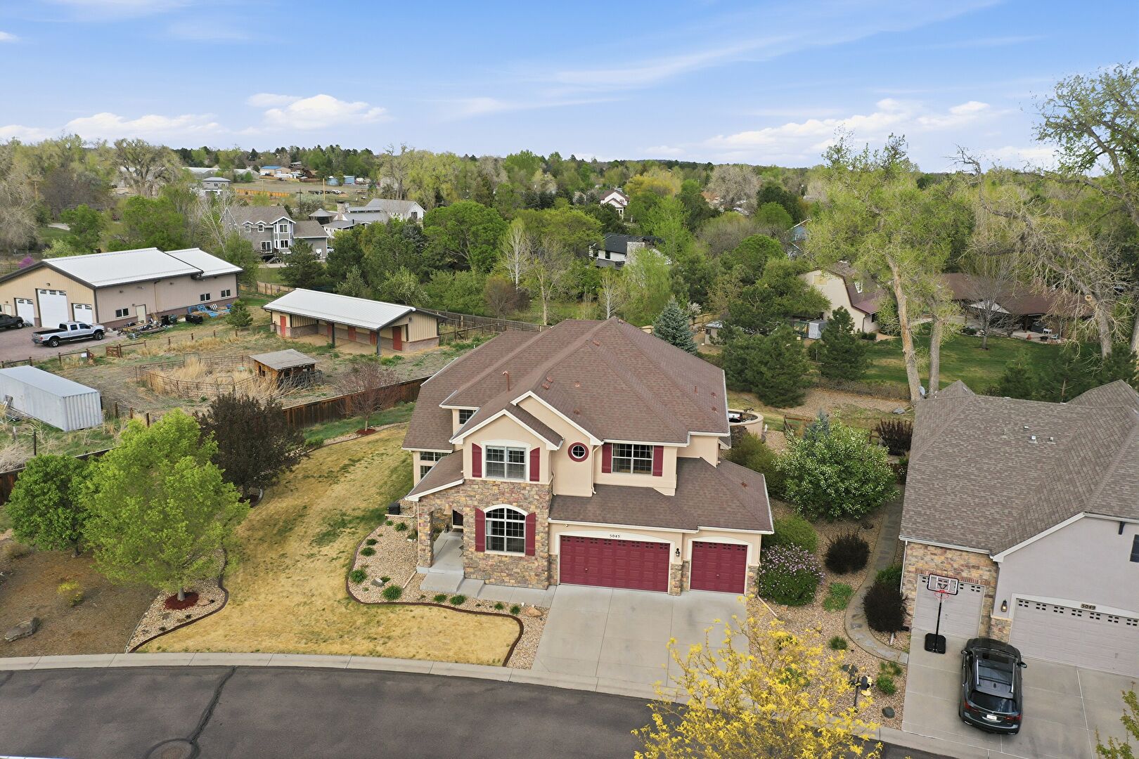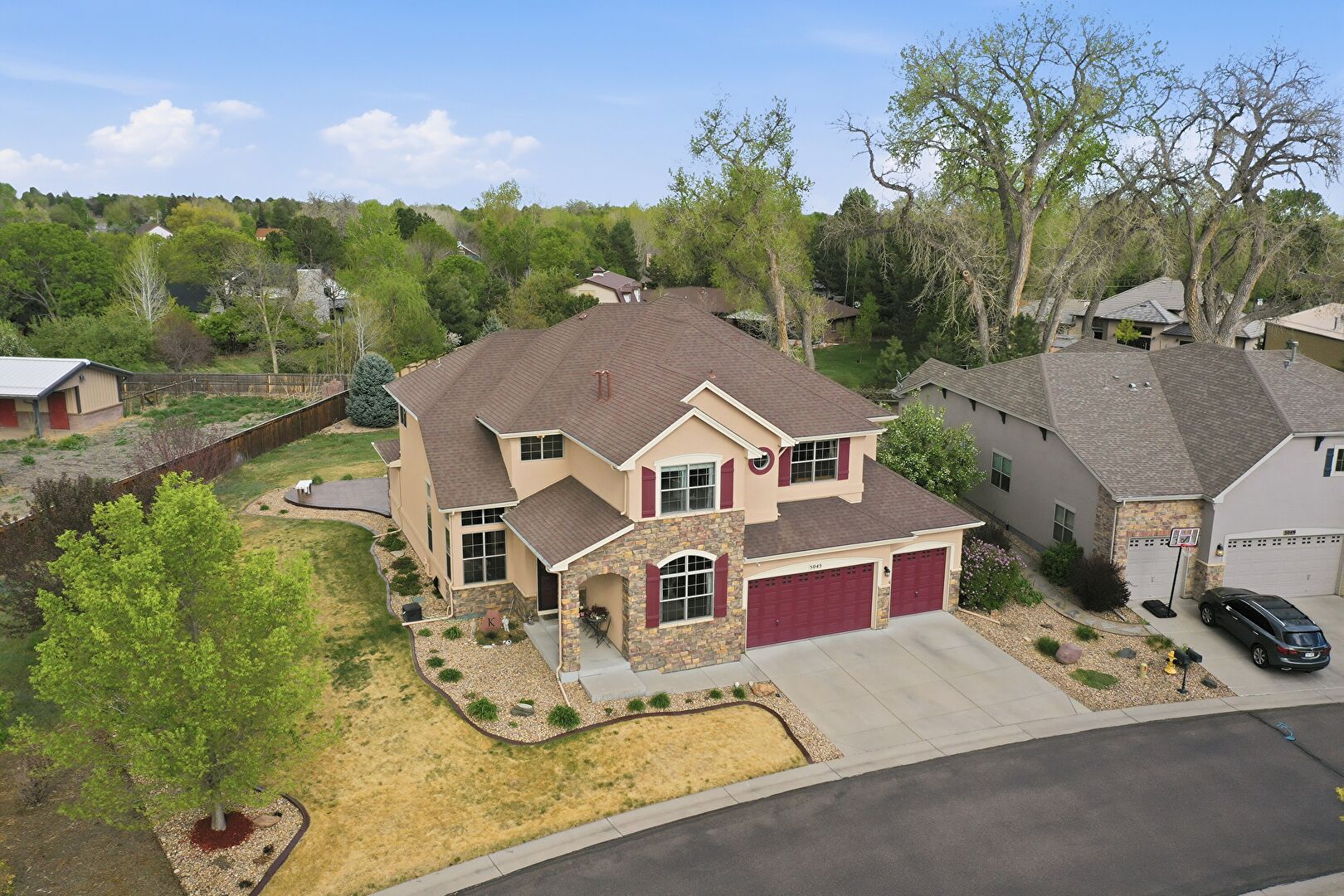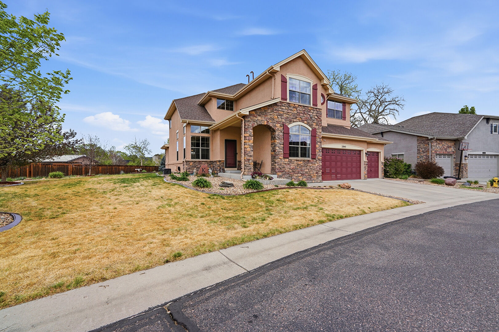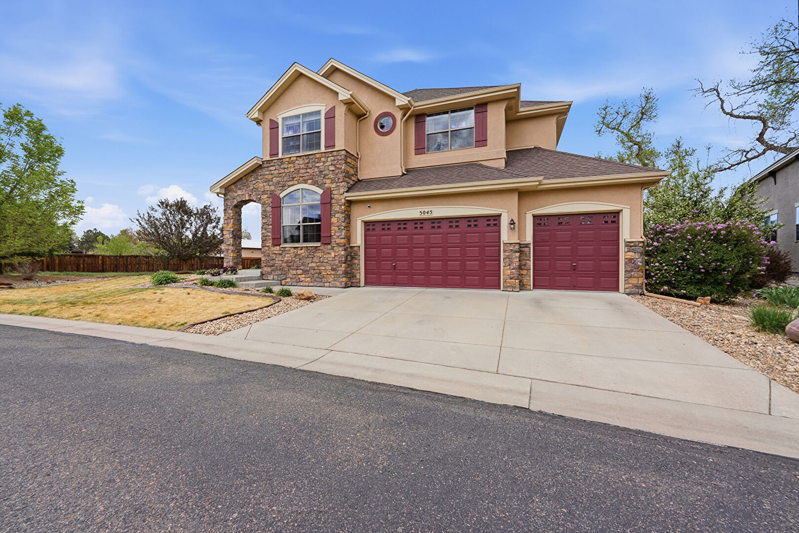 Built In Garage, Driveway, Fence, Mountain View, Porch, Residential View, Shingle Roof, Stone Siding, Stucco Siding, Woods View, Driveway, Mountain View, Residential View
