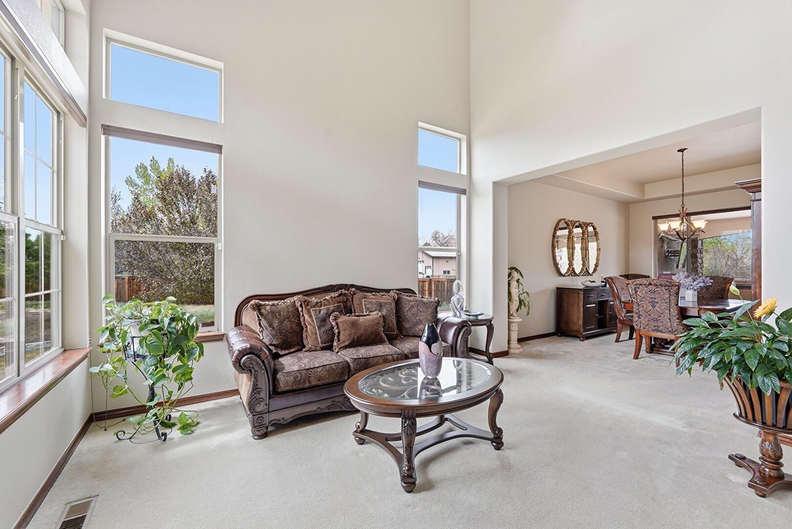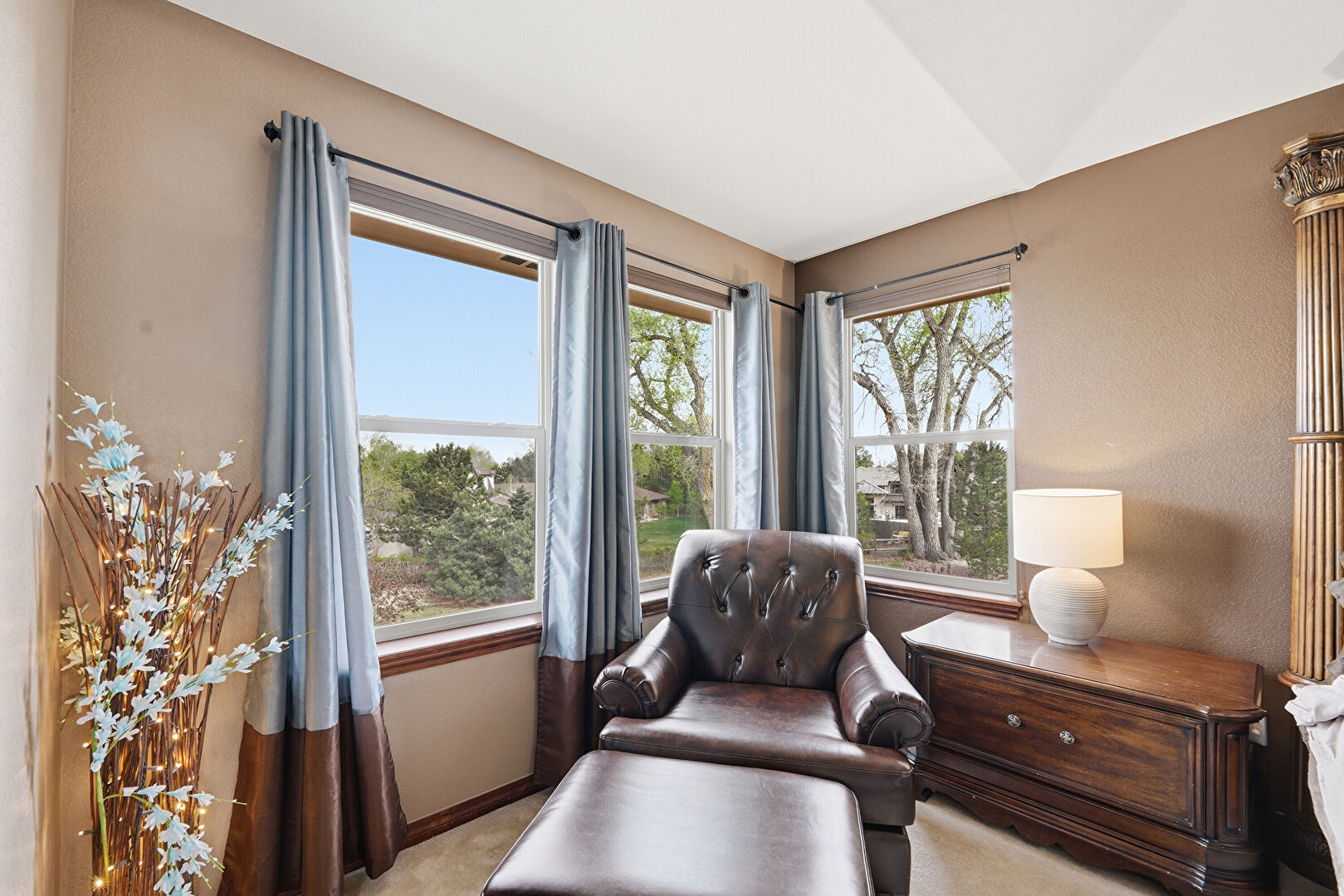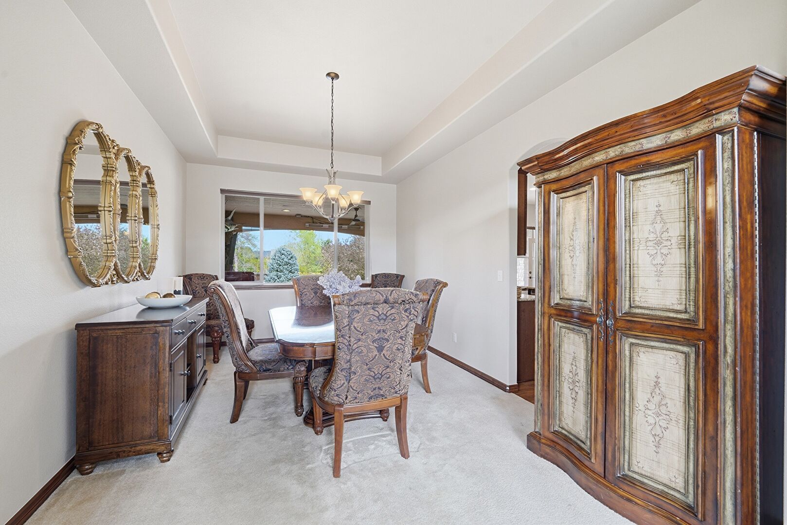 Baseboards Wall, Drywall, Natural Light, Notable Chandelier, Tray Ceiling, Carpet