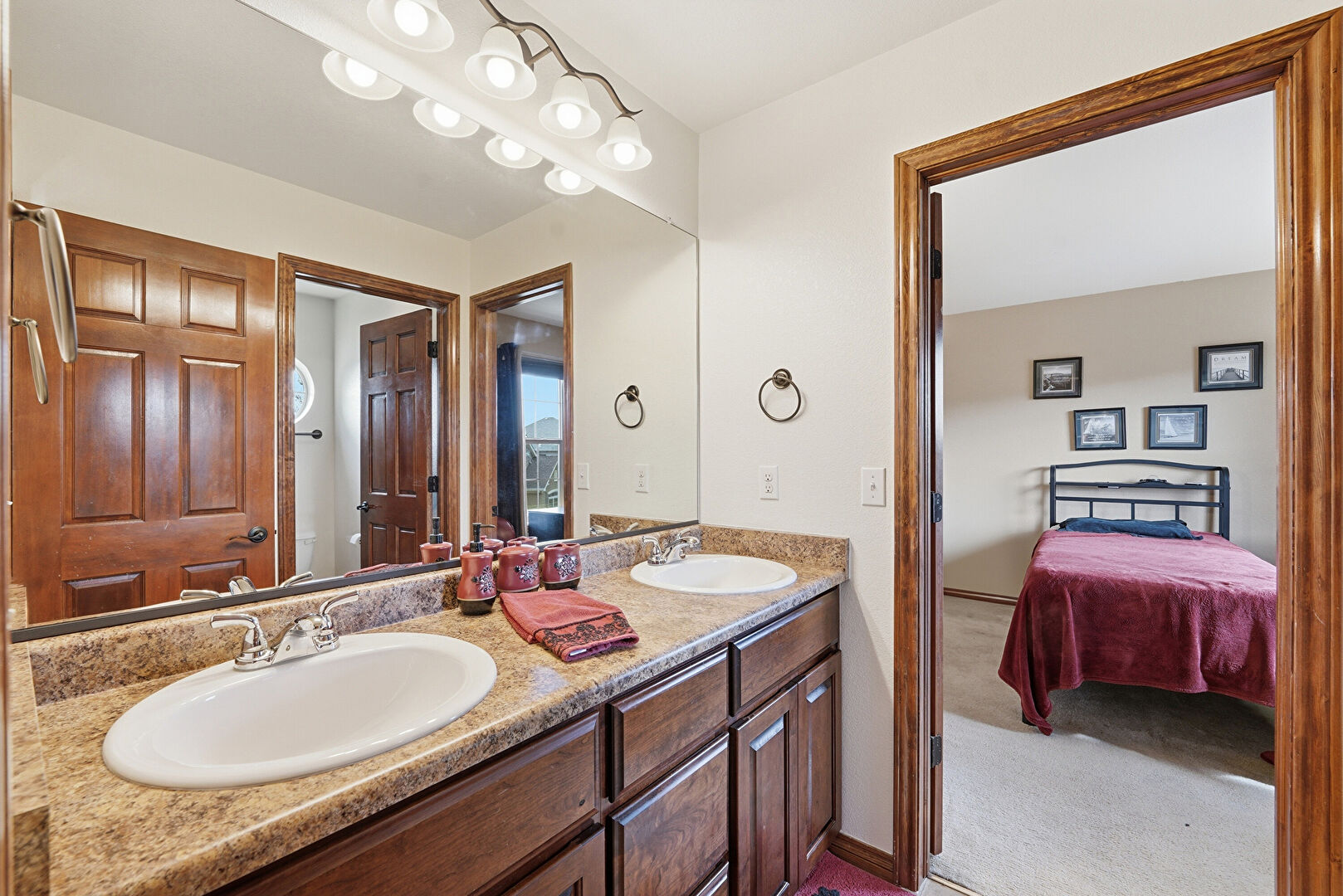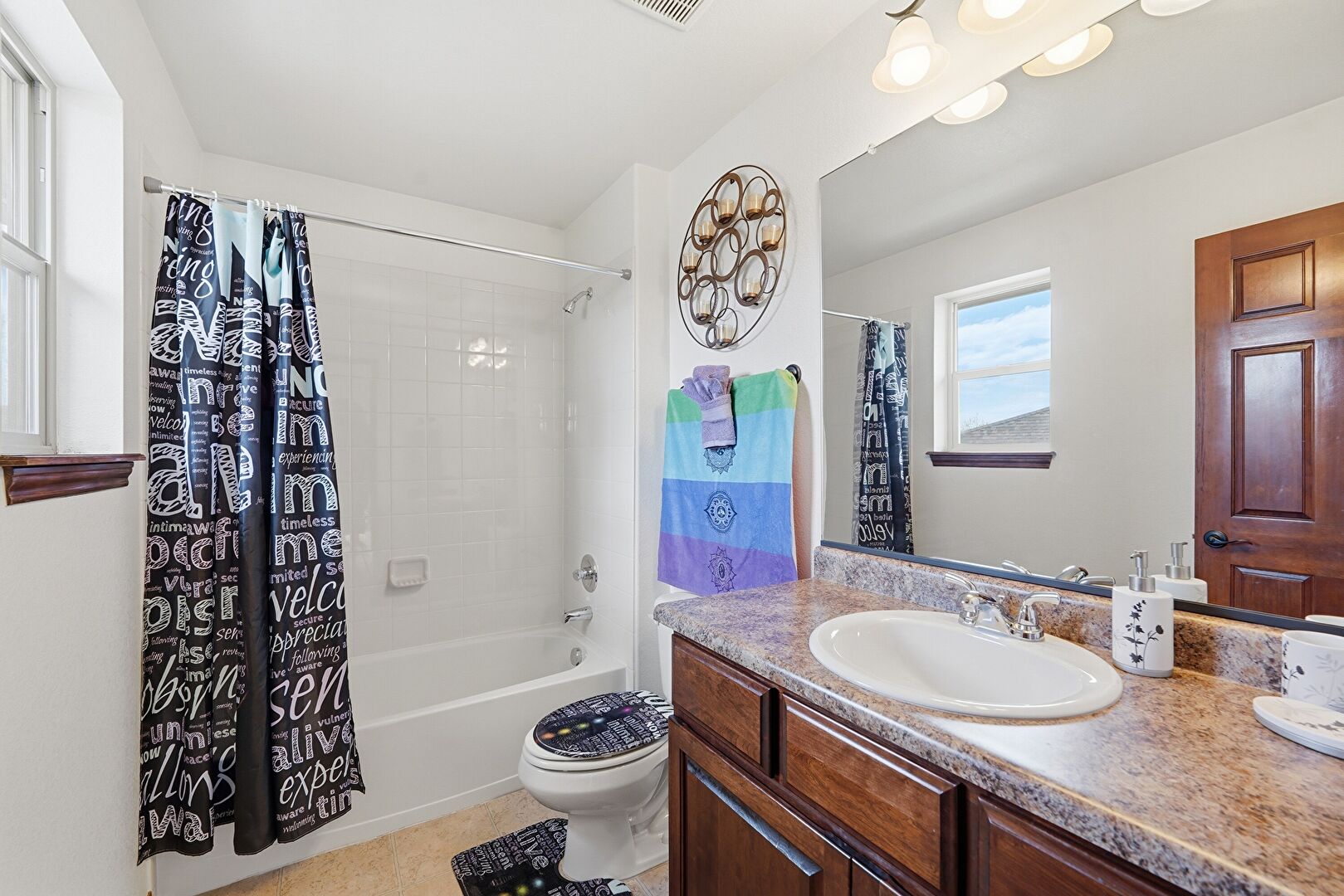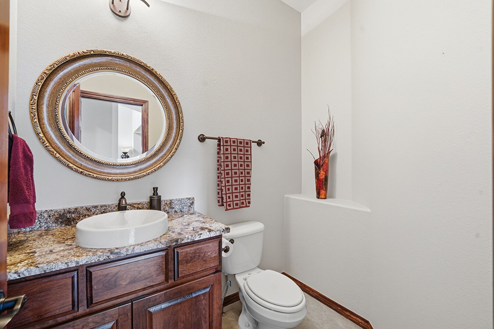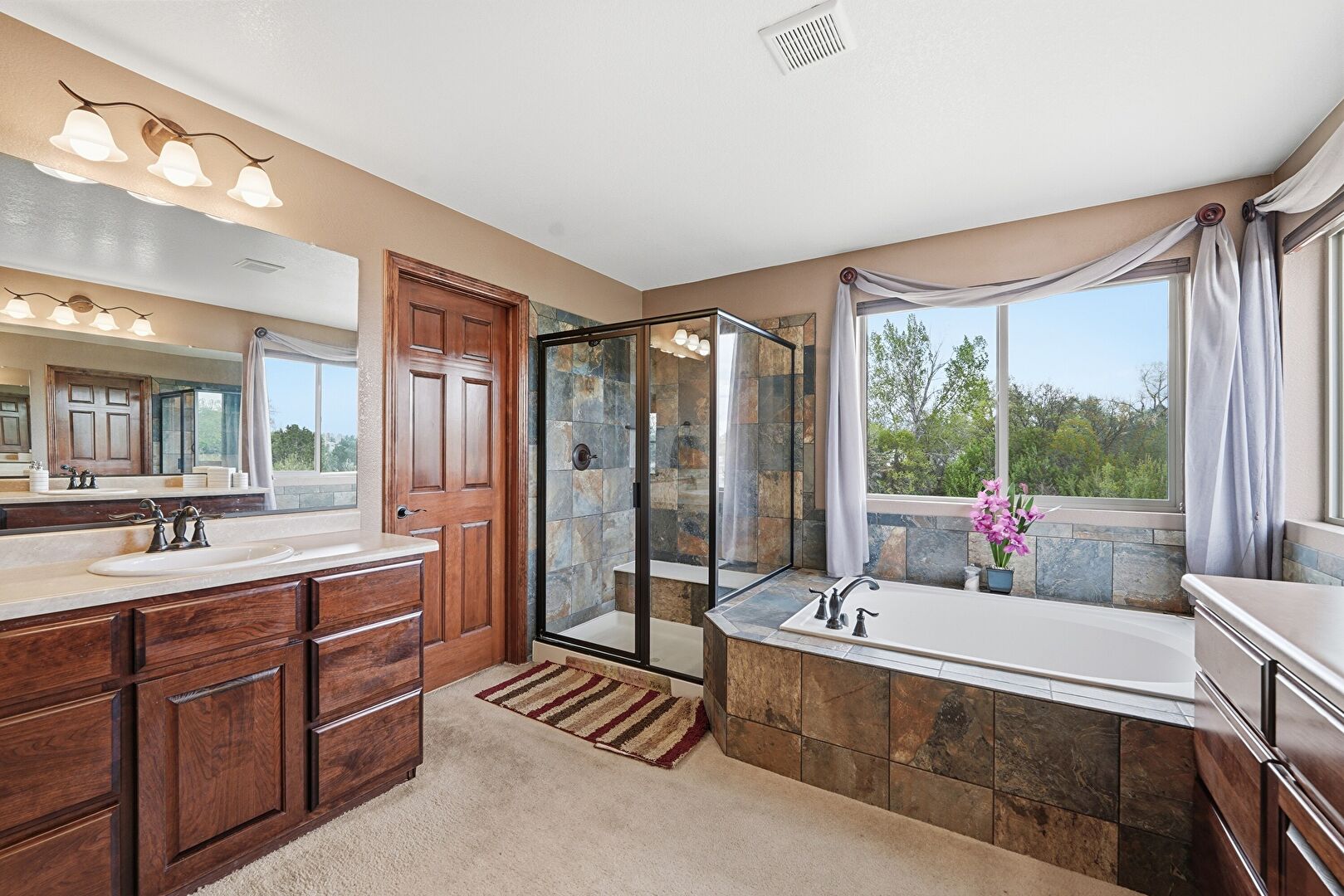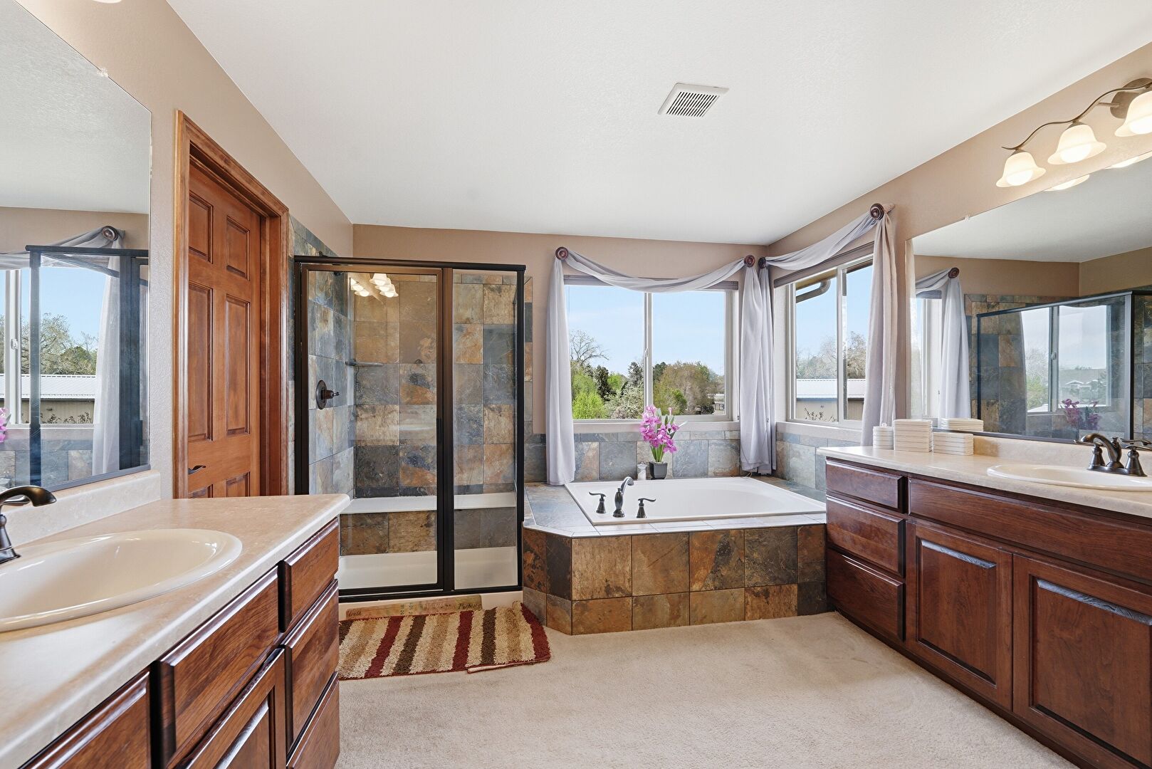 Baseboards Wall, Carpet, Combined Bath Shower, Double Vanity, Drywall, Ensuite Bathroom, Full Bathroom, Half Bathroom, Natural Light, Textured Wall, Tile Floor, Vanity, Vent, Baseboards Wall, Natural Light, Vanity