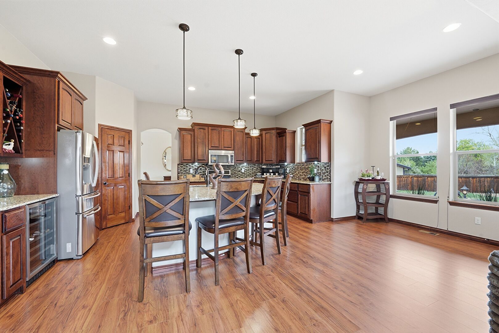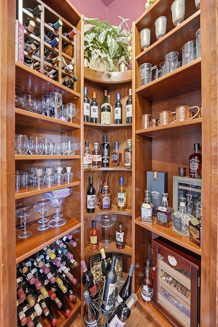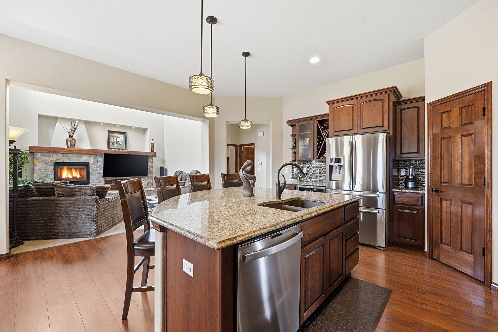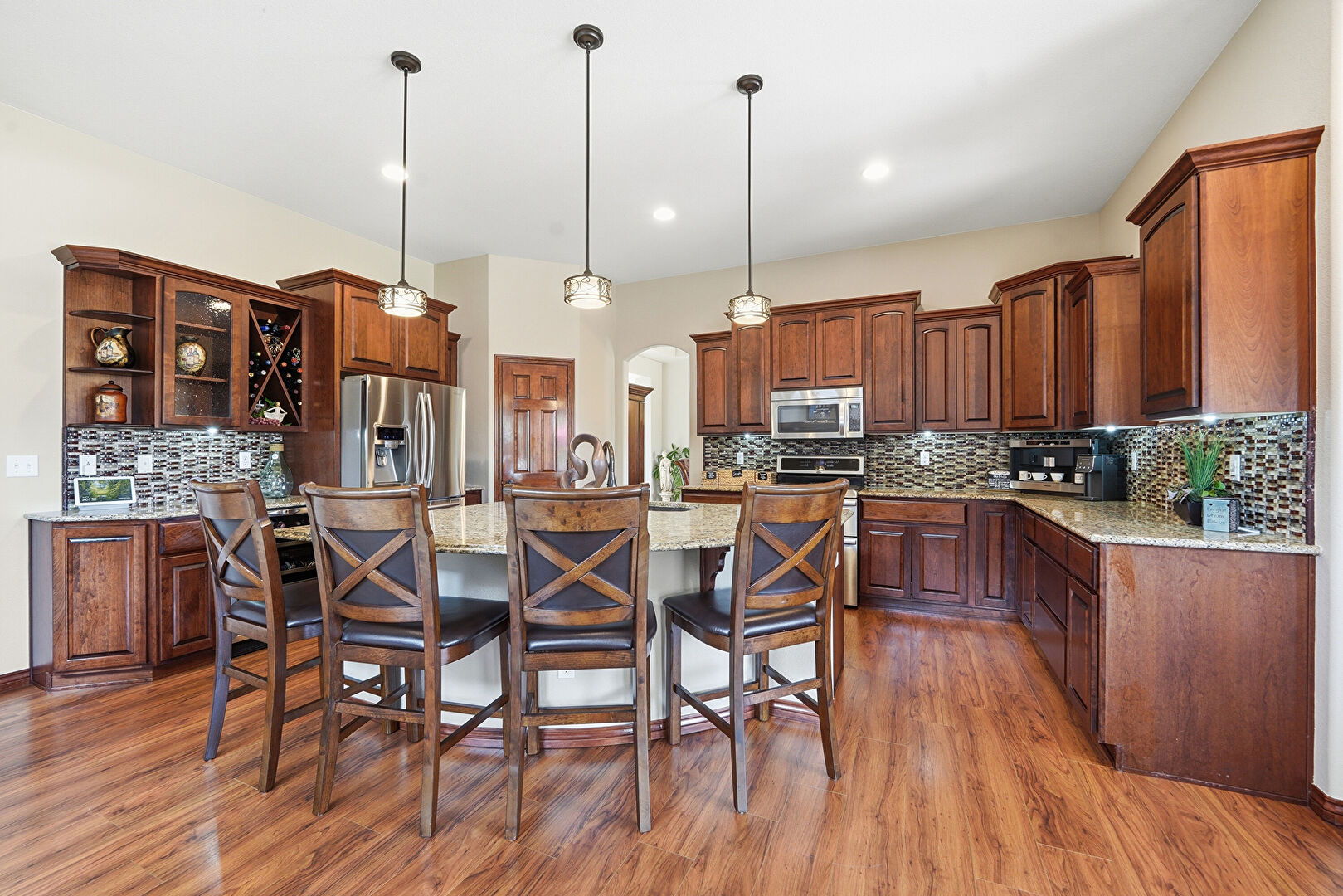 Arched Cabinets, Arched Walkways, Baseboards Wall, Crown Molding Cabinets, Dark Brown Cabinets, Drywall, Fireplace, Glass Insert Cabinets, Kitchen Bar, Kitchen Island, Medium Brown Cabinets, Natural Light, Open Shelves, Opens To Living Area, Pendant Lighting, Raised Cabinets, Recessed Lighting, Stone Countertops, U Shaped Kitchen, Wood Finish Floor, Crown Molding Cabinets, Glass Insert Cabinets, Recessed Lighting, Stone Countertops, Vent, Wine Cooler