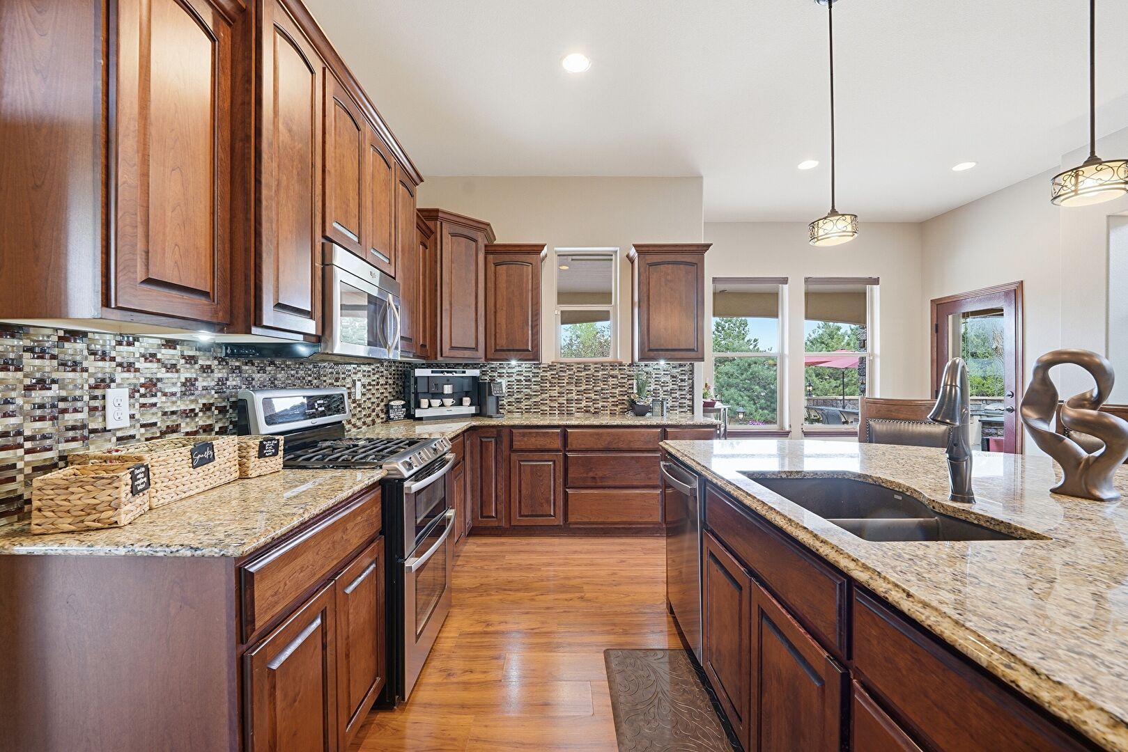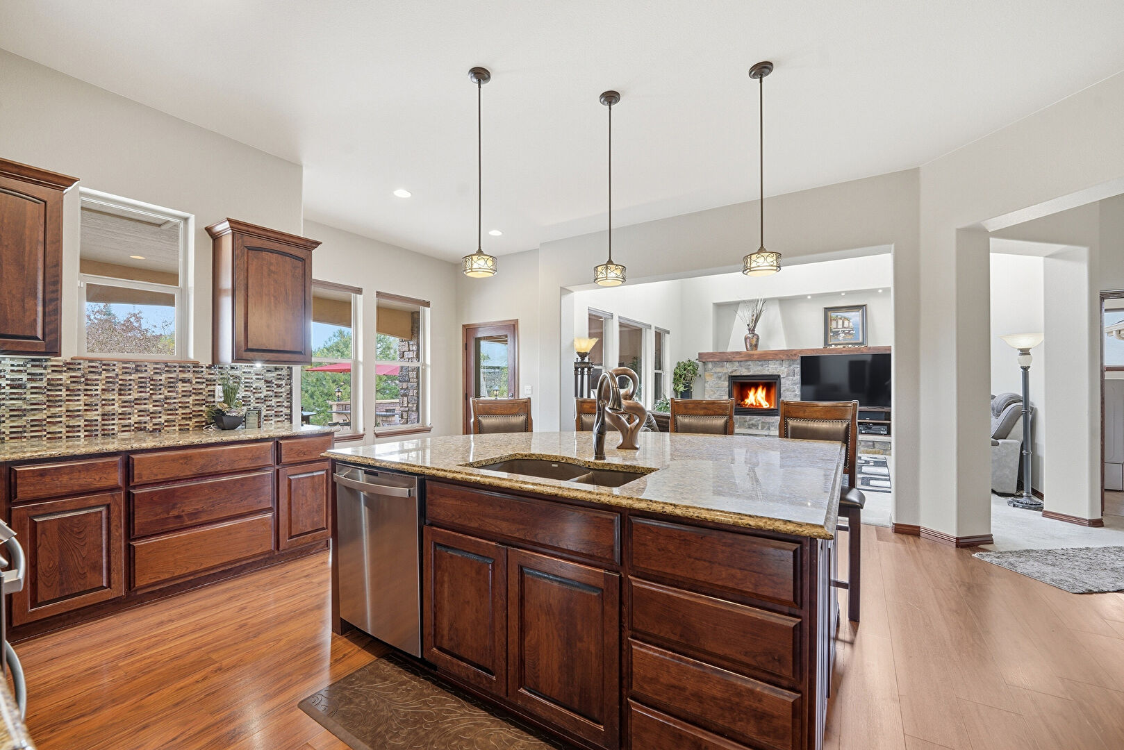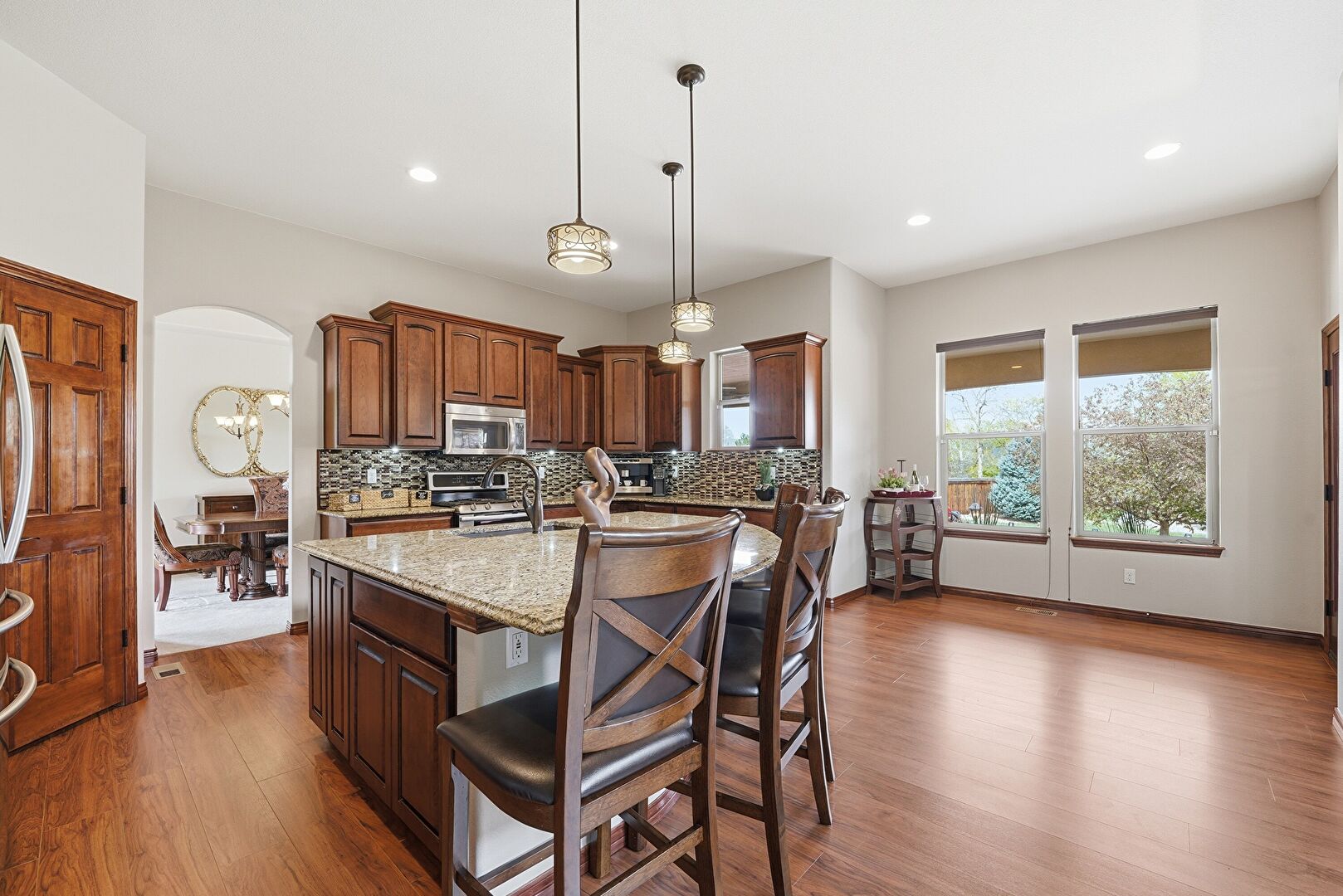 Arched Cabinets, Arched Walkways, Baseboards Wall, Crown Molding Cabinets, Dark Brown Cabinets, Drywall, Fireplace, Glass Insert Cabinets, Kitchen Bar, Kitchen Island, Medium Brown Cabinets, Natural Light, Open Shelves, Opens To Living Area, Pendant Lighting, Raised Cabinets, Recessed Lighting, Stone Countertops, U Shaped Kitchen, Wood Finish Floor, Crown Molding Cabinets, Glass Insert Cabinets, Recessed Lighting, Stone Countertops, Vent, Wine Cooler