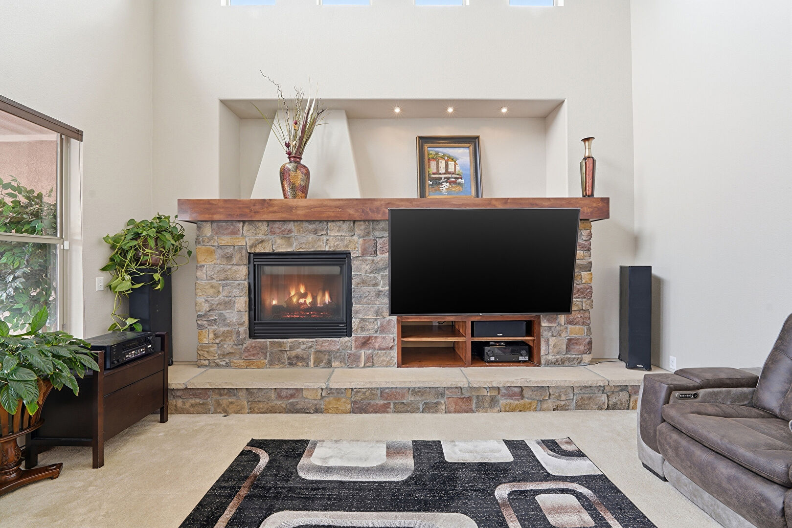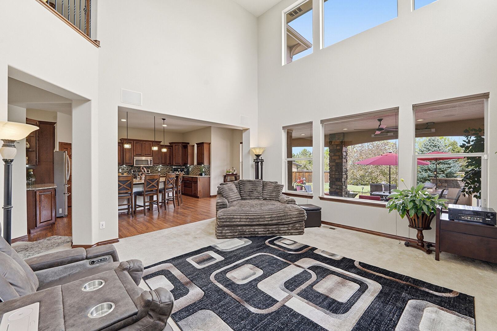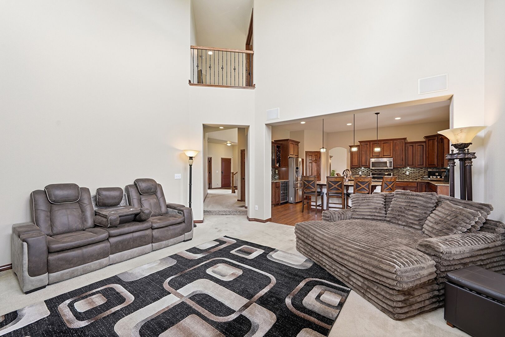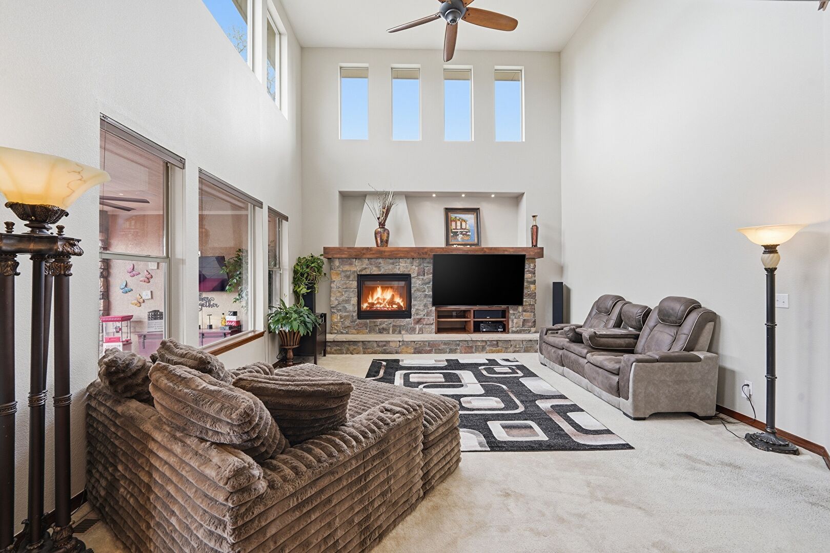 Arched Walkways, Baseboards Wall, Carpet, Ceiling Fan, Drywall, Fireplace, High Ceiling, L Shaped Kitchen, Natural Light, Notable Chandelier, Recessed Lighting, Stairs, Vent, Wine Cooler, Drywall, Fireplace, Natural Light, Tray Ceiling, Vent