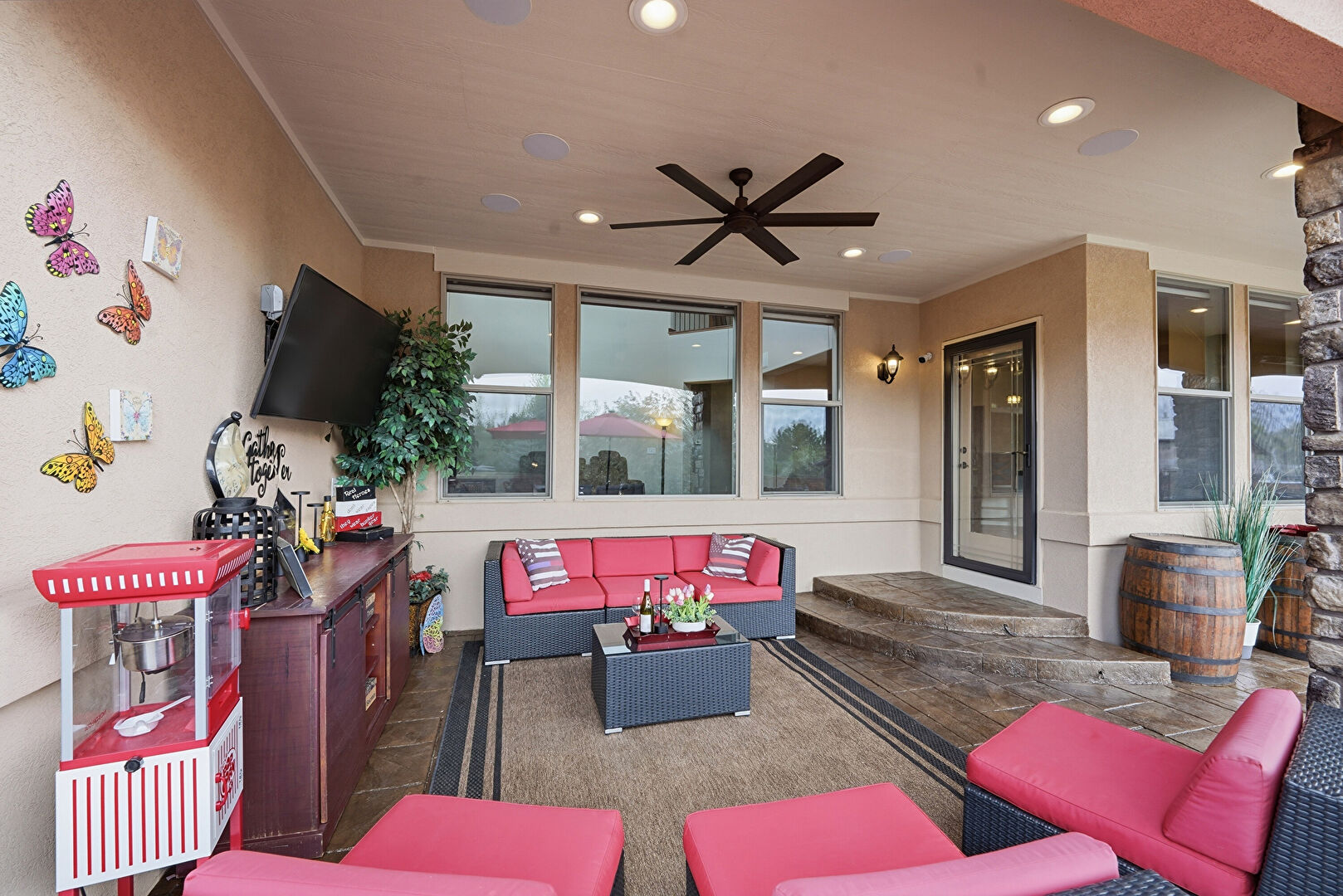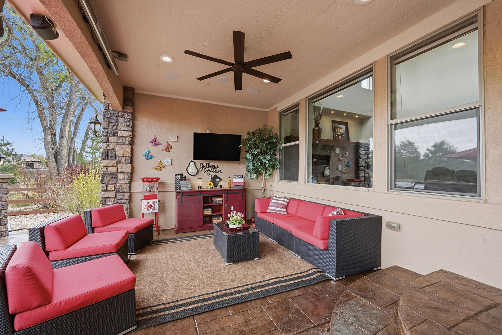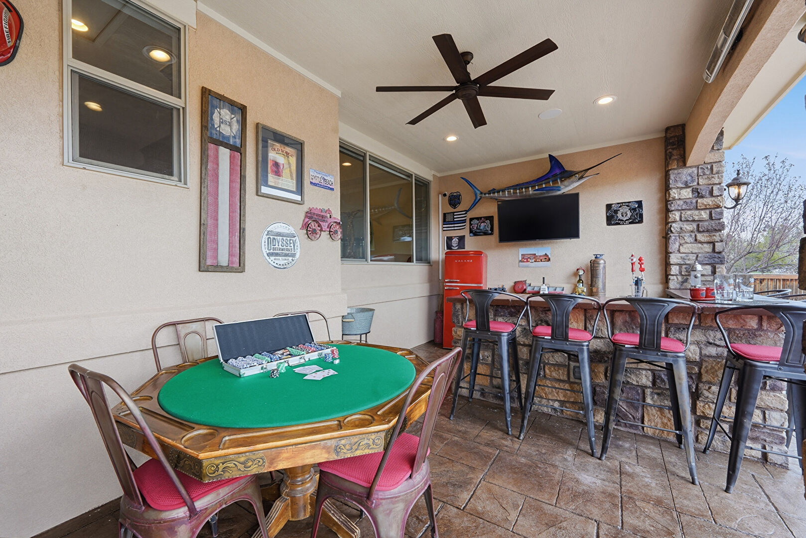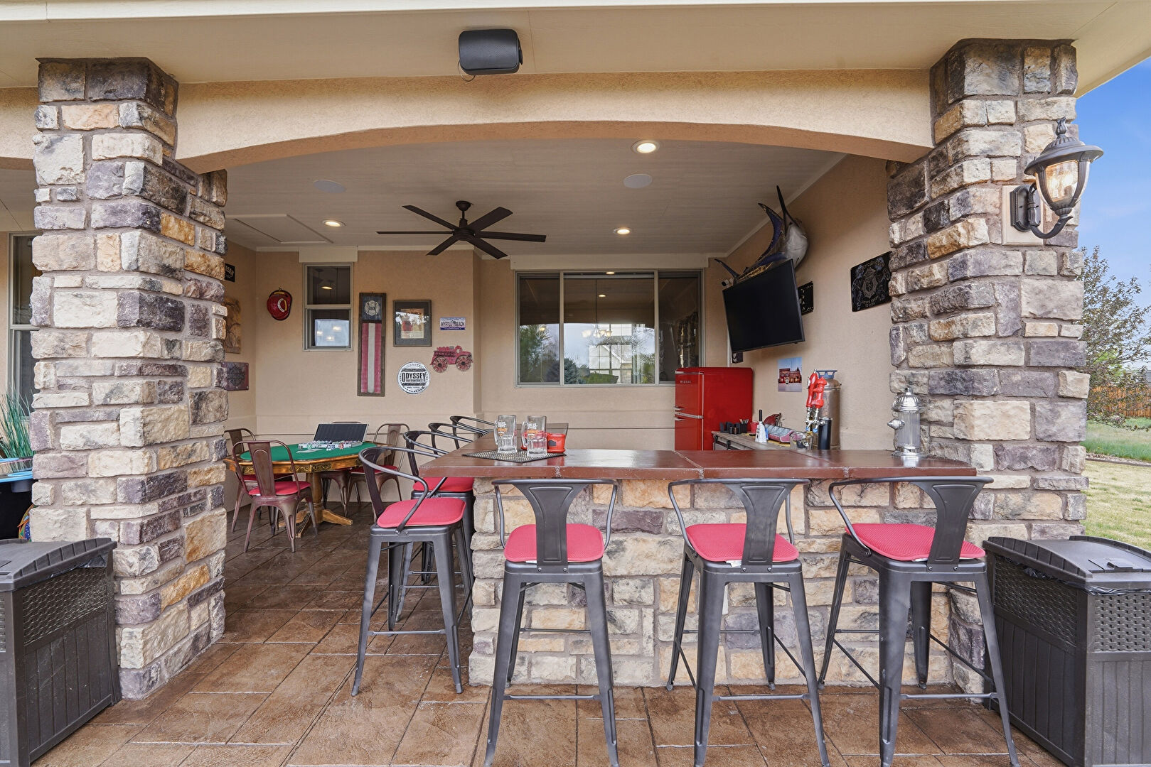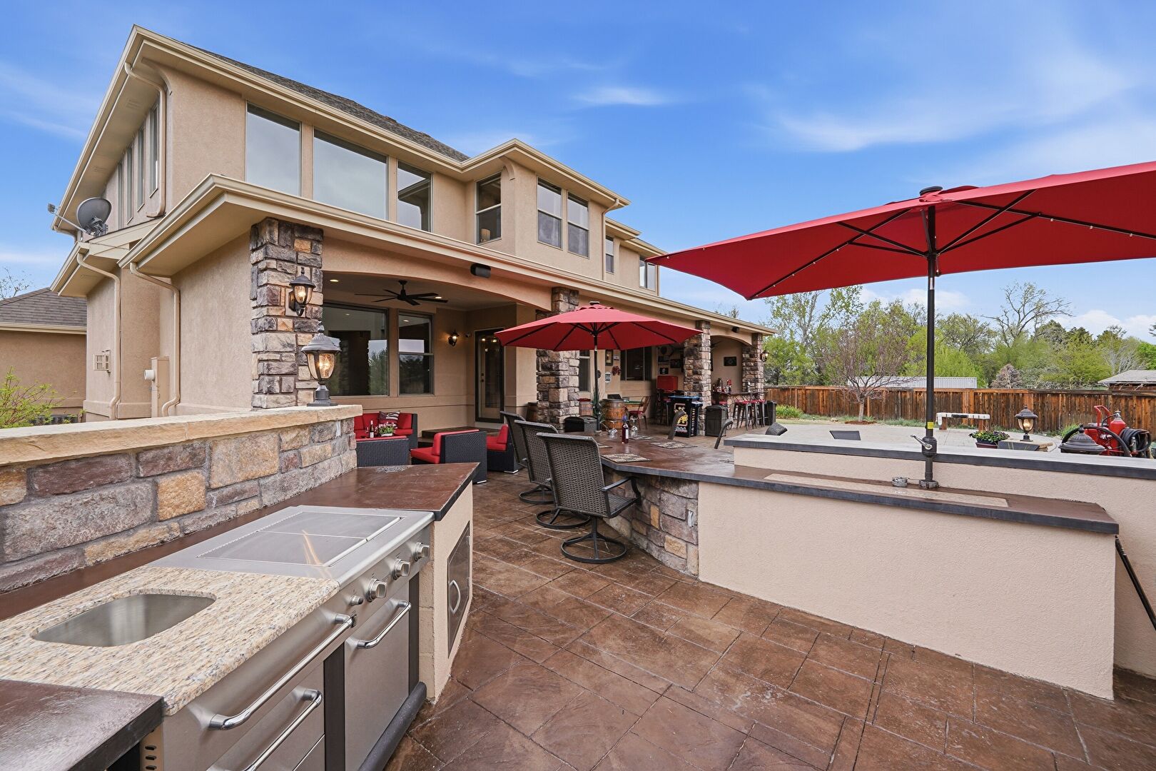Ceiling Fan, Downspout, Fence, Fire Pit, Grill, Gutters, Lawn, Outdoor Bar, Outdoor Dining Area, Outdoor Kitchen, Outdoor Living Space, Patio, Porch, Satellite Dish, Stone Siding, Stucco Siding, Ceiling Fan, Downspout, Gutters, Outdoor Bar, Outdoor Kitchen, Outdoor Living Space, Patio, Satellite Dish