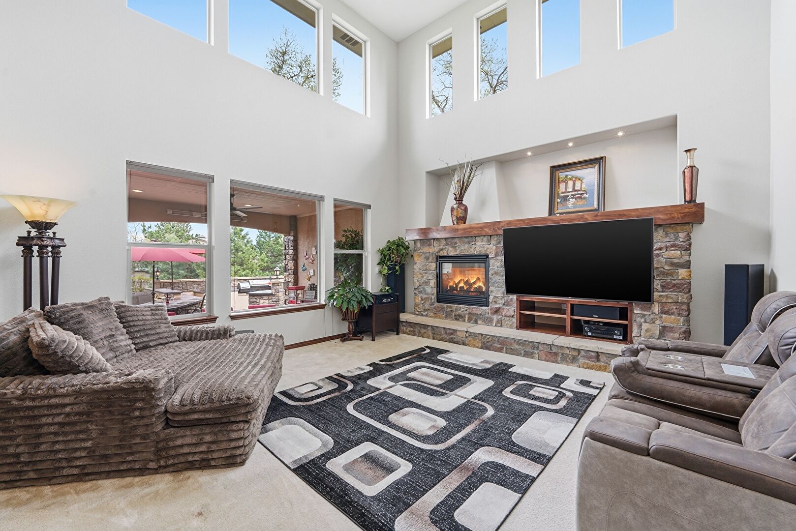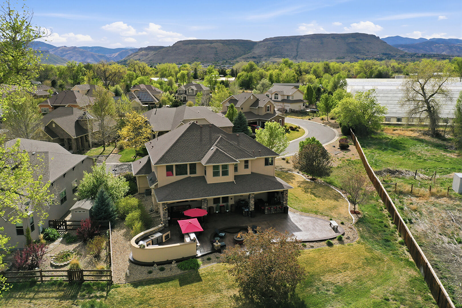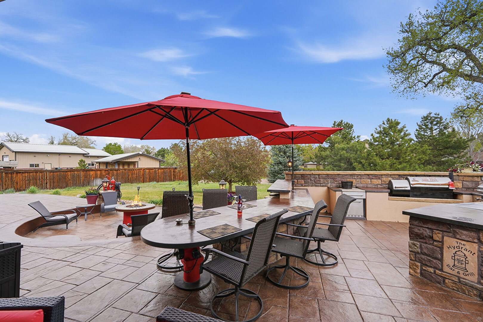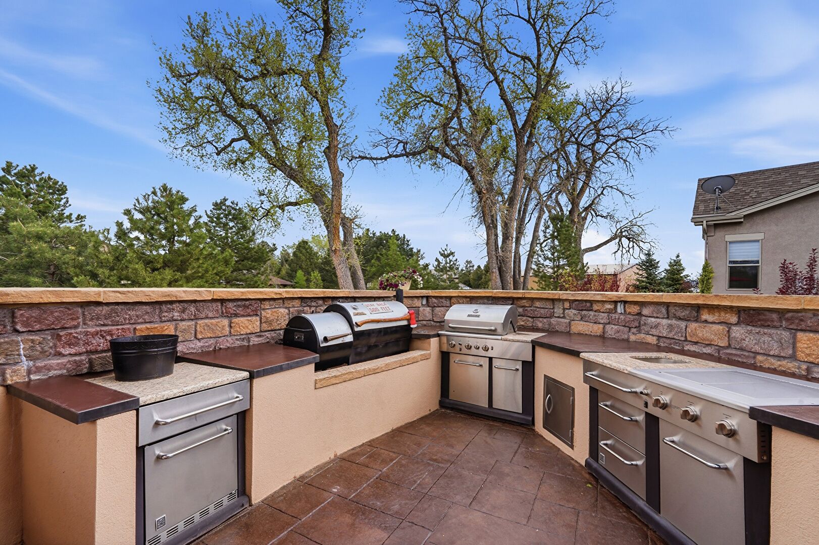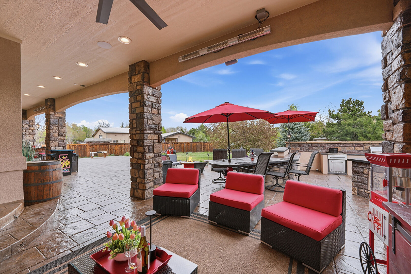 Ceiling Fan, Downspout, Fence, Fire Pit, Grill, Gutters, Lawn, Outdoor Bar, Outdoor Dining Area, Outdoor Kitchen, Outdoor Living Space, Patio, Porch, Satellite Dish, Stone Siding, Stucco Siding, Ceiling Fan, Downspout, Gutters, Outdoor Bar, Outdoor Kitchen, Outdoor Living Space, Patio, Satellite Dish