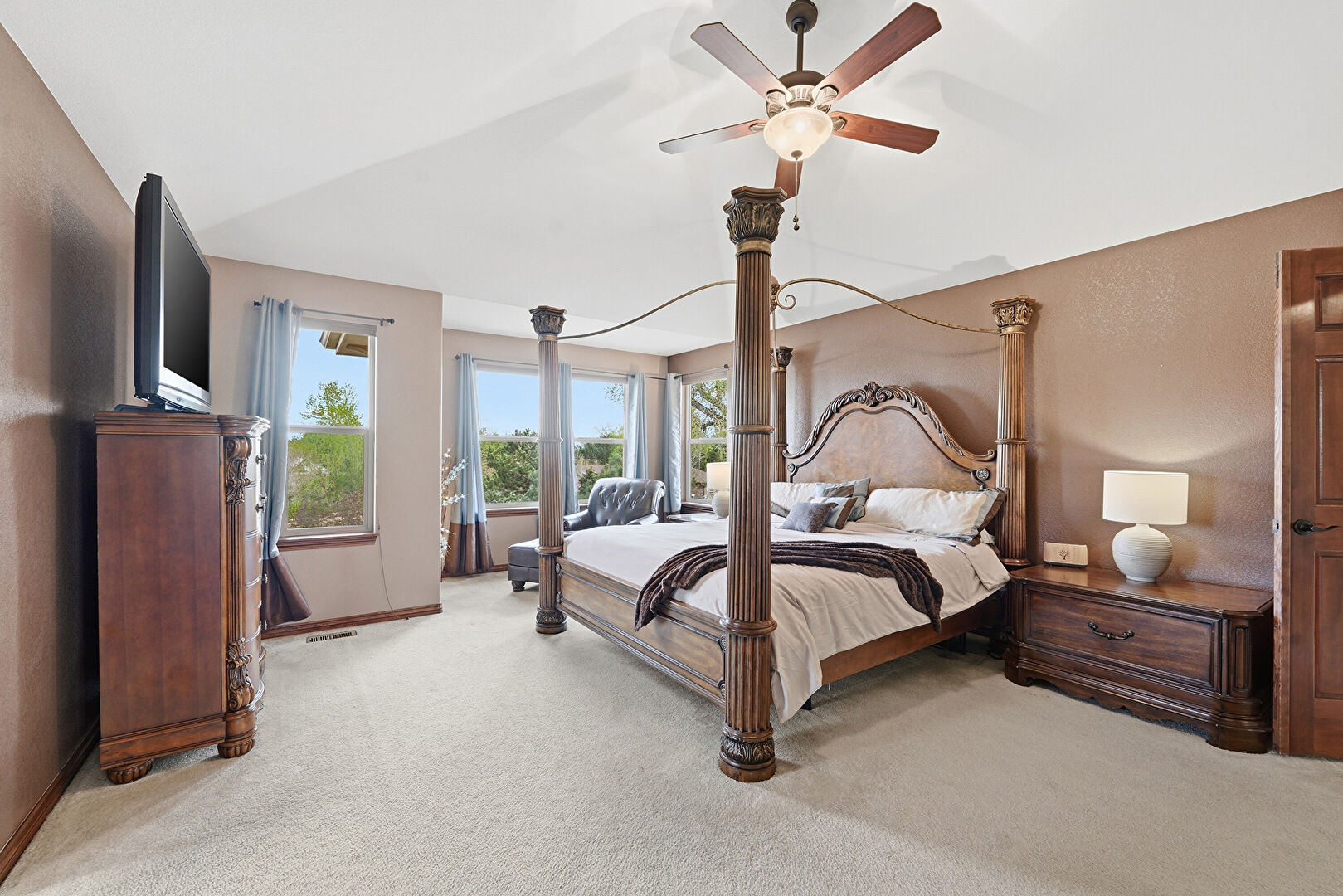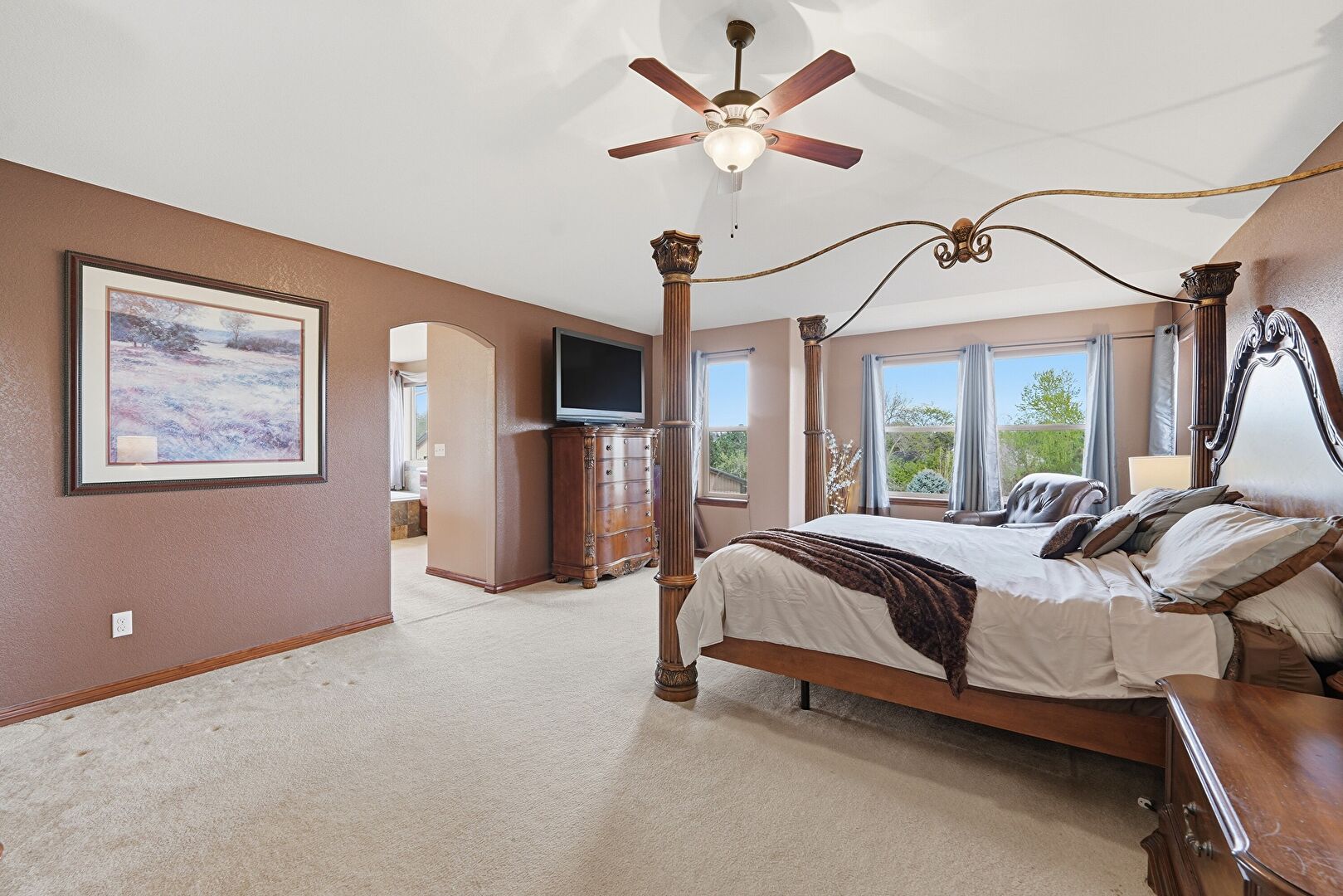 Arched Walkways, Baseboards Wall, Carpet, Ceiling Fan, Drywall, Ensuite Bathroom, Natural Light, Textured Wall, Vaulted Ceiling, Vent, Baseboards Wall, Carpet, Ceiling Fan