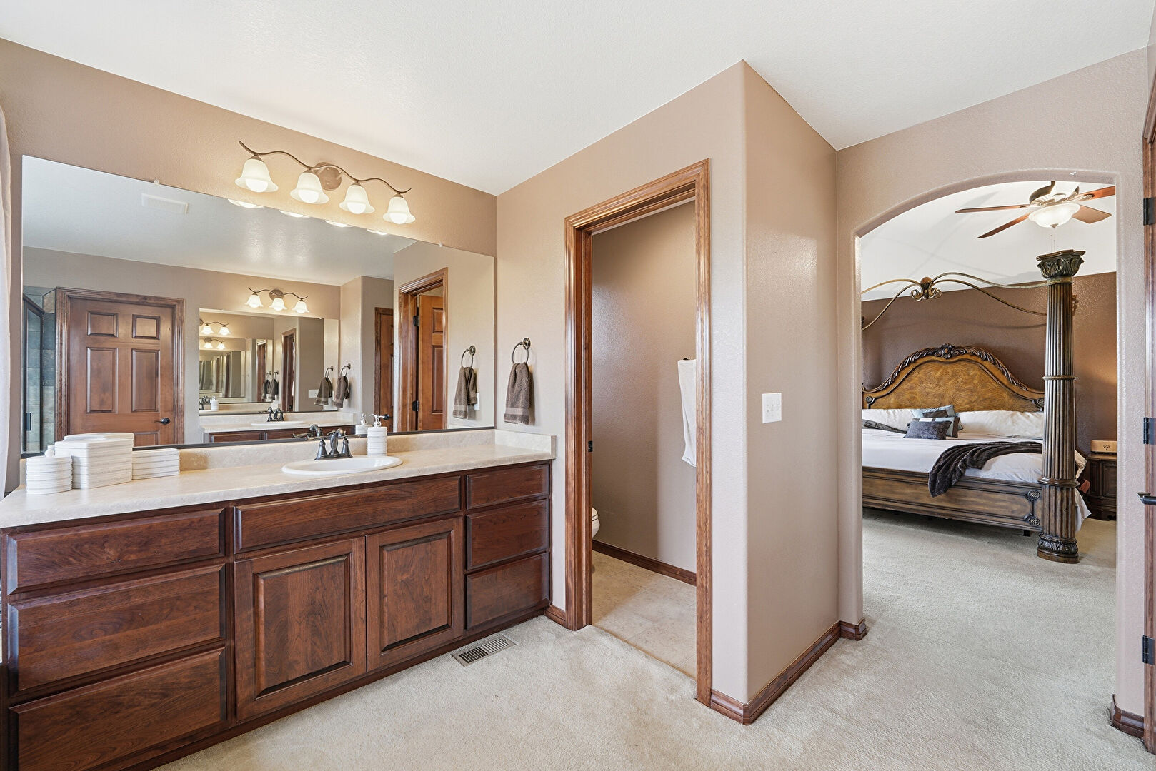 Baseboards Wall, Carpet, Ceiling Fan, Drywall, Ensuite Bathroom, Full Bathroom, Natural Light, Stone Finish Floor, Two Single Vanities, Vanity, Vent, Water Closet, Drywall, Vent
