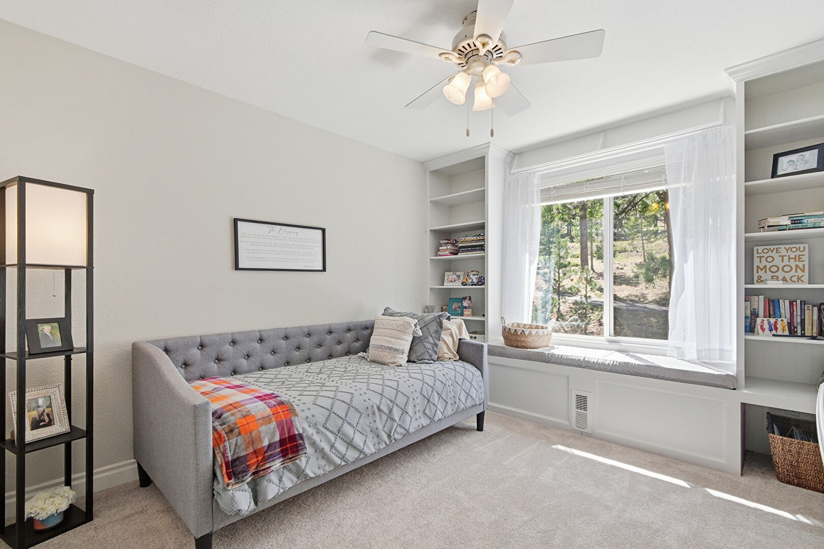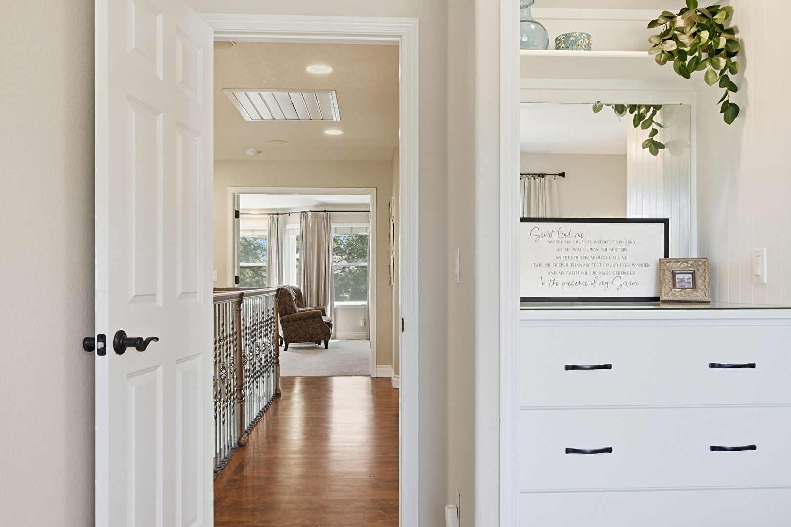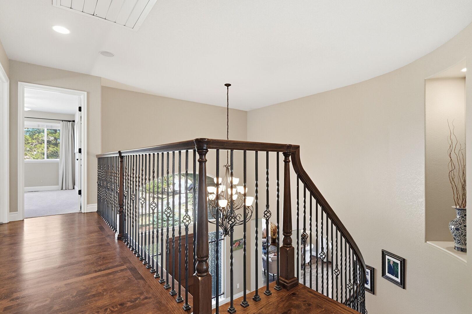 Arched Walkways, Baseboards Wall, Built In Shelves, Drywall, High Ceiling, Natural Light, Notable Chandelier, Recessed Lighting, Stairs, Upstairs Landing, Wood Finish Floor, Baseboards Wall, Vent, Whole House Fan