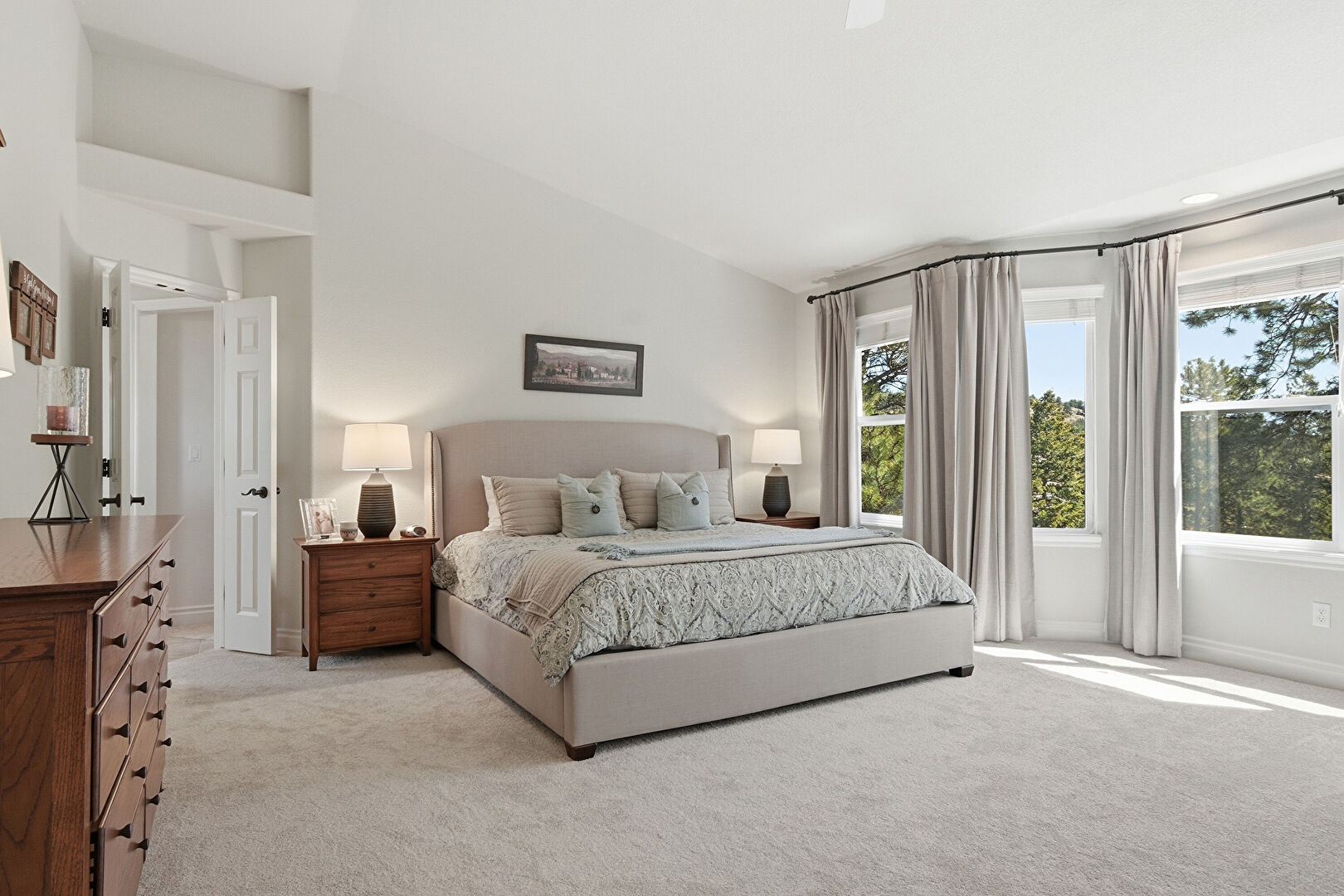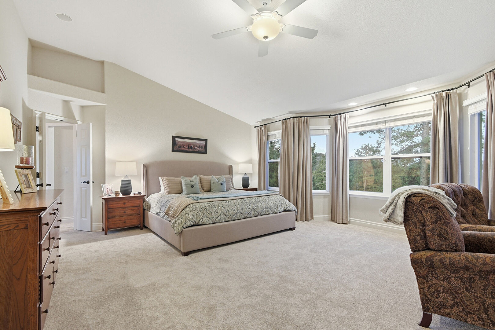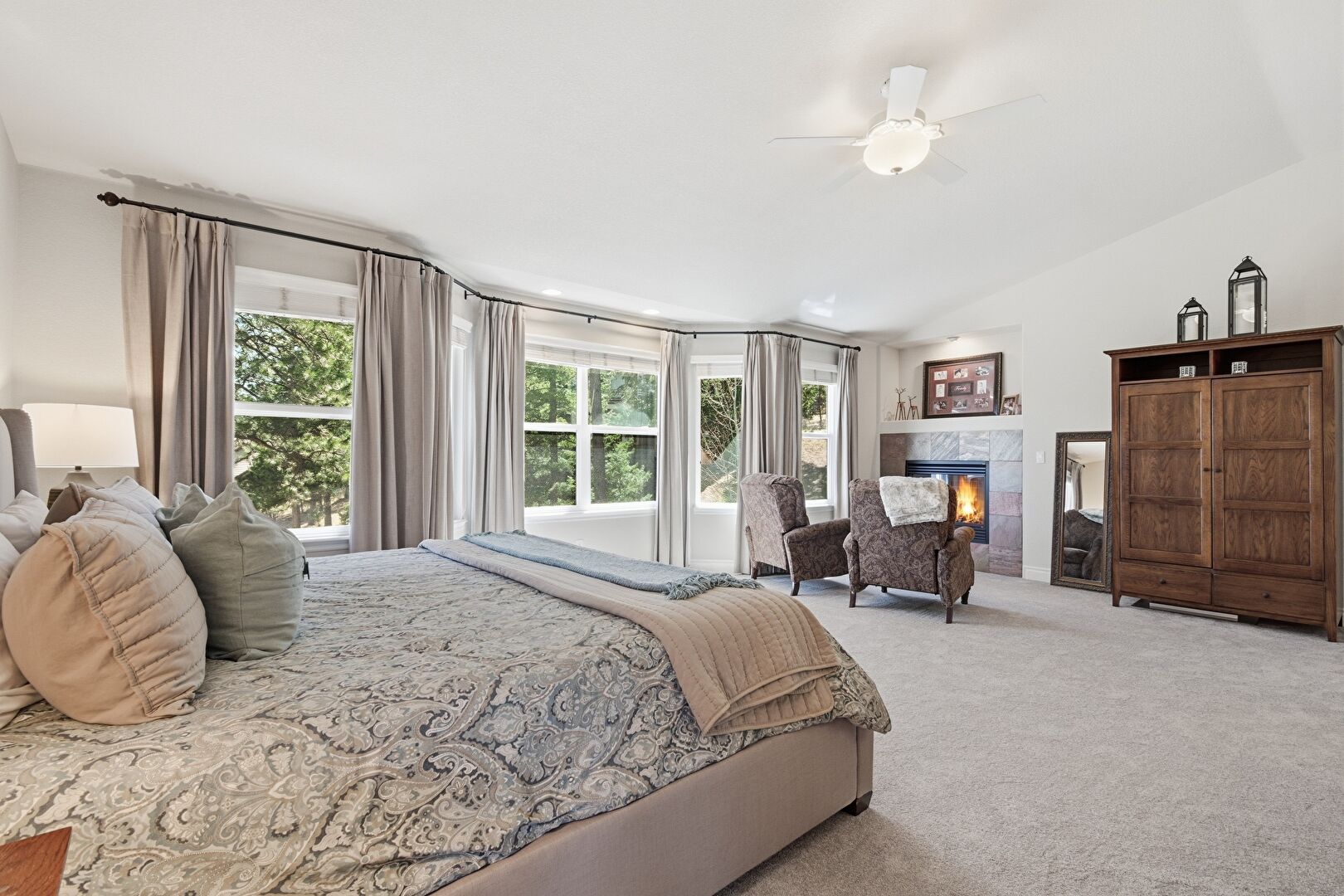 Baseboards Wall, Built In Desk, Carpet, Ceiling Fan, Closet, Drywall, Ensuite Bathroom, Fireplace, High Ceiling, Natural Light, Office Area, Recessed Lighting, Smoke Carbon Monoxide Detector, Vaulted Ceiling, Vent, Baseboards Wall, Carpet, Ceiling Fan, Drywall, High Ceiling, Natural Light, Vaulted Ceiling