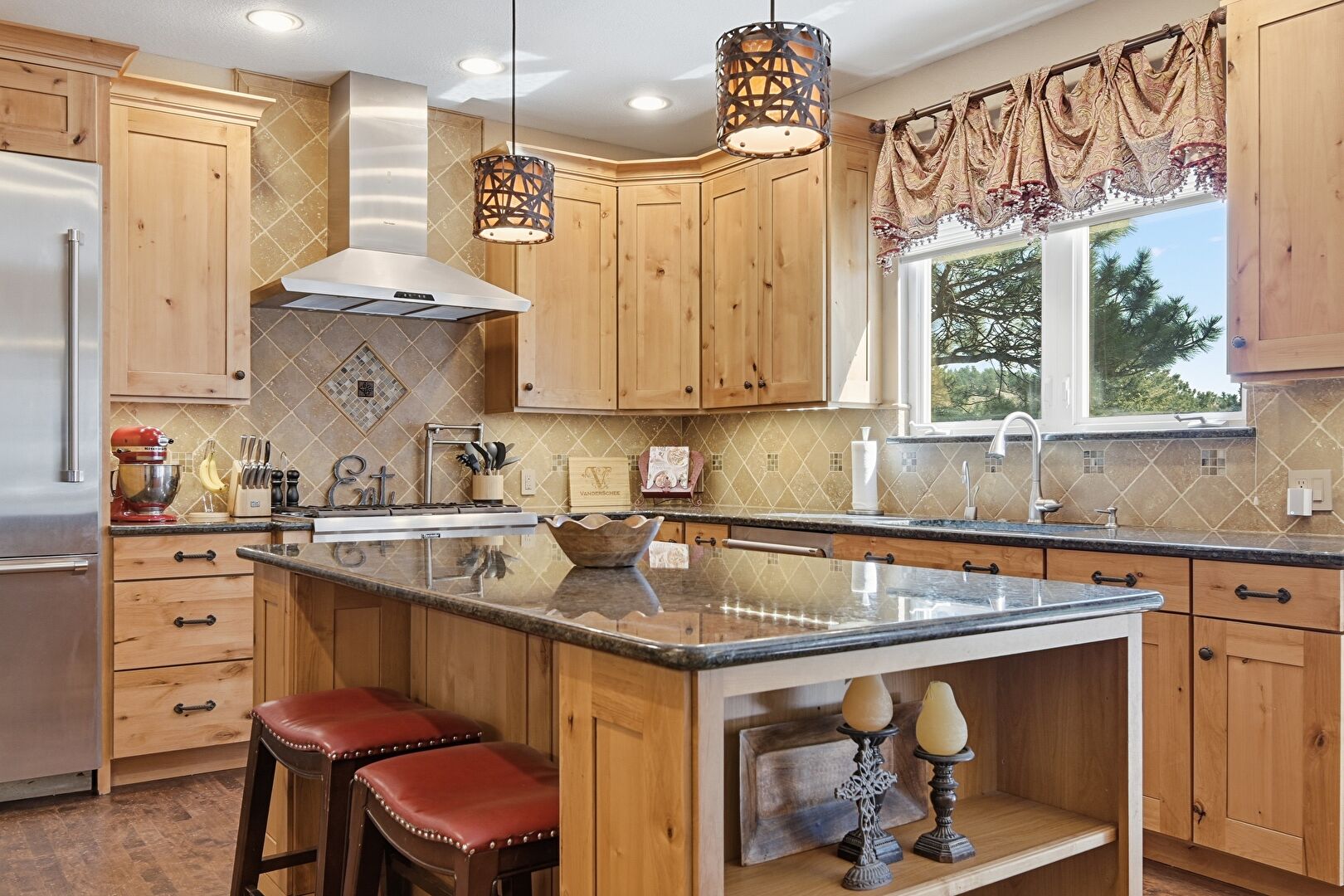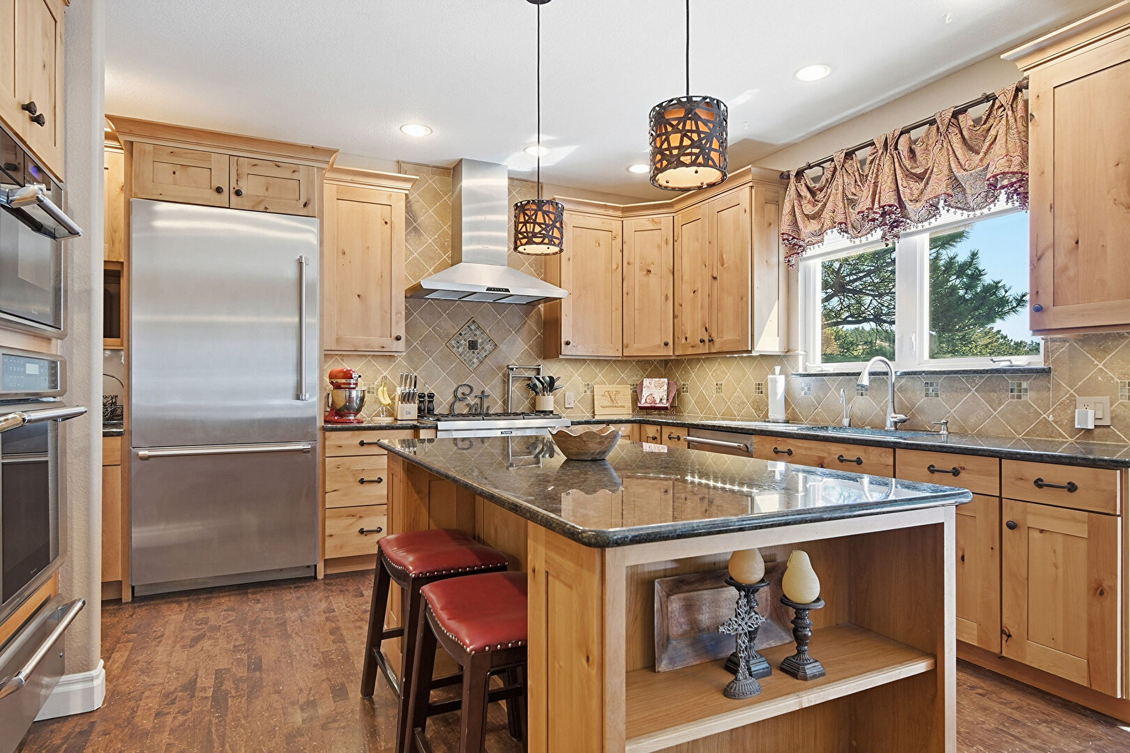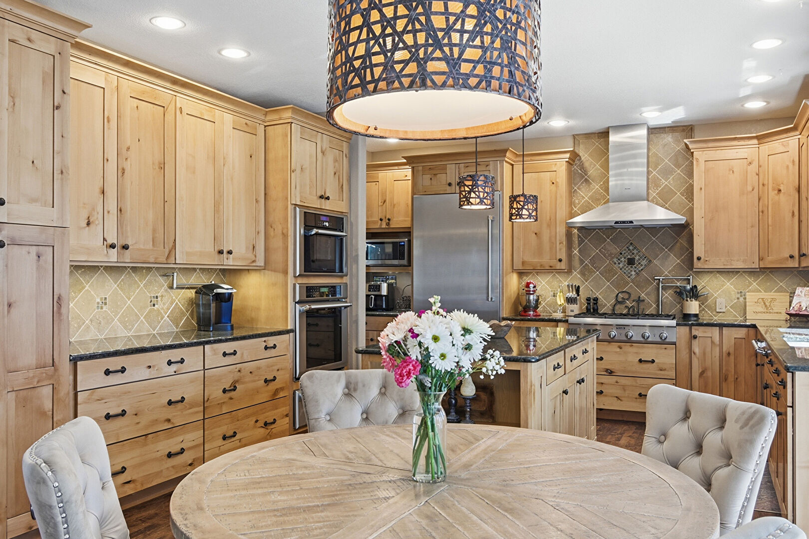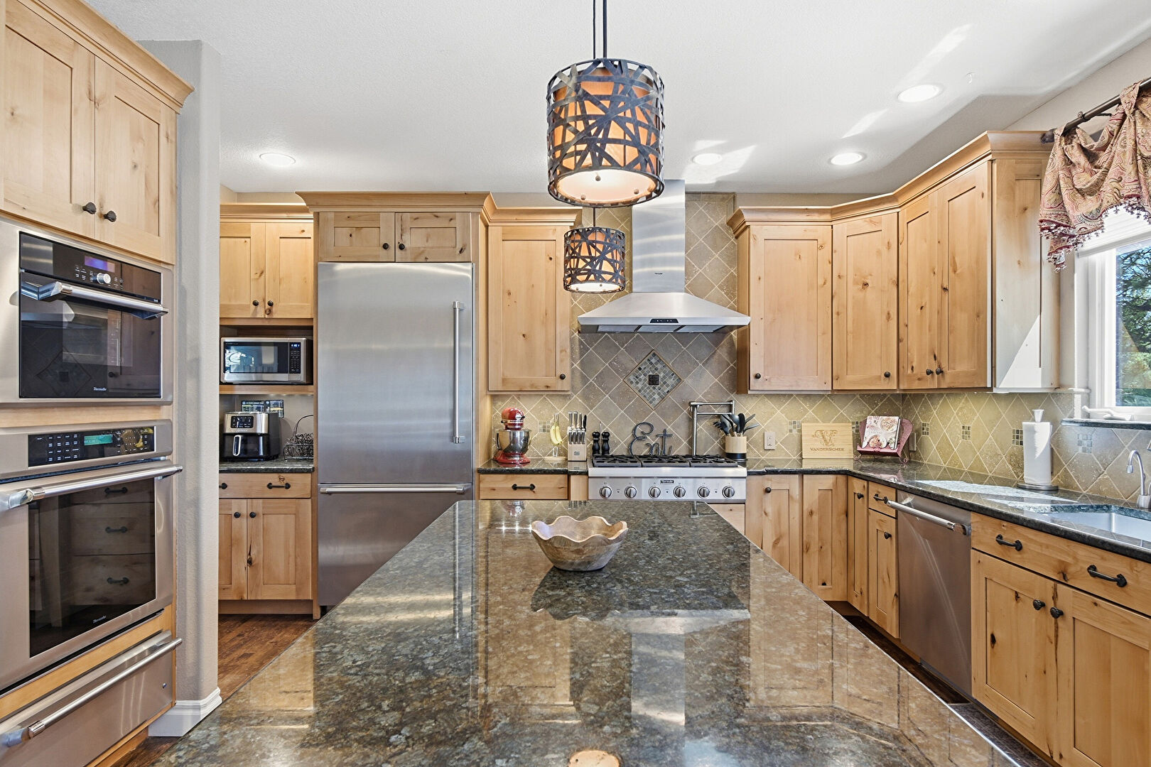 Baseboards Wall, Crown Molding Cabinets, Double Oven, Drywall, Kitchen Bar, Kitchen Island, Kitchen Peninsula, Medium Brown Cabinets, Natural Light, Notable Chandelier, Open Shelves, Pendant Lighting, Pot Filler, Raised Cabinets, Recessed Lighting, Shaker Cabinets, Stone Countertops, Stone Finish Floor, Textured Wall, U Shaped Kitchen, Vent, Warming Drawer, Wood Finish Floor, Baseboards Wall, Crown Molding Cabinets, Drywall, Kitchen Peninsula, Natural Light, Pendant Lighting, Raised Cabinets, Stone Countertops, Wood Finish Floor