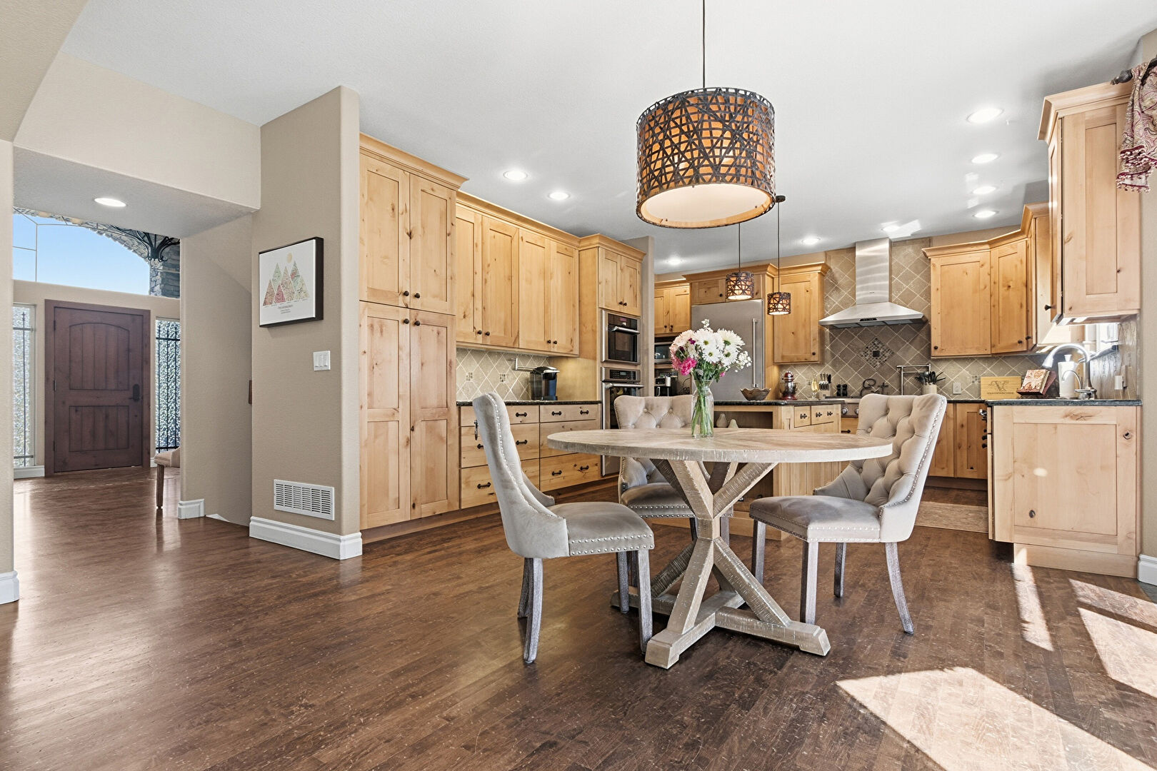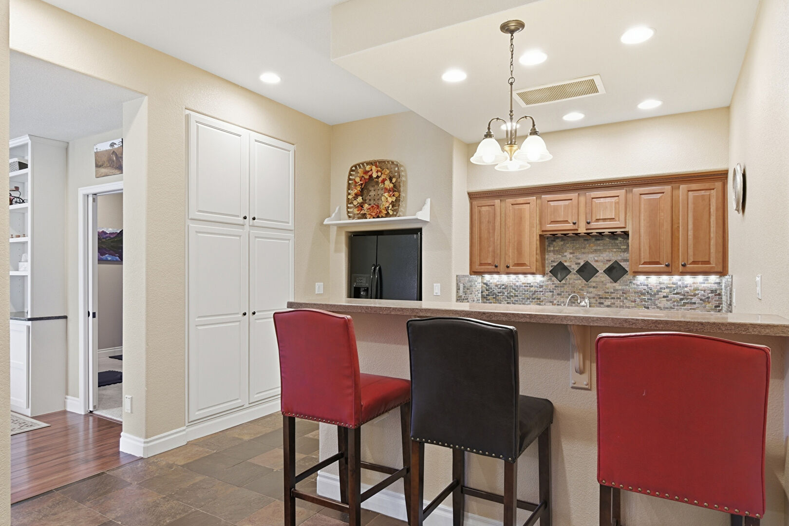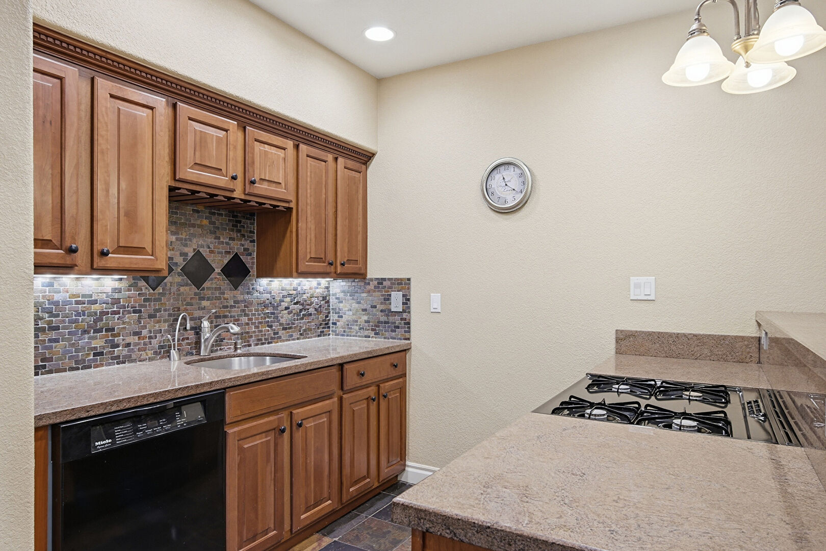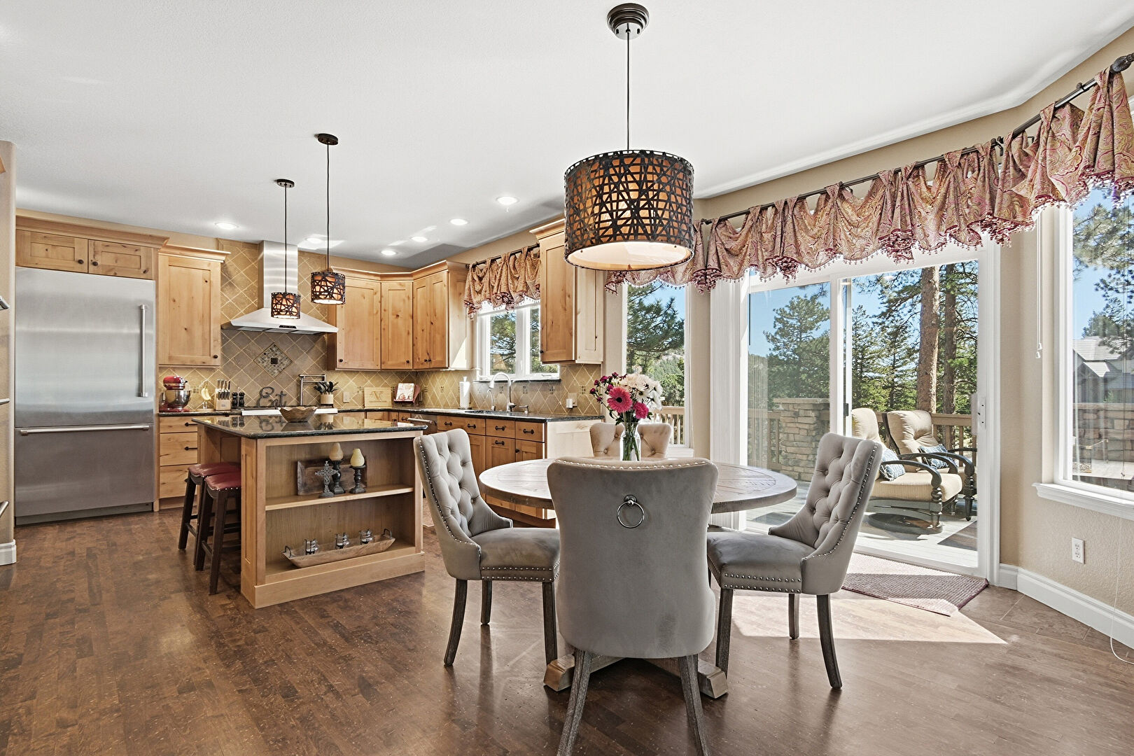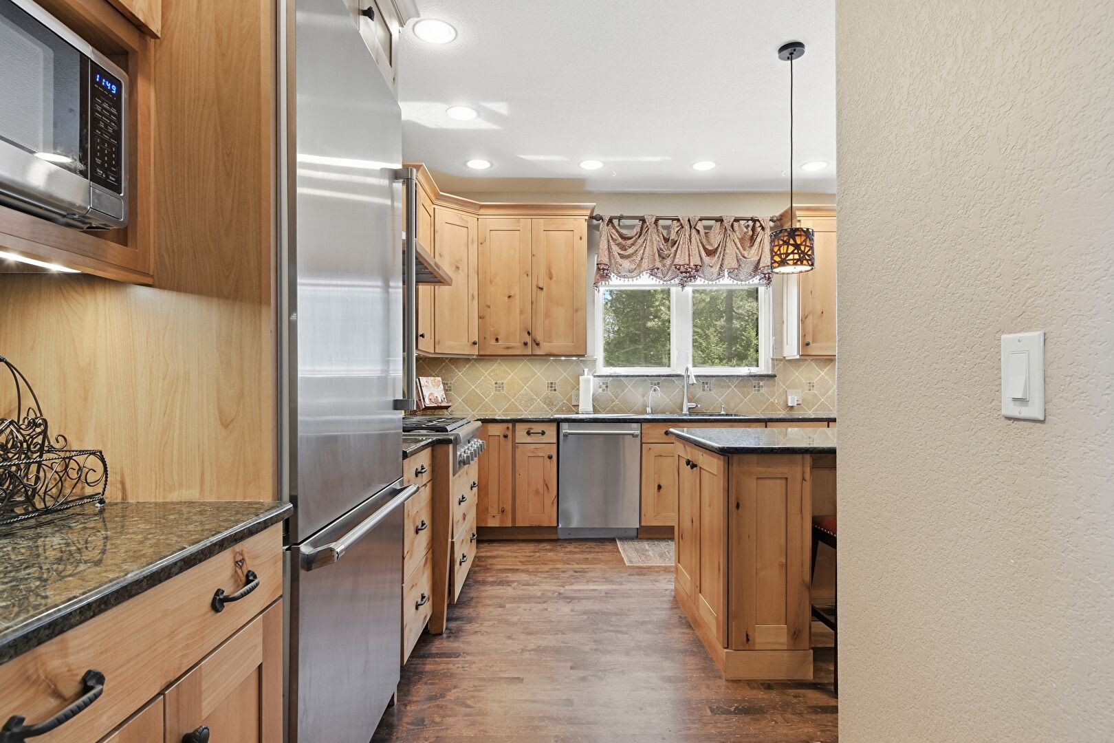 Baseboards Wall, Crown Molding Cabinets, Double Oven, Drywall, Kitchen Bar, Kitchen Island, Kitchen Peninsula, Medium Brown Cabinets, Natural Light, Notable Chandelier, Open Shelves, Pendant Lighting, Pot Filler, Raised Cabinets, Recessed Lighting, Shaker Cabinets, Stone Countertops, Stone Finish Floor, Textured Wall, U Shaped Kitchen, Vent, Warming Drawer, Wood Finish Floor, Baseboards Wall, Crown Molding Cabinets, Drywall, Kitchen Peninsula, Natural Light, Pendant Lighting, Raised Cabinets, Stone Countertops, Wood Finish Floor