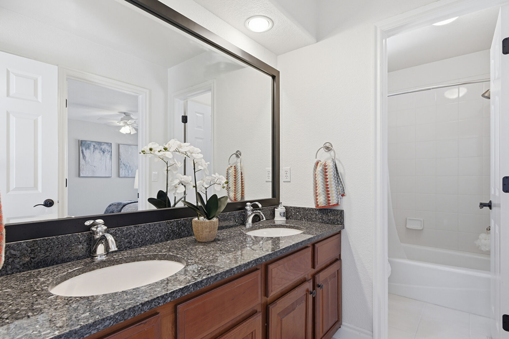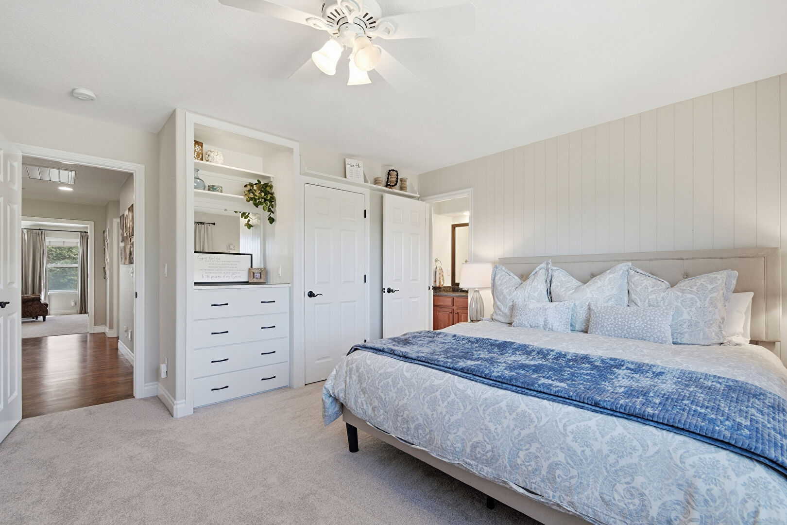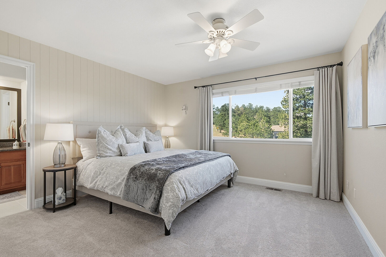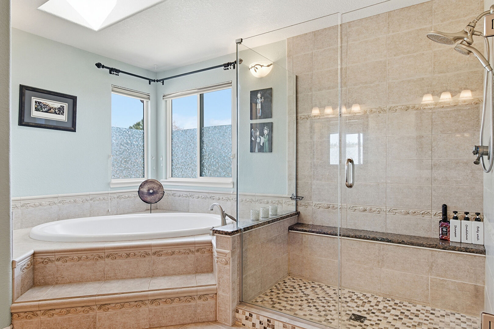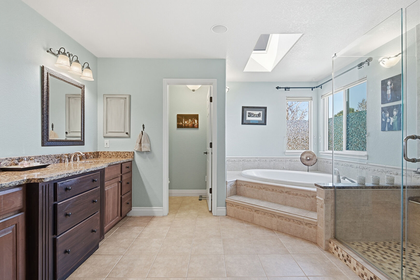 Baseboards Wall, Ceiling Fan, Combined Bath Shower, Double Vanity, Drywall, Ensuite Bathroom, Full Bathroom, Half Bathroom, Natural Light, Skylight, Textured Ceiling, Textured Wall, Tile Floor, Vanity, Vent, Carpet, Combined Bath Shower, Double Vanity, Skylight, Vanity