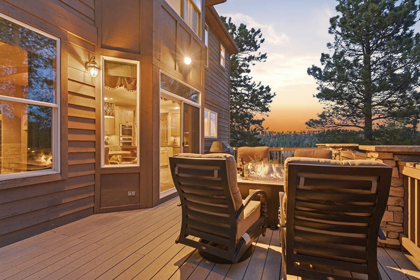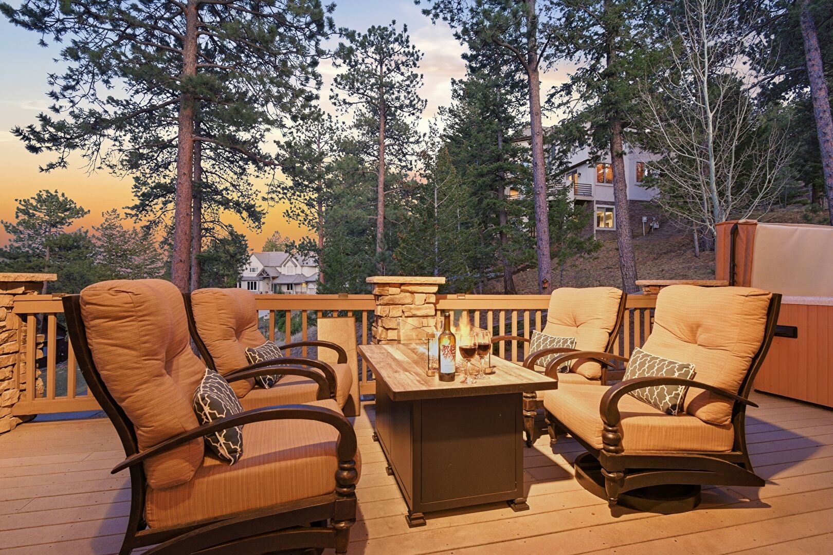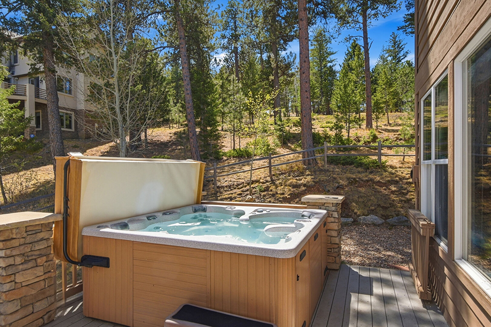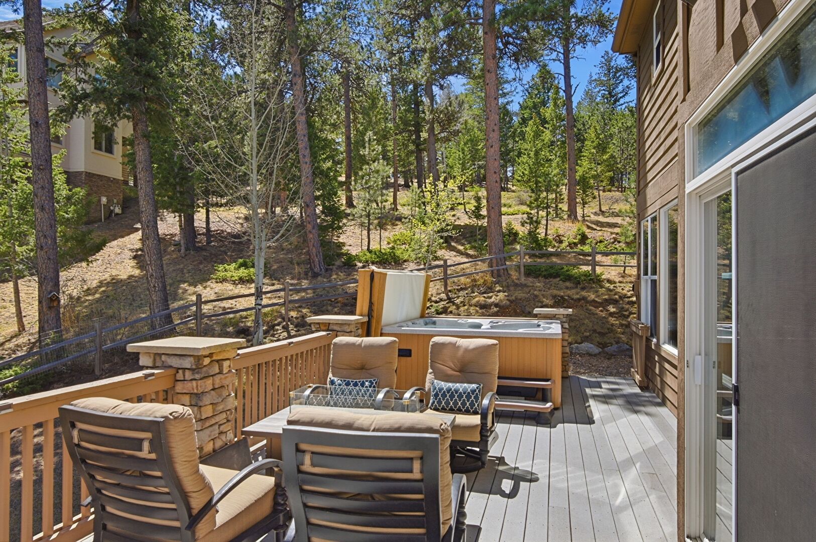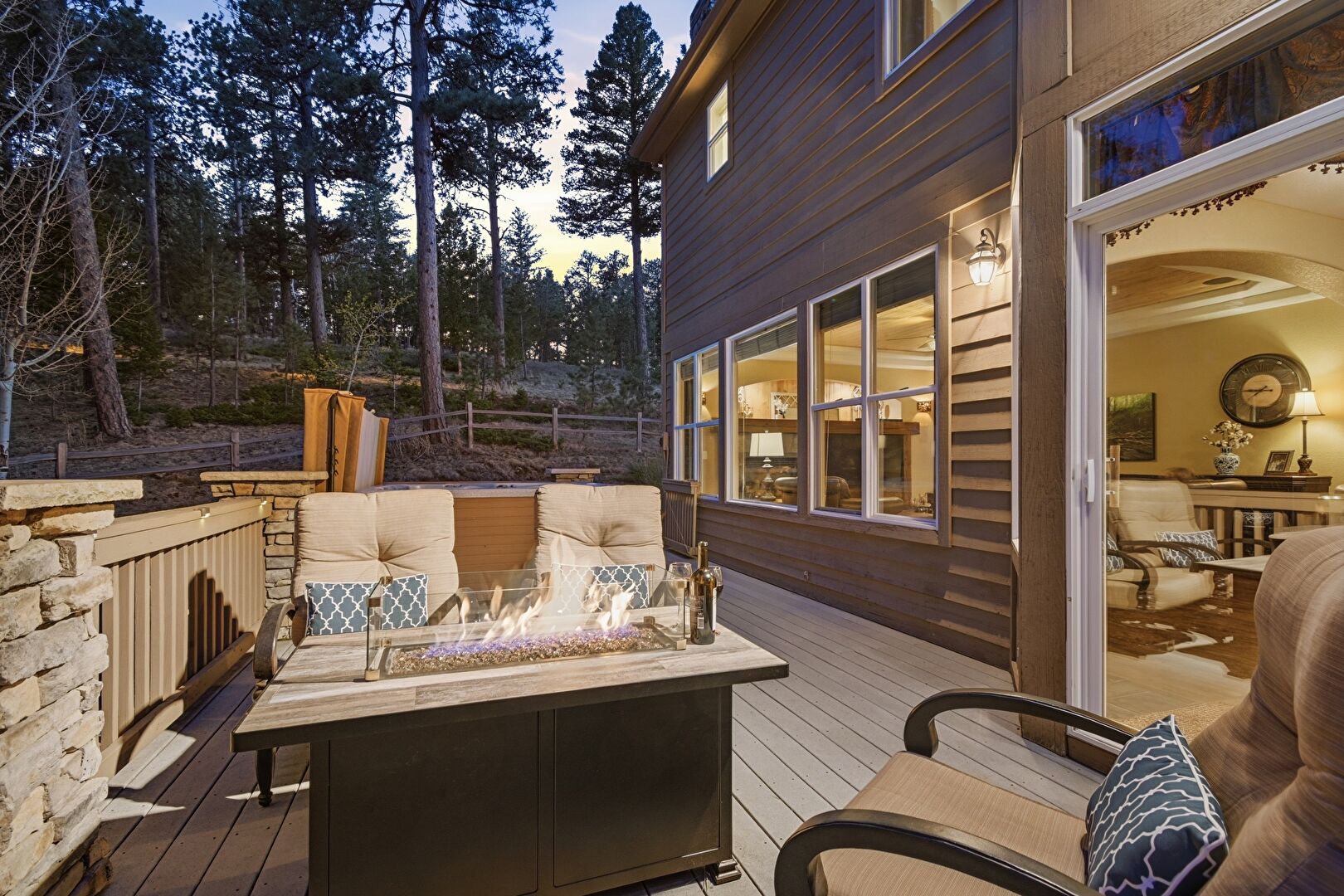 Deck, Fence, Fire Pit, Grill, Hot Tub, Woods View, Deck, Hot Tub, Lawn, Outdoor Dining Area, Outdoor Living Space, Woods View