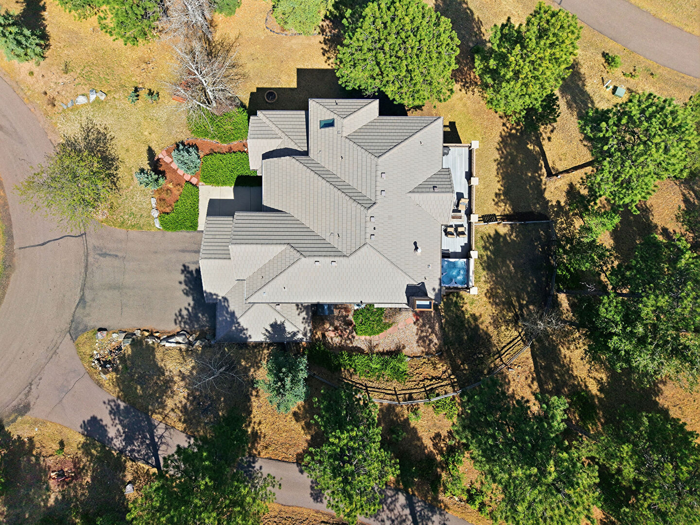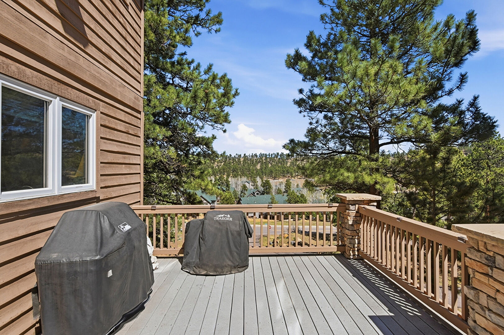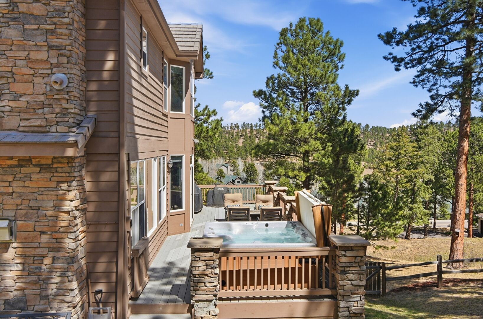 Central Ac, Chimney, Deck, Electric Meter, Fence, Grill, Gutters, Horizontal Siding, Hot Tub, Stone Siding, Tile Roof, Woods View, Balcony, Deck, Downspout