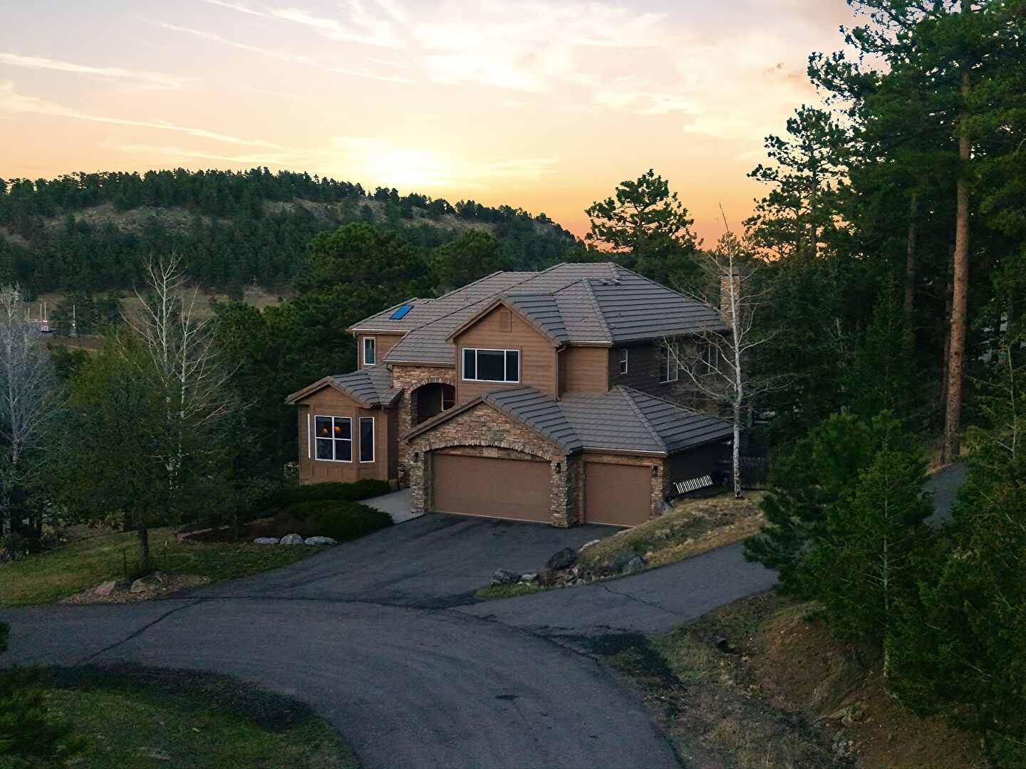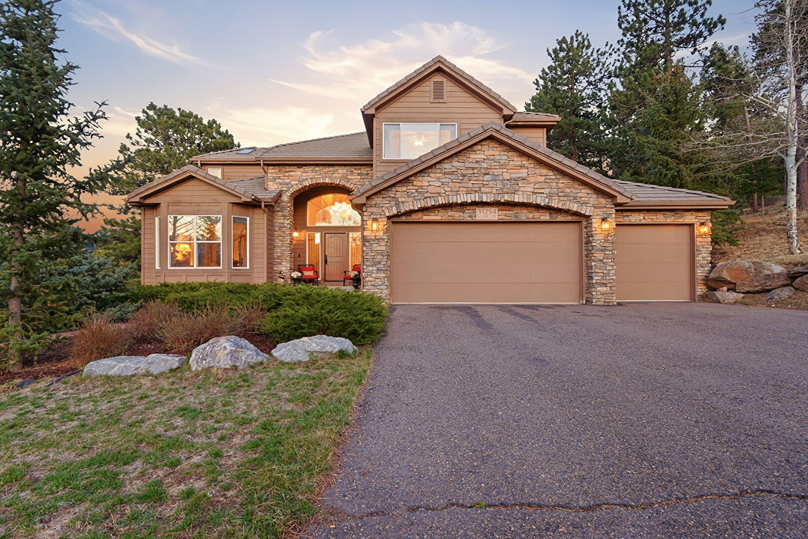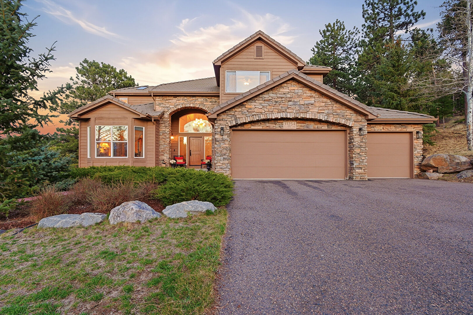 Built In Garage, Chimney, Downspout, Driveway, Forest View, Gutters, Horizontal Siding, Lawn, Stone Siding, Tile Roof, Woods View, Downspout, Driveway, Horizontal Siding, Stone Siding, Tile Roof