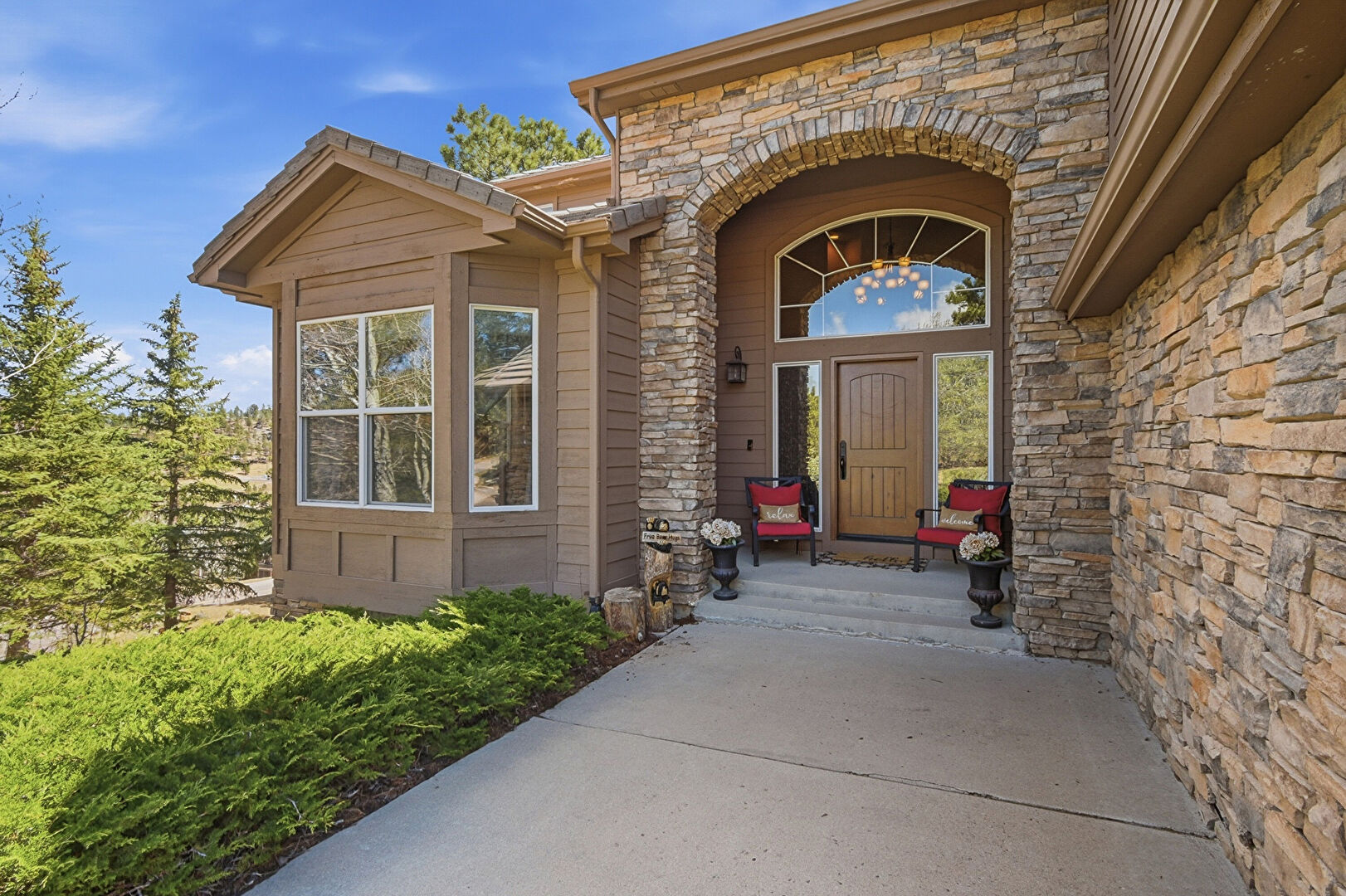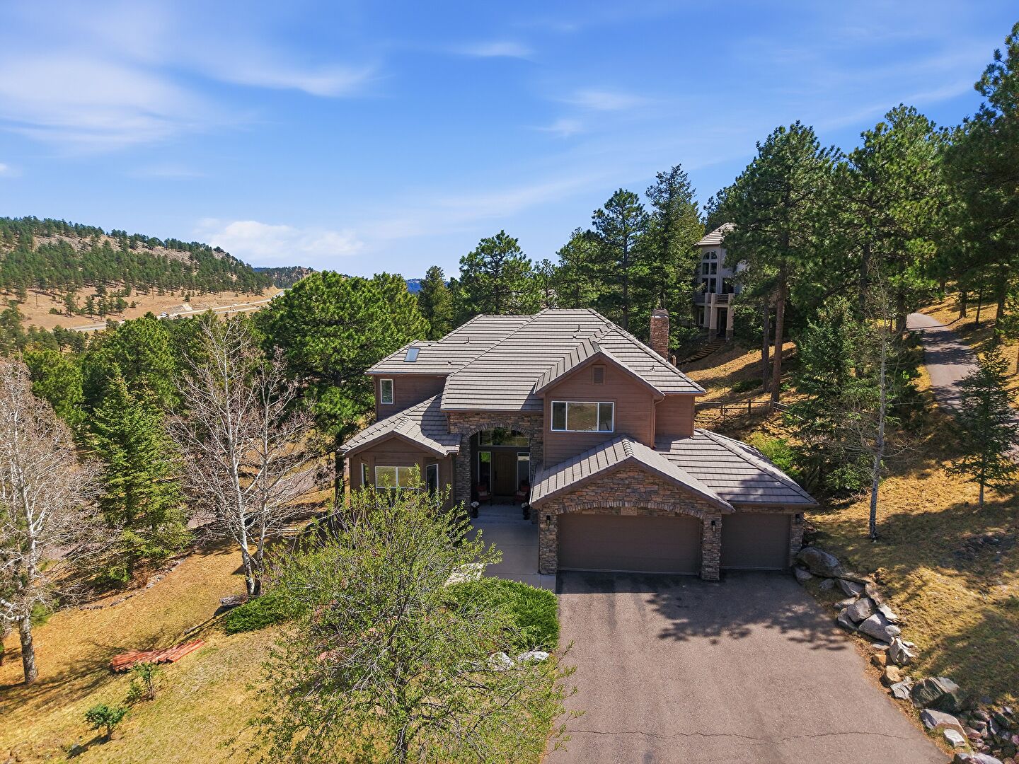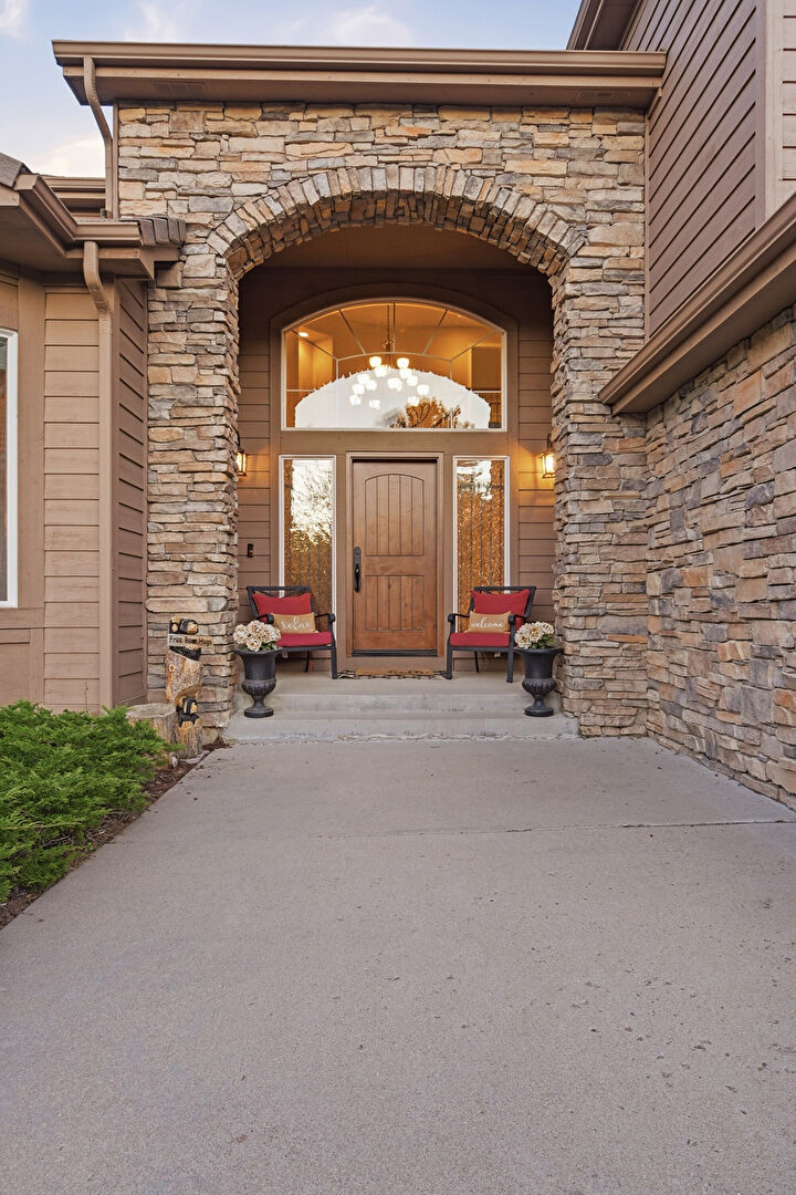 Built In Garage, Chimney, Downspout, Driveway, Forest View, Gutters, Horizontal Siding, Lawn, Stone Siding, Tile Roof, Woods View, Downspout, Driveway, Horizontal Siding, Stone Siding, Tile Roof