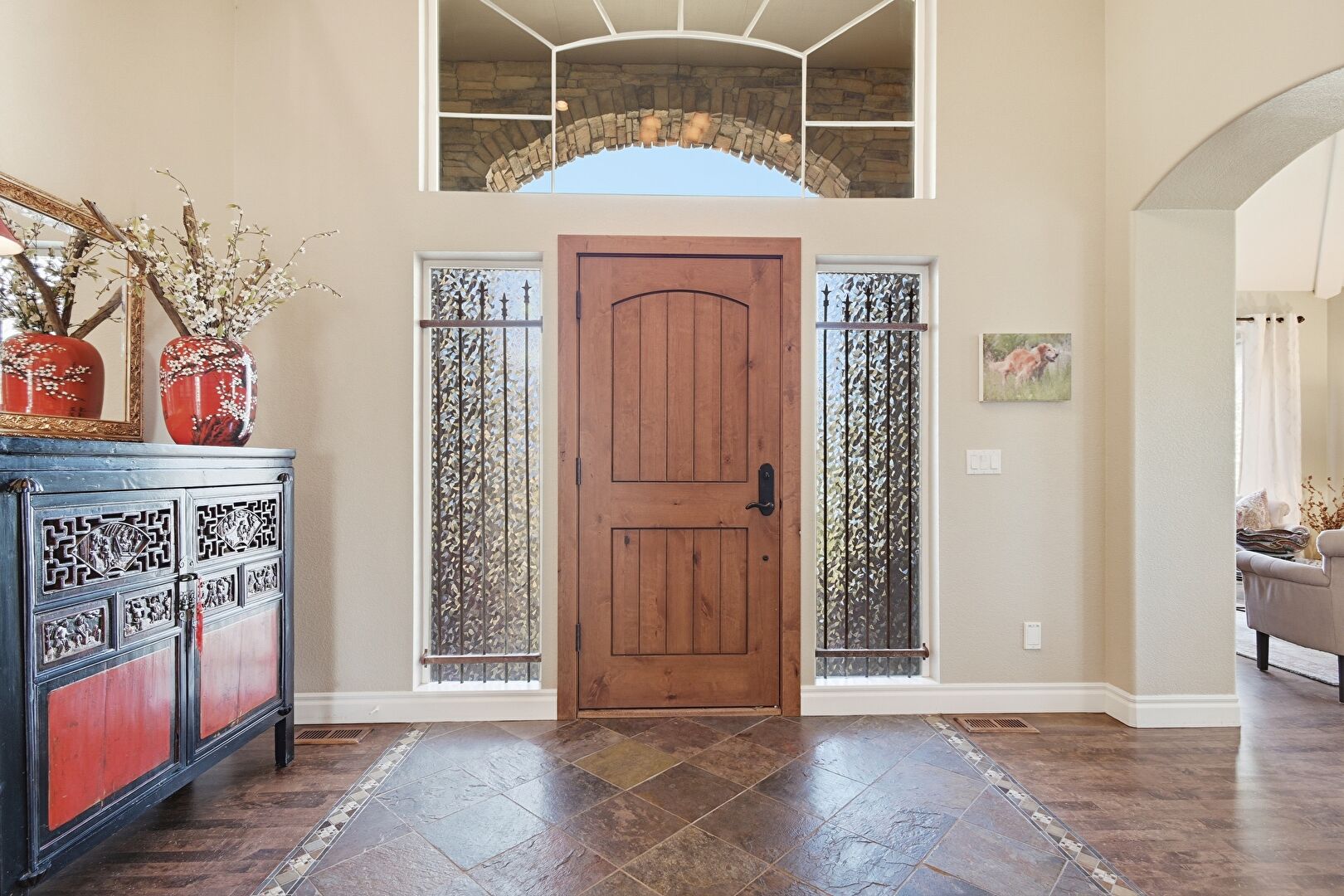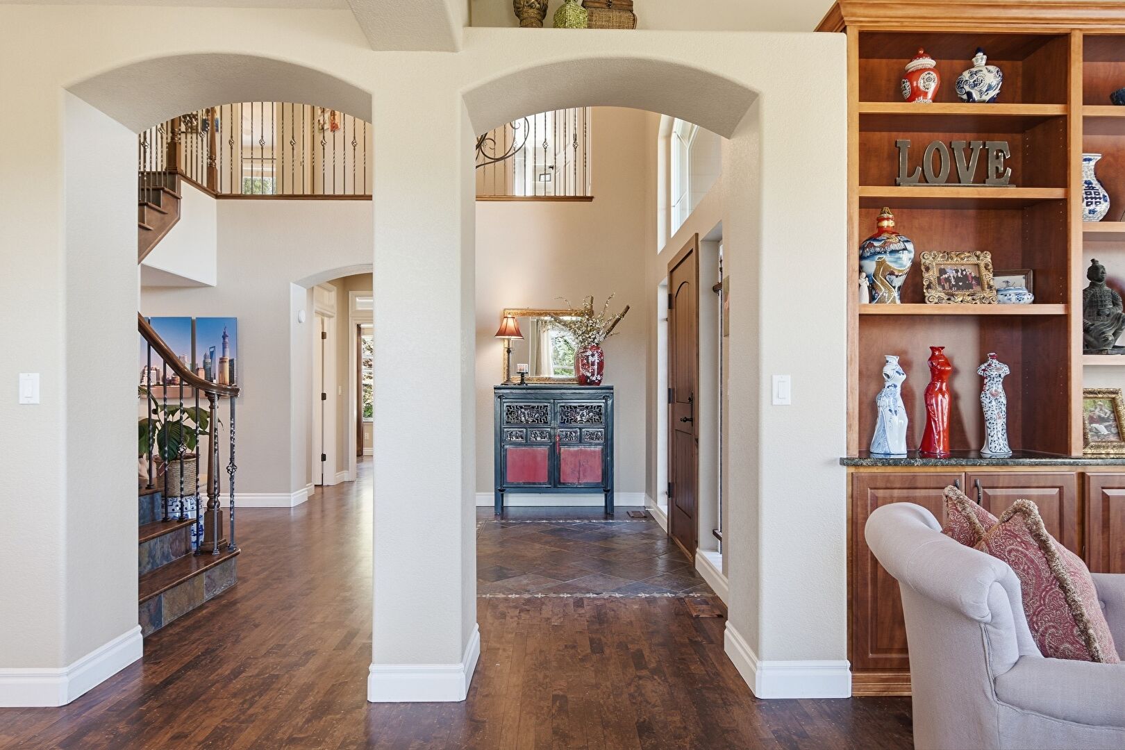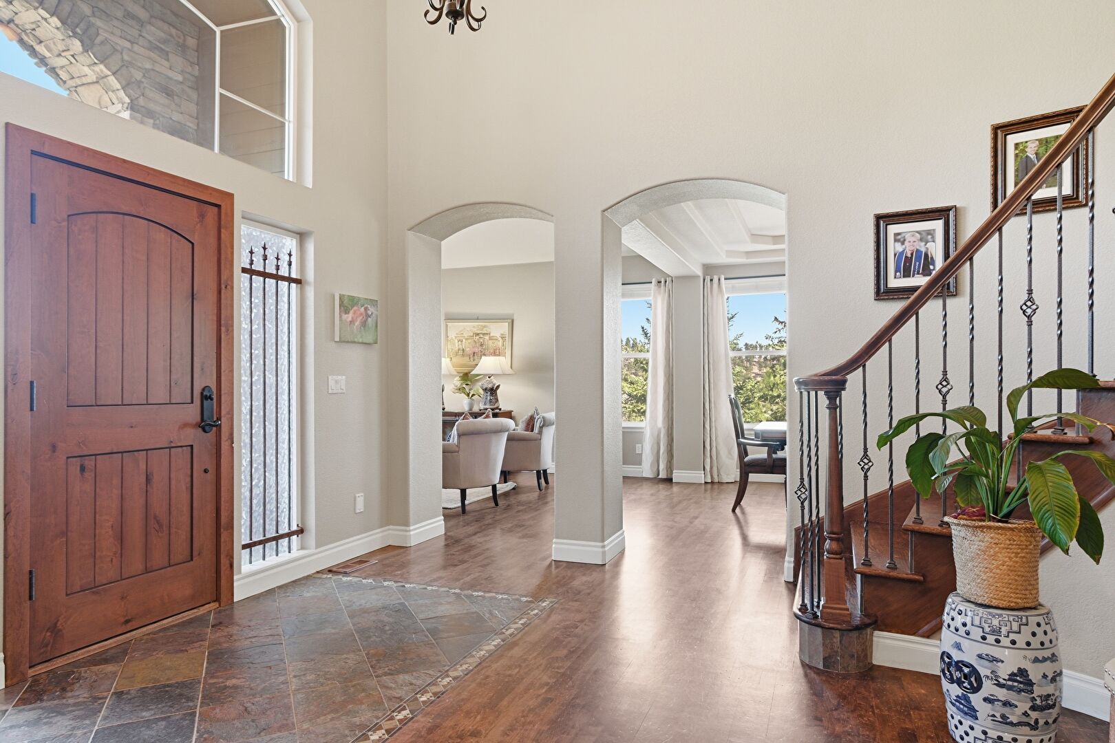Arched Walkways, Baseboards Wall, Drywall, High Ceiling, Inlaid Floor, Notable Chandelier, Recessed Lighting, Stairs, Stone Finish Floor, Wood Finish Floor, Natural Light