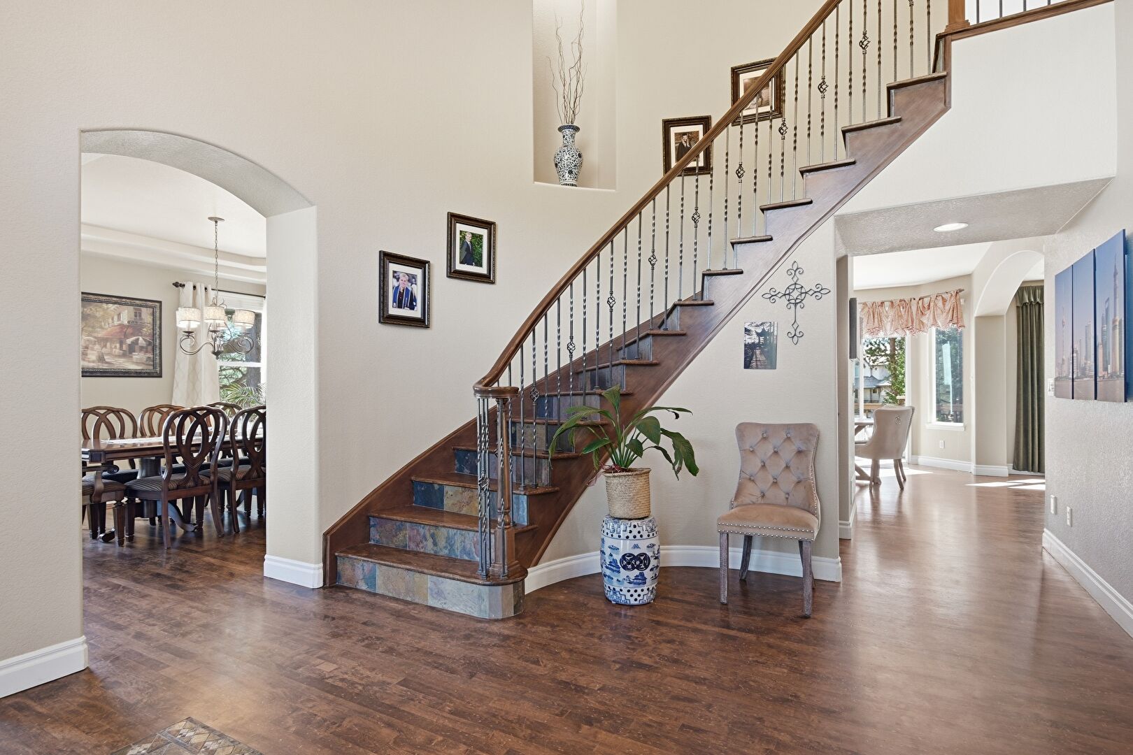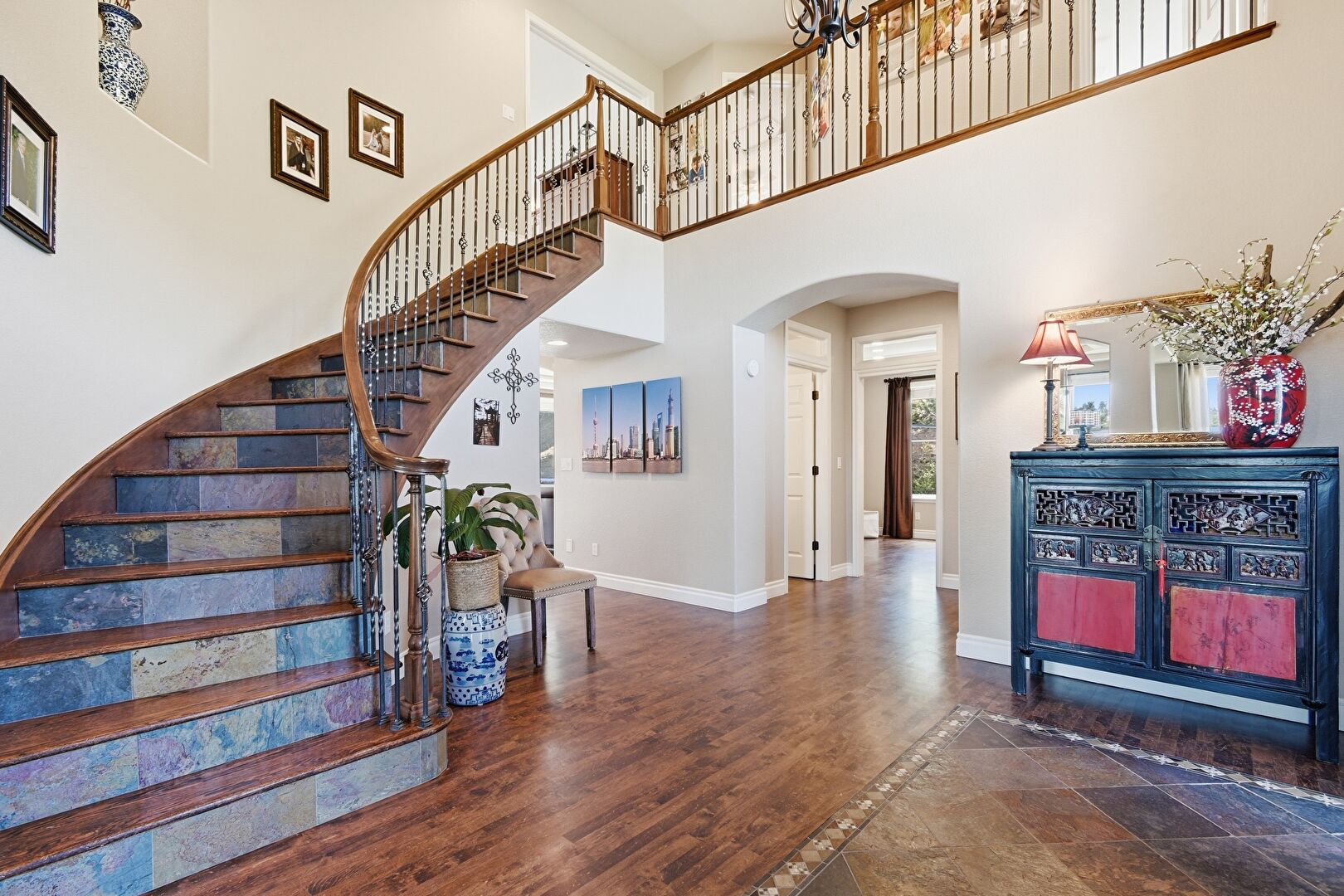 Arched Walkways, Baseboards Wall, Drywall, High Ceiling, Natural Light, Stairs, Stone Finish Floor, Vent, Wood Finish Floor, Drywall, Stone Finish Floor