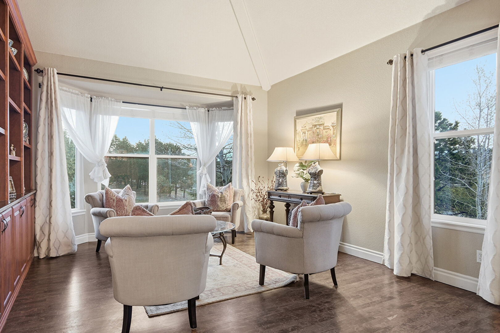Baseboards Wall, Drywall, Fireplace, High Ceiling, Natural Light, Vaulted Ceiling, Wood Finish Floor, Carpet, Natural Light, Wood Finish Floor