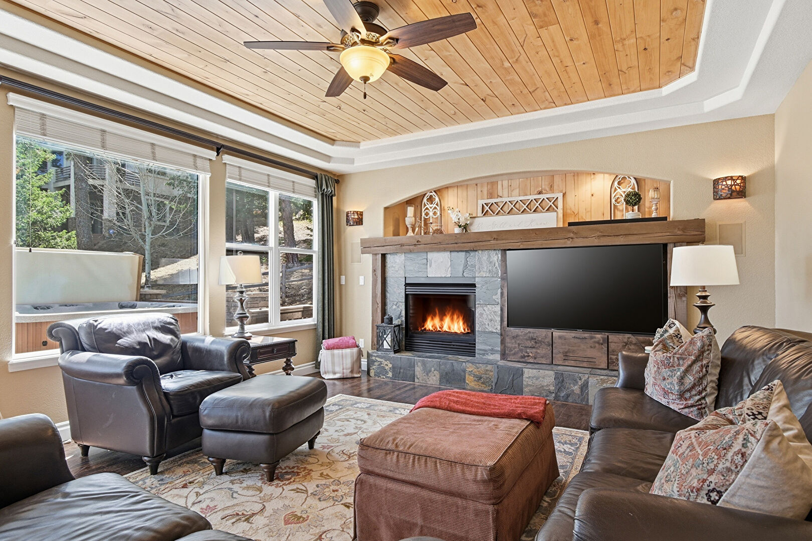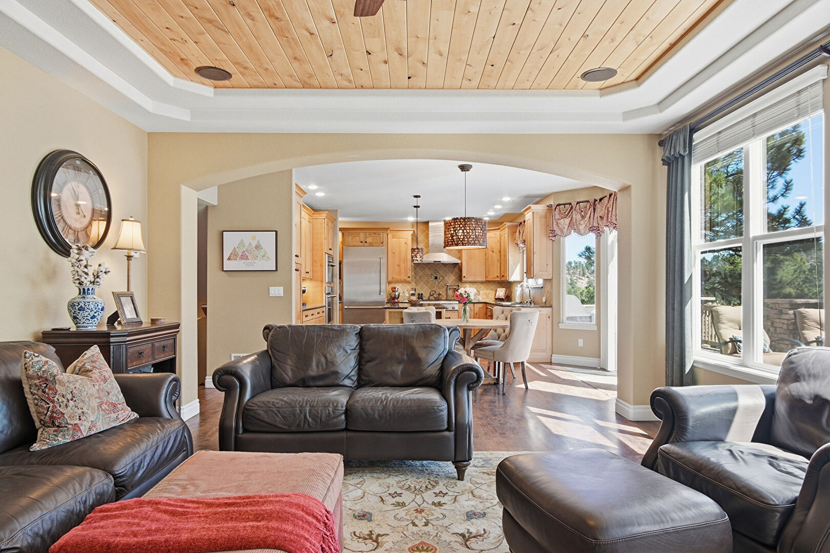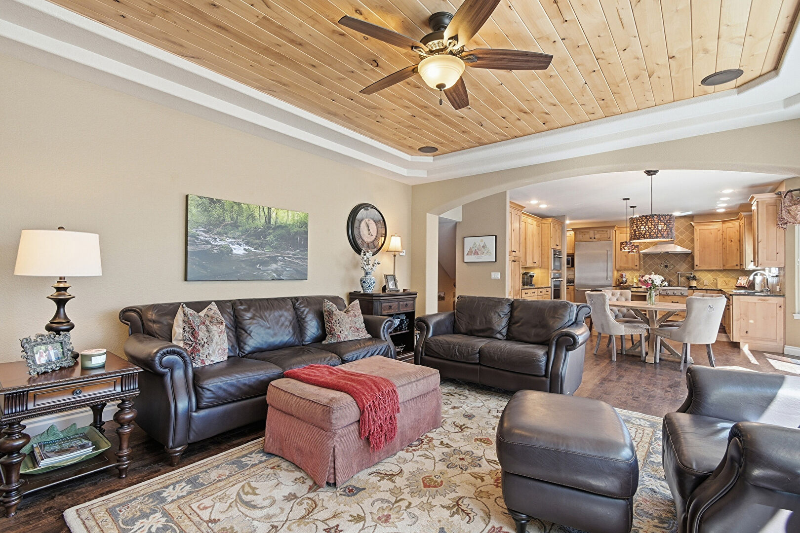 Arched Walkways, Baseboards Wall, Beamed Ceiling, Built In Shelves, Ceiling Fan, Double Oven, Drywall, Fireplace, High Ceiling, L Shaped Kitchen, Natural Light, Notable Chandelier, Recessed Lighting, Tray Ceiling, Vent, Wood Ceiling, Wood Finish Floor, Baseboards Wall, Drywall, Recessed Lighting, Vaulted Ceiling, Vent, Wood Ceiling, Wood Finish Floor