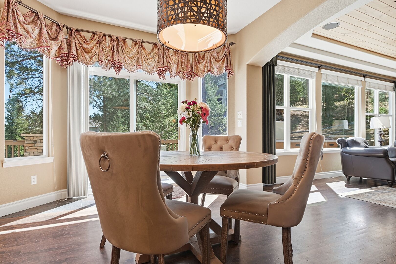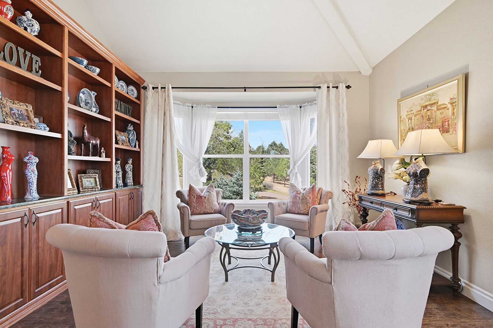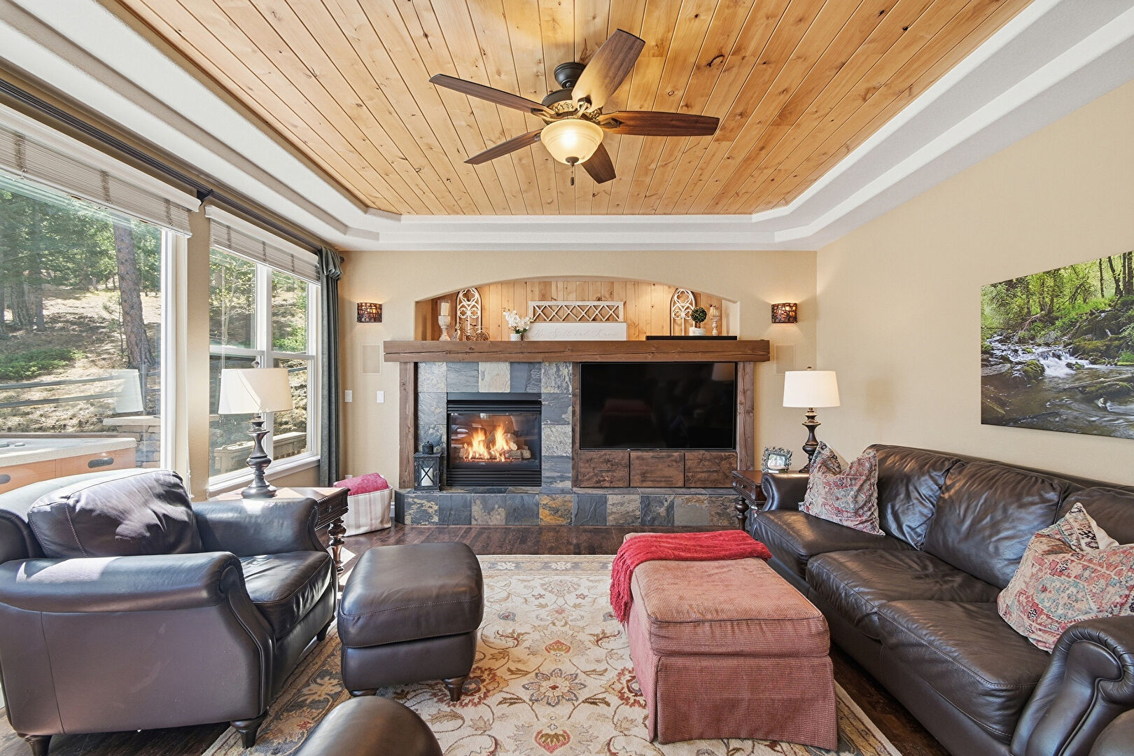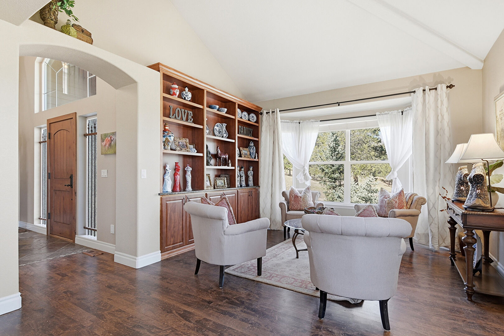 Arched Walkways, Baseboards Wall, Beamed Ceiling, Built In Shelves, Ceiling Fan, Double Oven, Drywall, Fireplace, High Ceiling, L Shaped Kitchen, Natural Light, Notable Chandelier, Recessed Lighting, Tray Ceiling, Vent, Wood Ceiling, Wood Finish Floor, Baseboards Wall, Drywall, Recessed Lighting, Vaulted Ceiling, Vent, Wood Ceiling, Wood Finish Floor