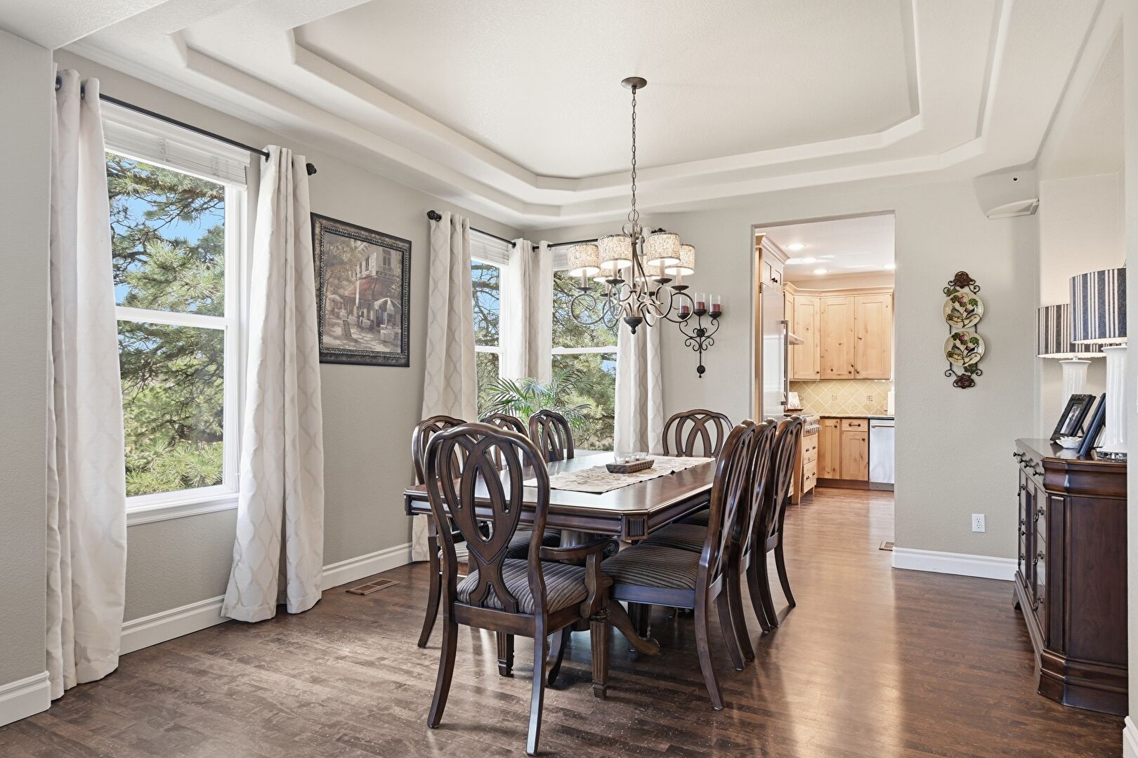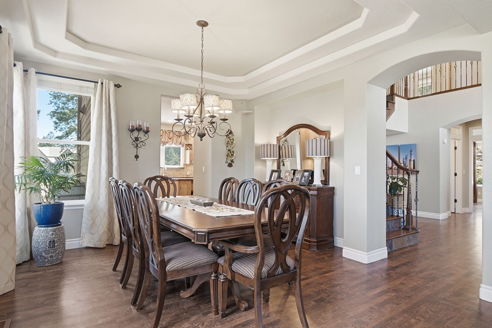 Arched Walkways, Baseboards Wall, Double Oven, Drywall, High Ceiling, Natural Light, Notable Chandelier, Recessed Lighting, Stairs, Sunroom, Tray Ceiling, Vent, Wood Finish Floor, Baseboards Wall, Notable Chandelier, Recessed Lighting, Textured Wall, Tray Ceiling, U Shaped Kitchen