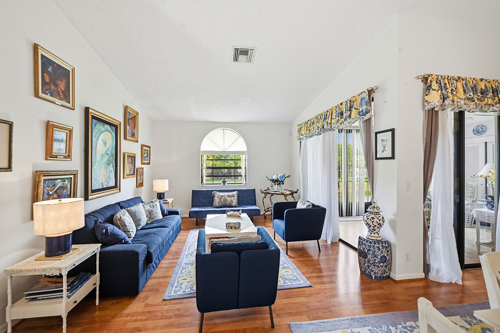 Drywall, Natural Light, Notable Chandelier, Textured Ceiling, Tile Floor, Vent, Wood Finish Floor, Notable Chandelier, Vaulted Ceiling