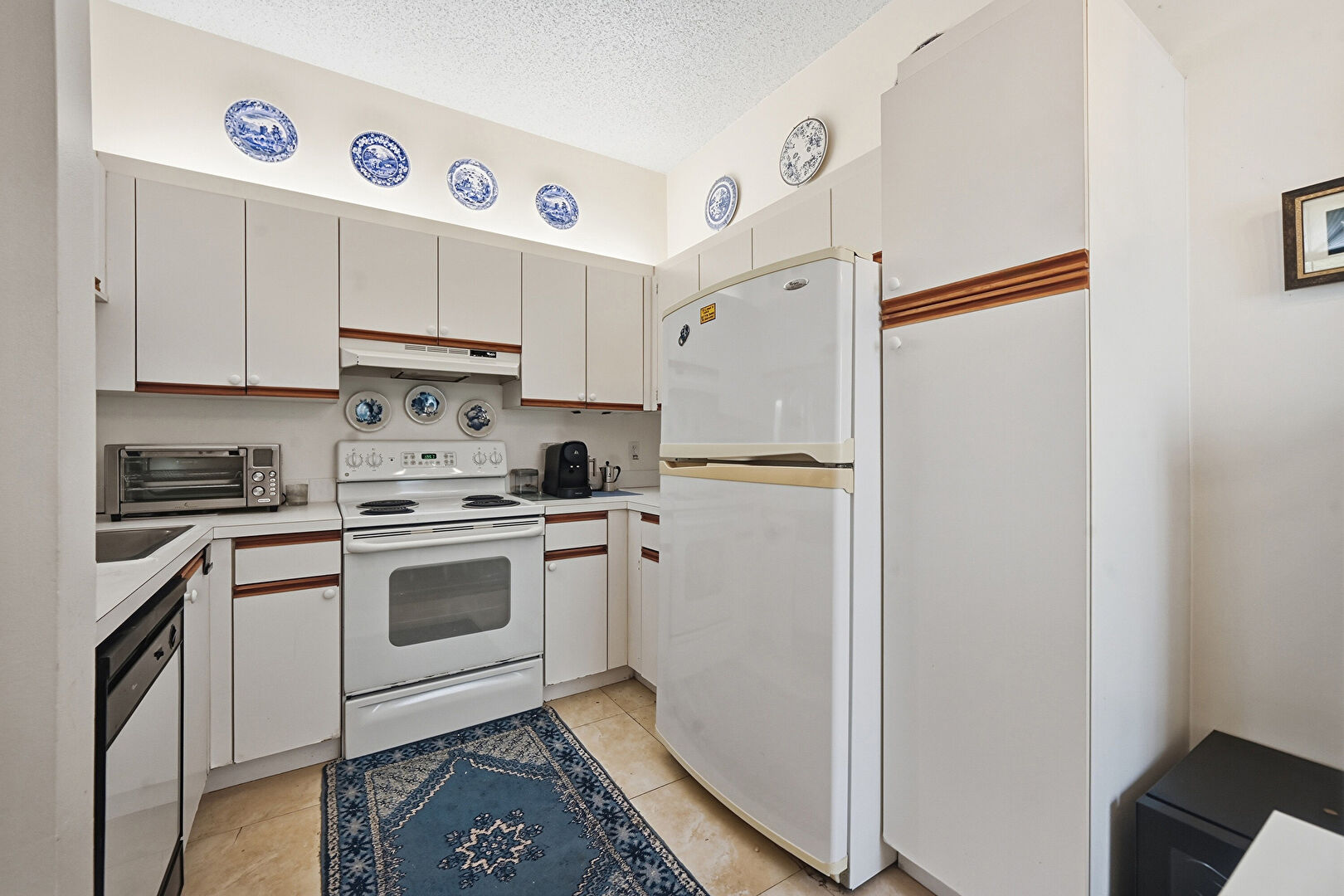 Baseboards Wall, Drywall, Kitchen Peninsula, Medium Brown Cabinets, Natural Light, Pass Through Window, Textured Ceiling, Tile Floor, Toaster, Drywall, Pass Through Window, Tile Floor