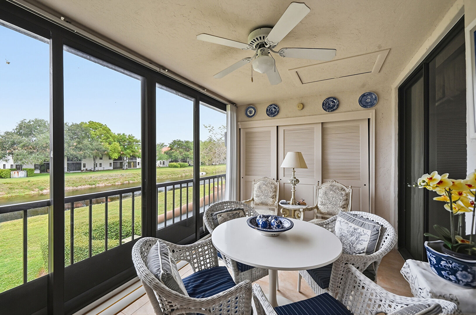 Baseboard Radiator, Ceiling Fan, Natural Light, Outdoor Dining Area, Patio, Sunroom, Textured Ceiling, Waterfront, Natural Light, Tile Floor, Water View