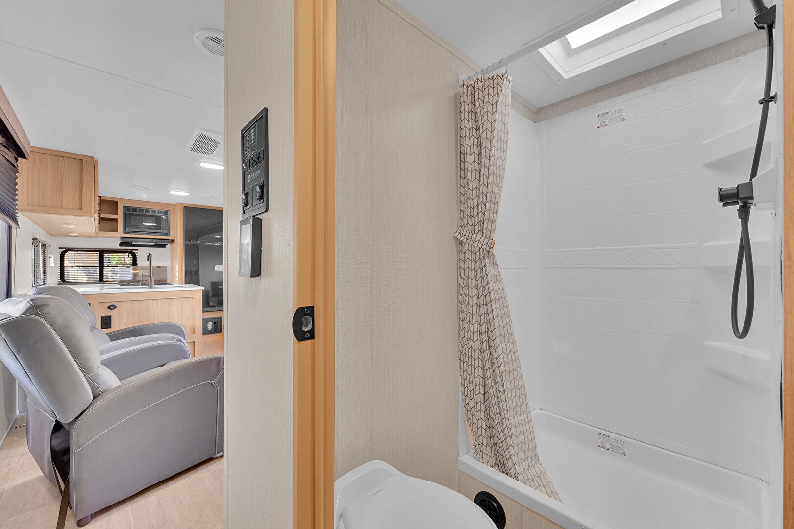 Combined Bath Shower, Full Bathroom, Natural Light, Recessed Lighting, Skylight, Vanity, Vent