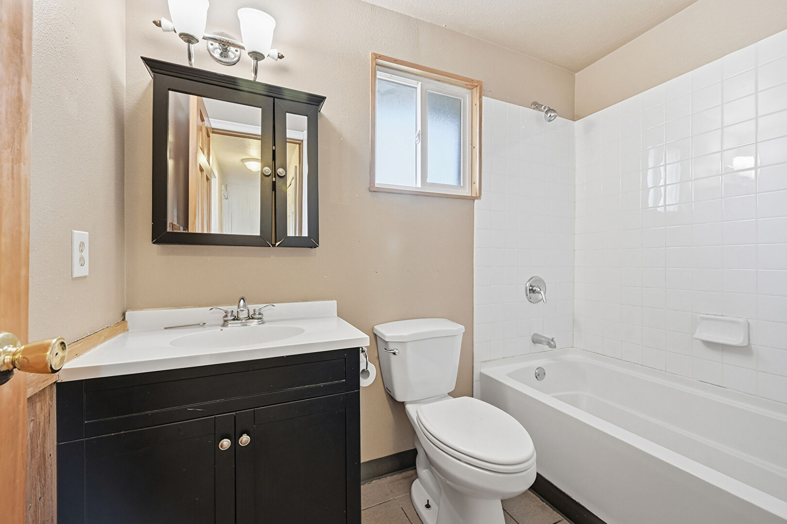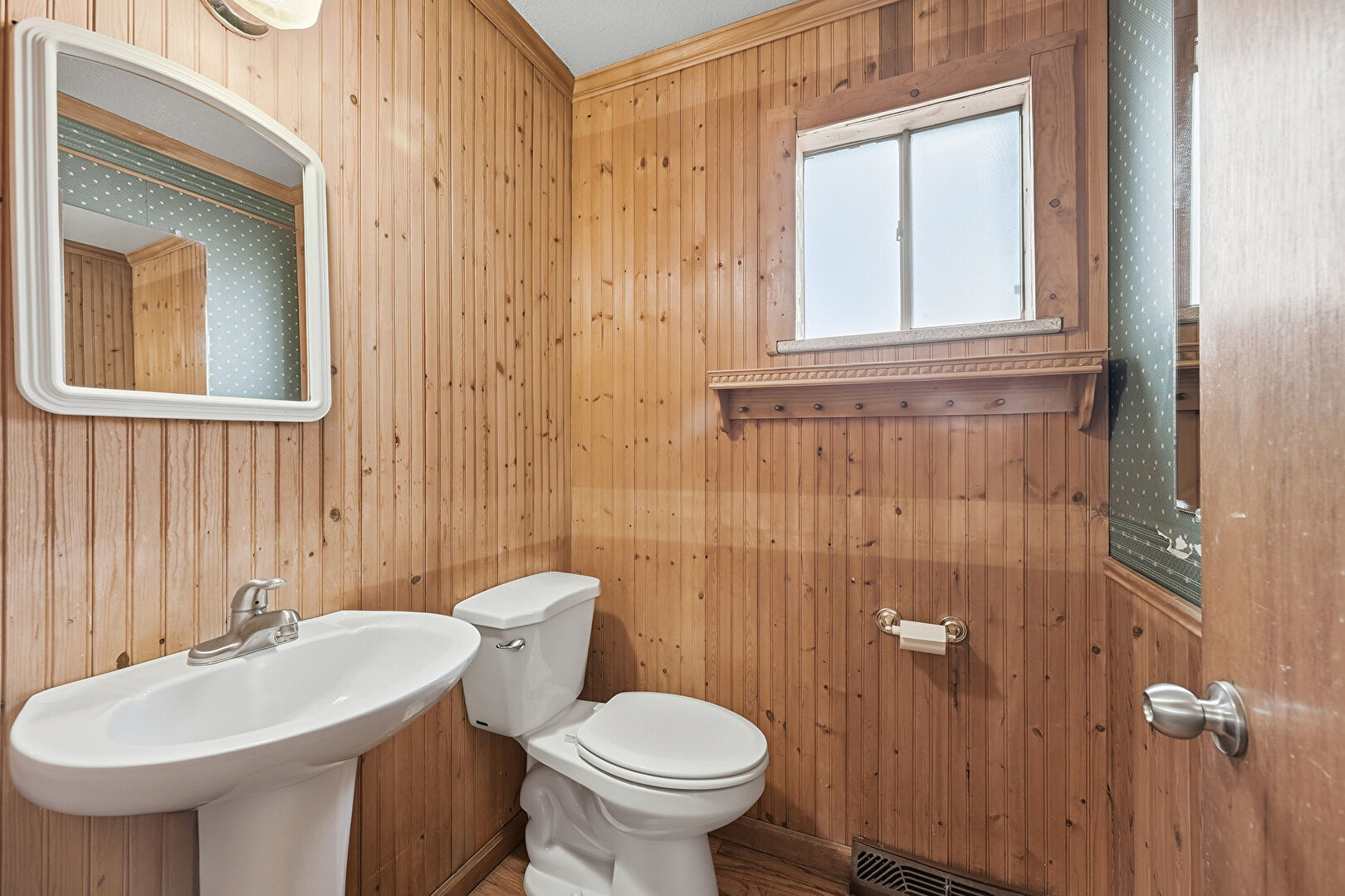 Baseboards Wall, Combined Bath Shower, Full Bathroom, Half Bathroom, Natural Light, Tile Floor, Vanity, Vent, Wood Wall, Crown Molding, Drywall