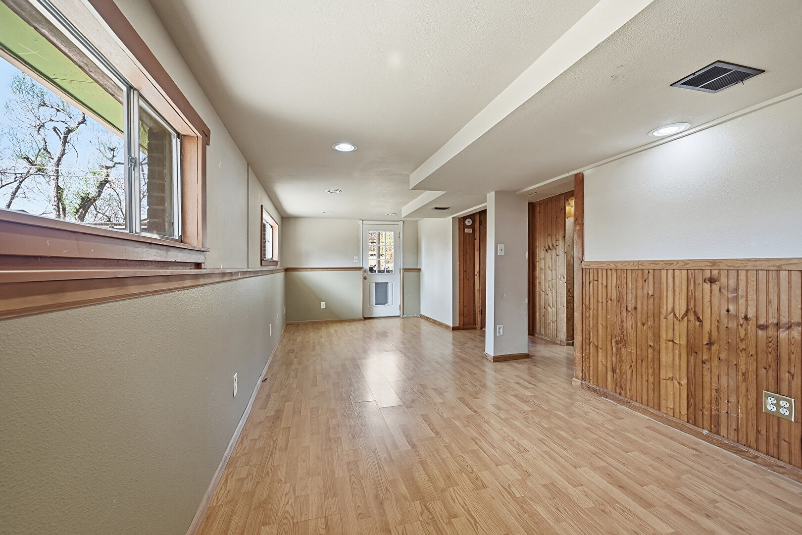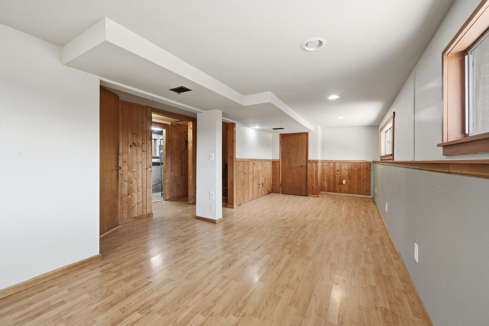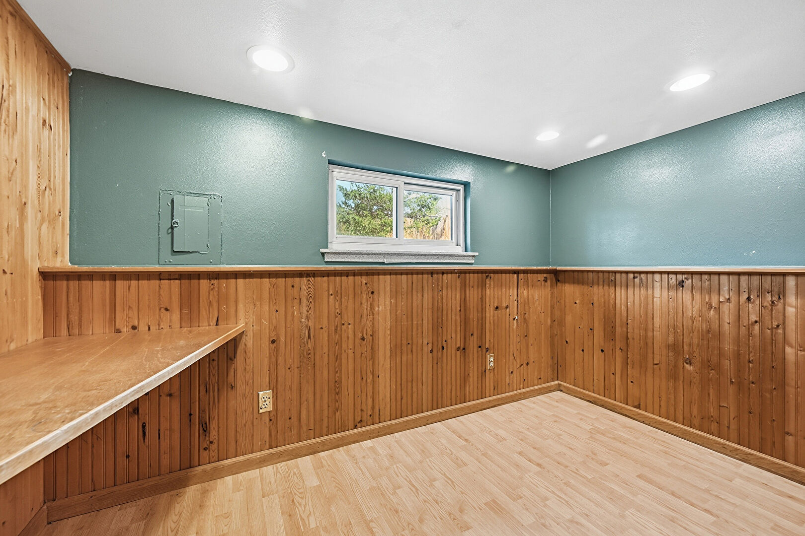 Baseboards Wall, Basement, Drywall, Natural Light, Recessed Lighting, Vent, Wainscot Wall, Wood Finish Floor, Wood Wall, Drywall, Wood Wall