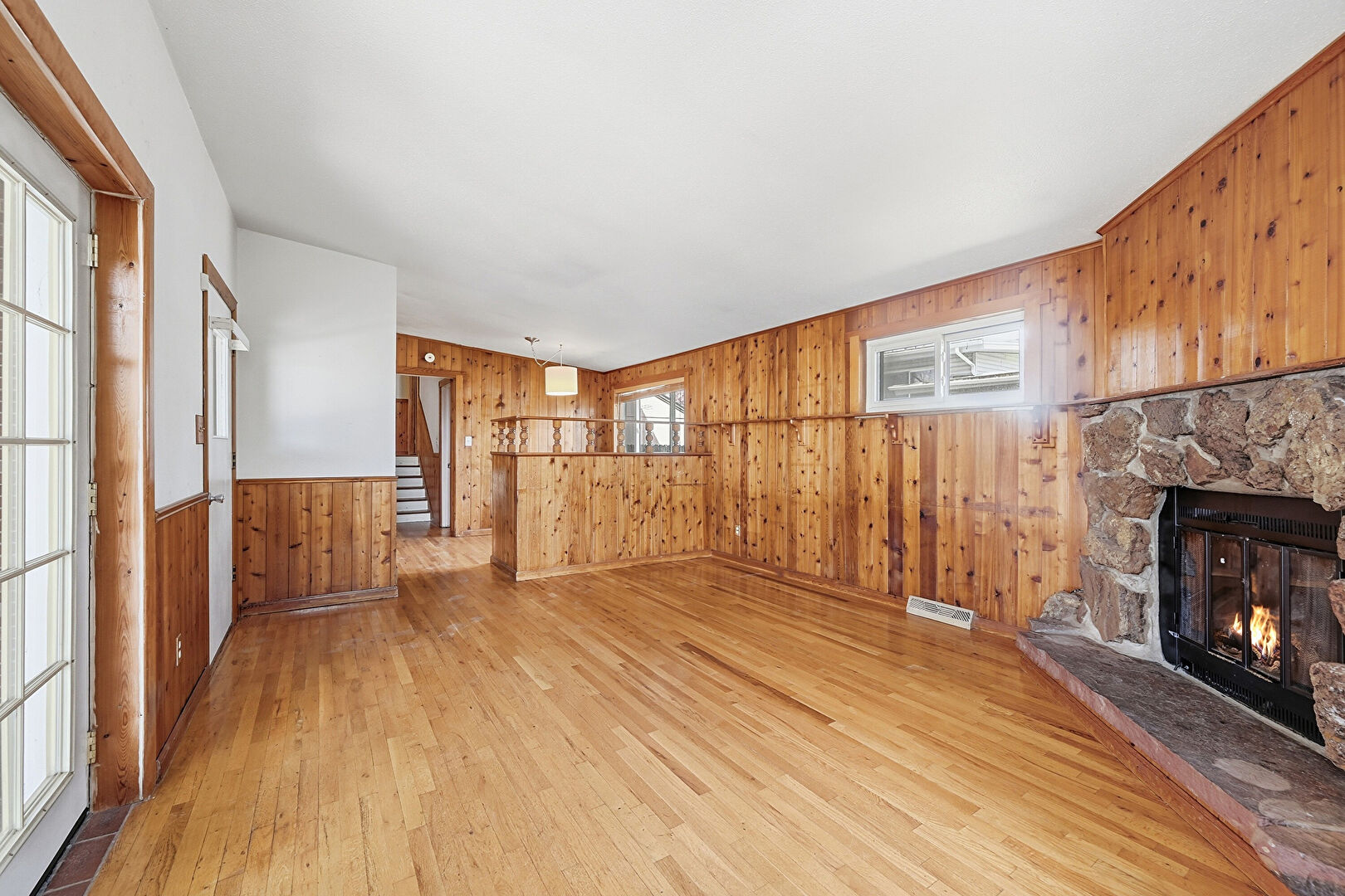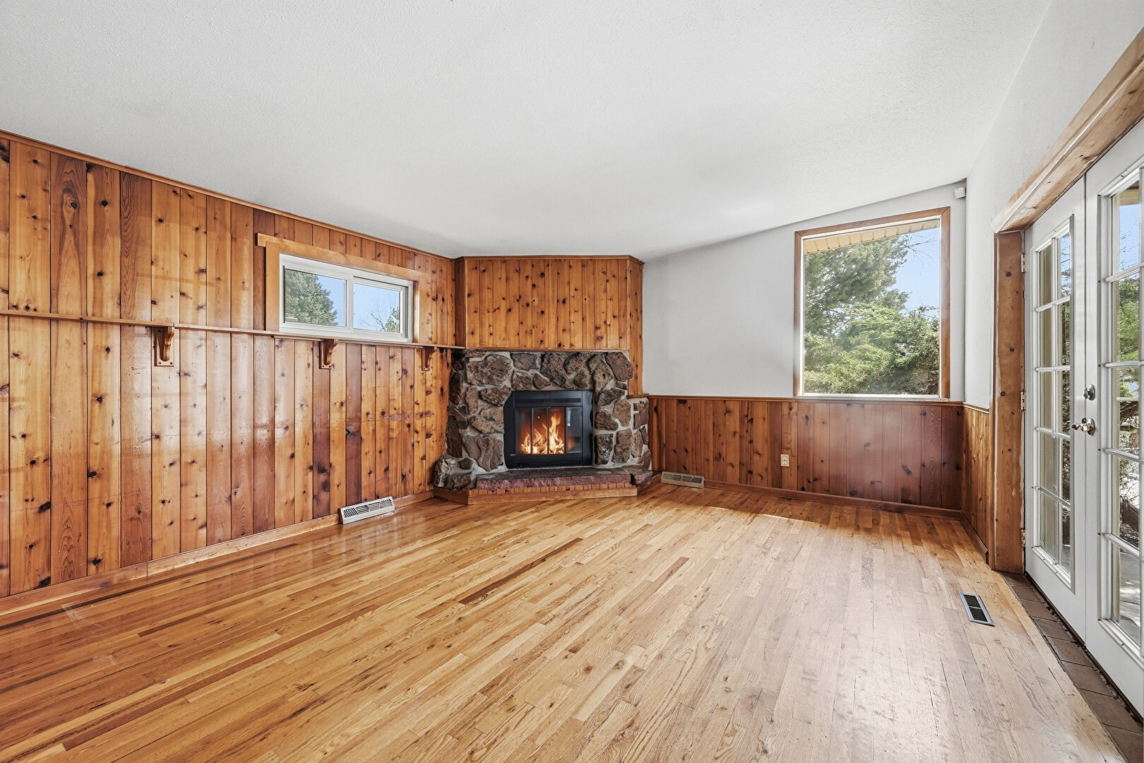 Drywall, Fireplace, Natural Light, Stairs, Wainscot Wall, Wood Finish Floor, Wood Wall, Vent