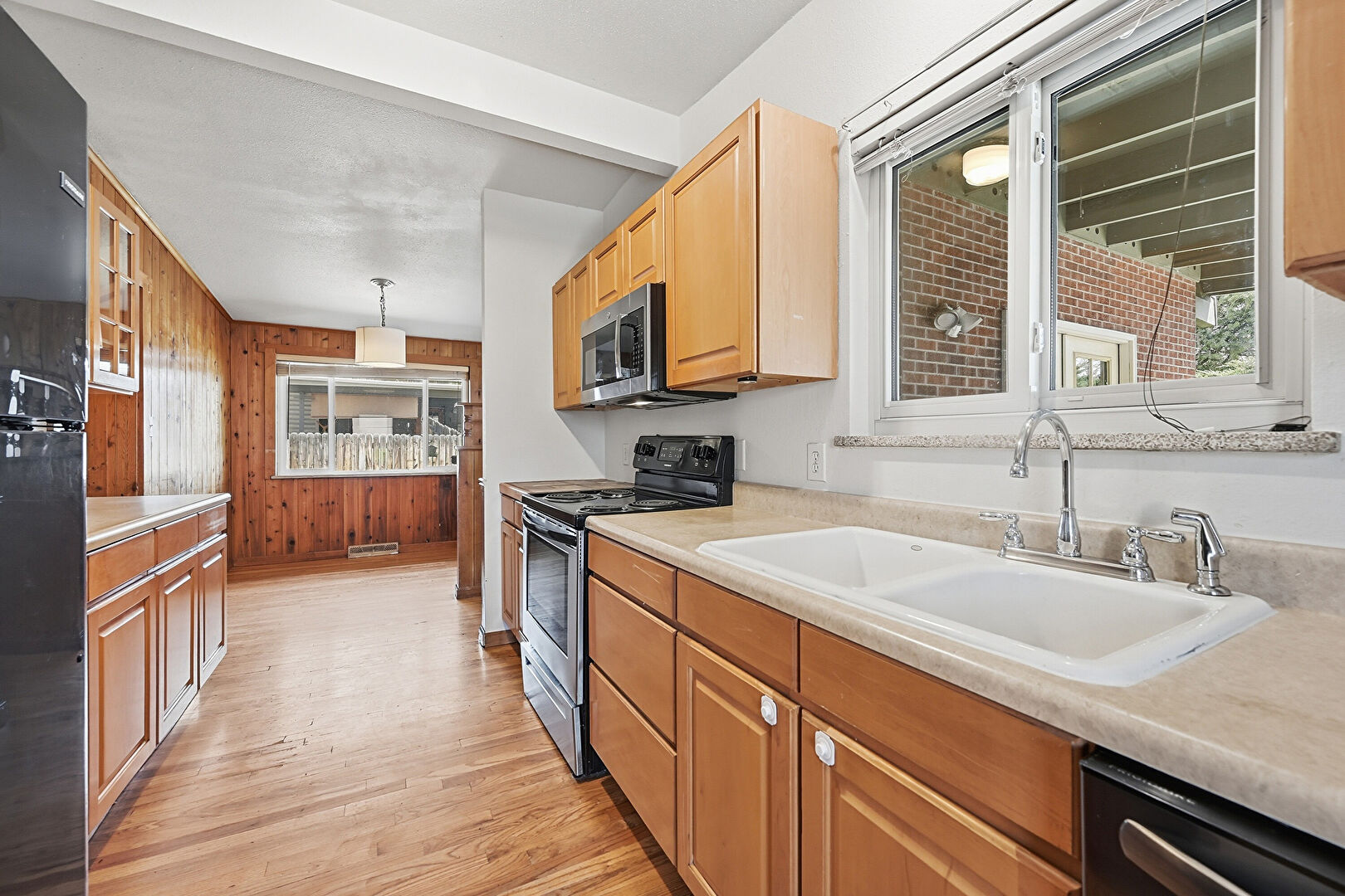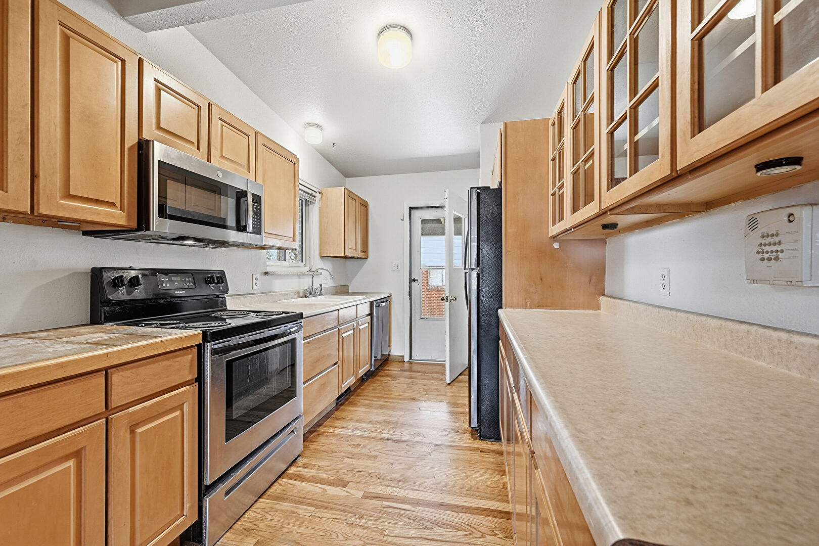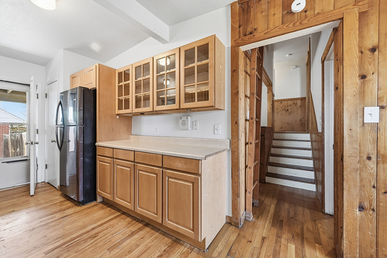 Baseboards Wall, Drywall, Glass Insert Cabinets, Medium Brown Cabinets, Natural Light, Raised Cabinets, Smoke Carbon Monoxide Detector, Tile Countertops, Vaulted Ceiling, Wood Finish Floor, Wood Wall, Beamed Ceiling, Glass Insert Cabinets, Pendant Lighting