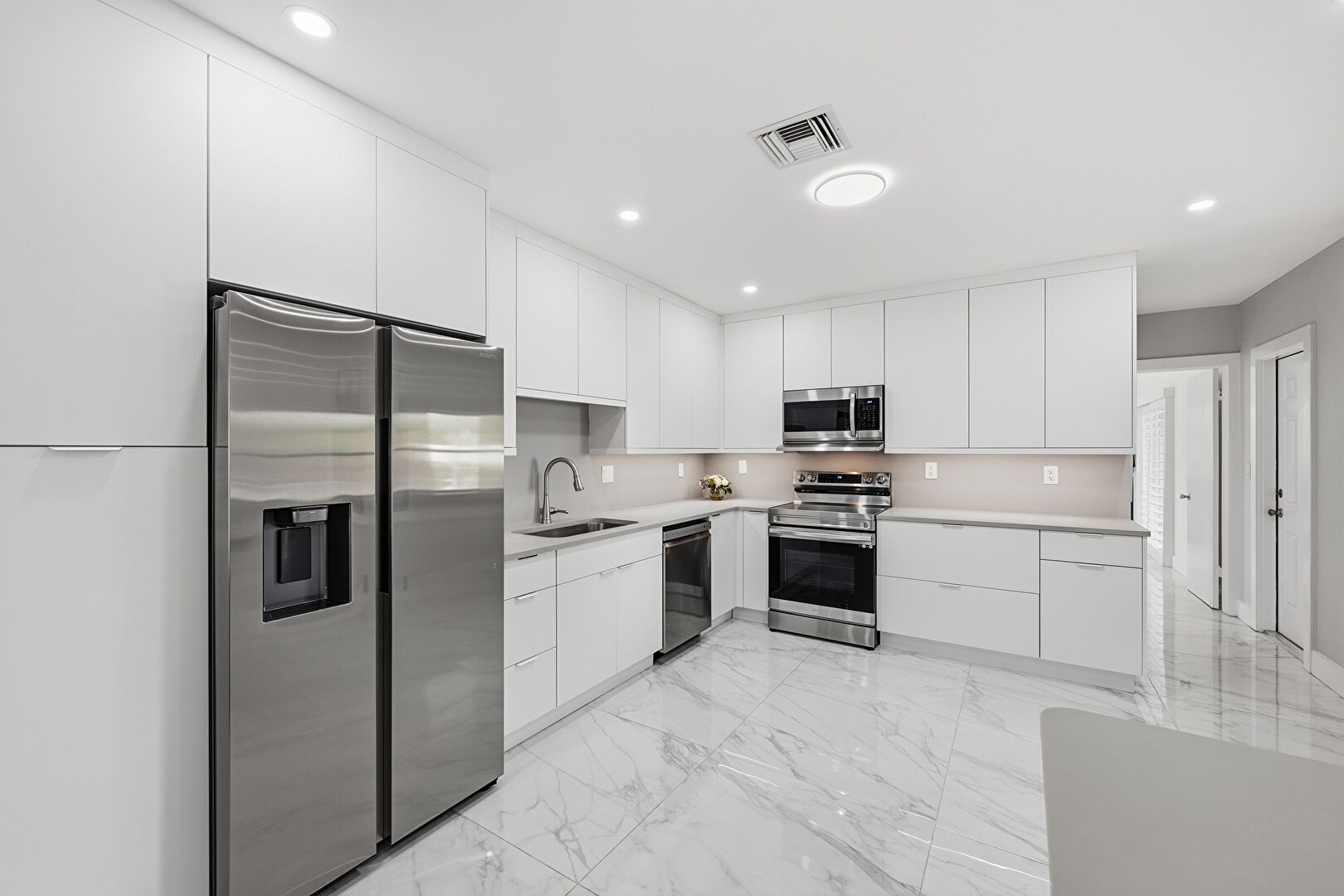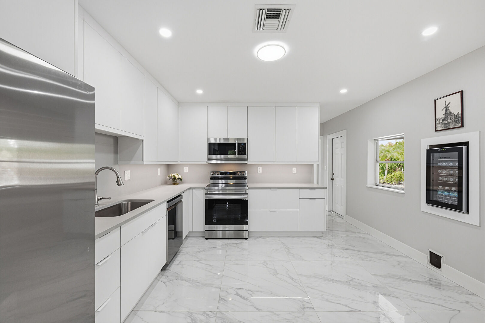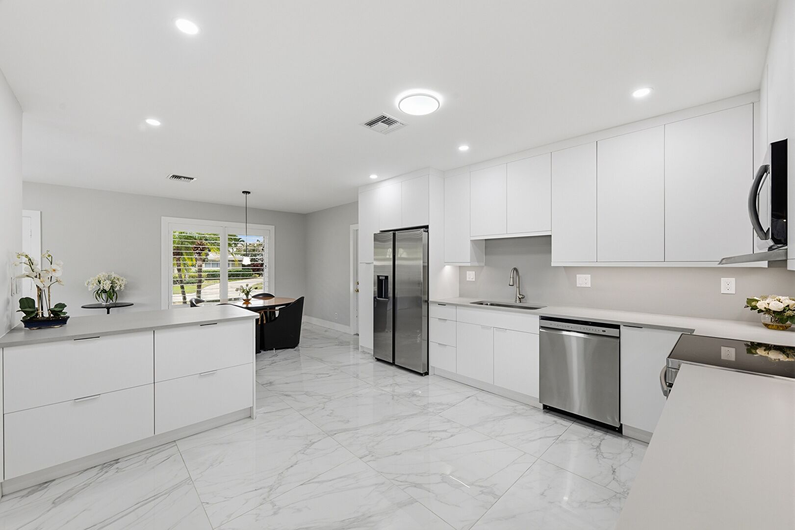 Baseboards Wall, Drywall, Flat Panel Cabinets, Kitchen Bar, Kitchen Peninsula, L Shaped Kitchen, Marble Finish Floor, Natural Light, Opens To Living Area, Pendant Lighting, Recessed Lighting, Stone Countertops, Vent, Baseboards Wall, Kitchen Bar, Vent